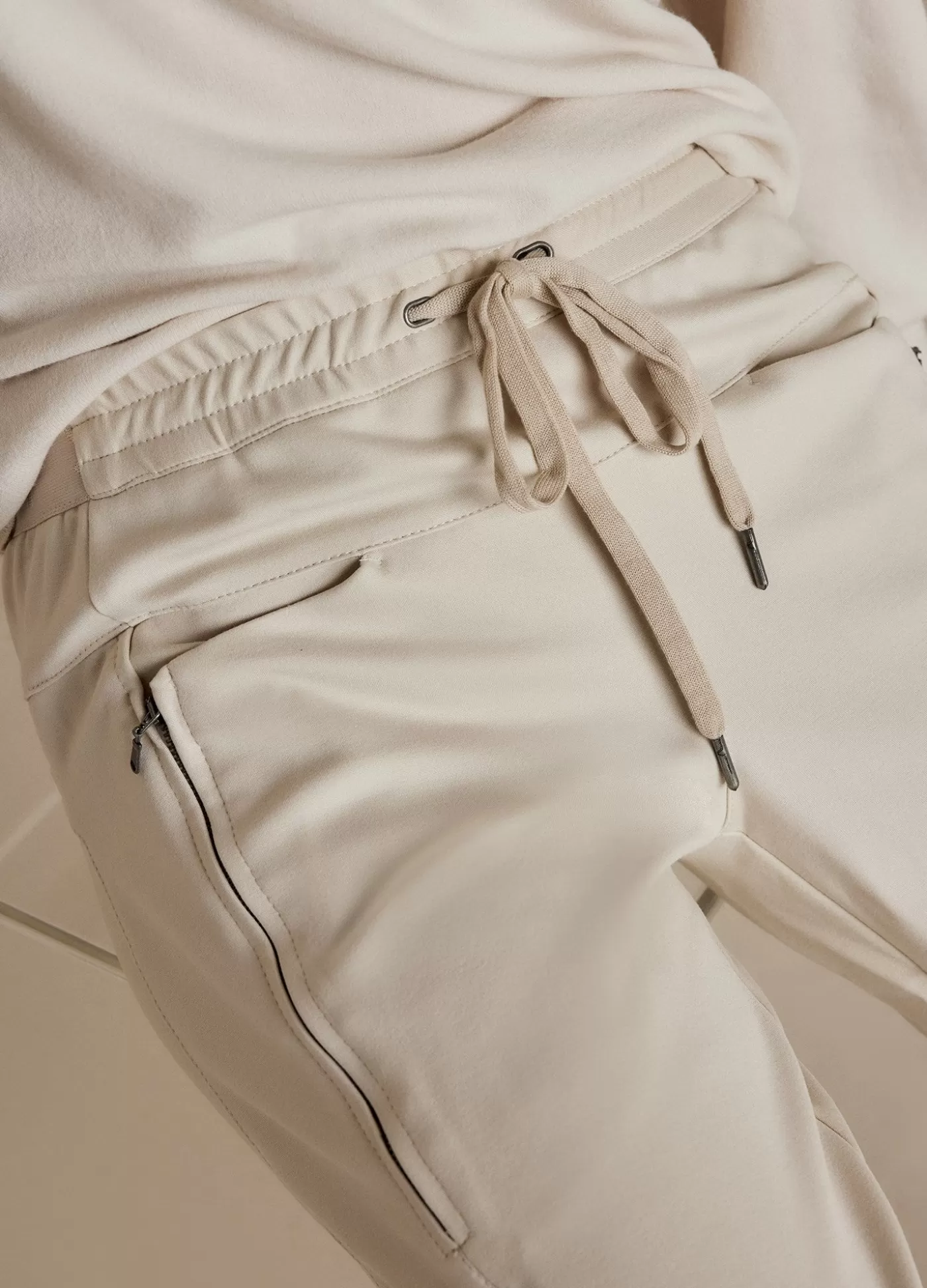 Een smal toelopende, sportieve punto milano broek met elastiek met Summum logo aan de achterkant en een trekkoord in de tailleband voor. De broek heeft een dynamisch lijnenspel aan stiksels en deelnaden, liggende steekzakken, er zitten ritsen in de zakken voor een speels effect voor en strookzakken achter.
