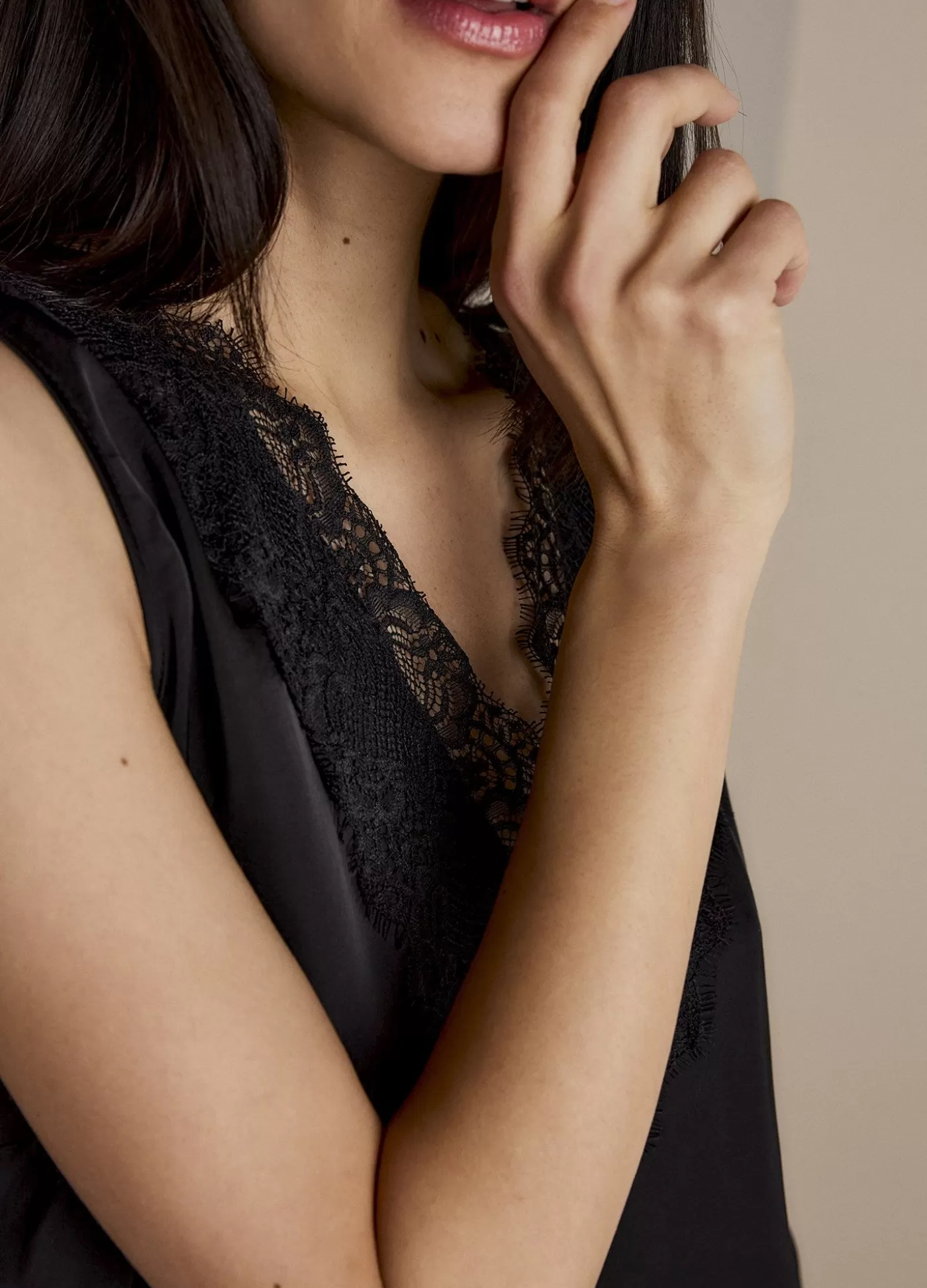 Een losvallende, mouwloze satijnen top met een V-hals voor, afgezet met een brede strook fijn kant.