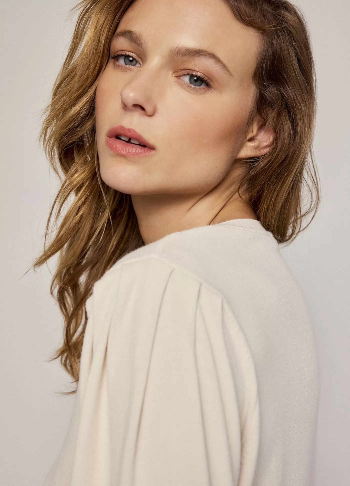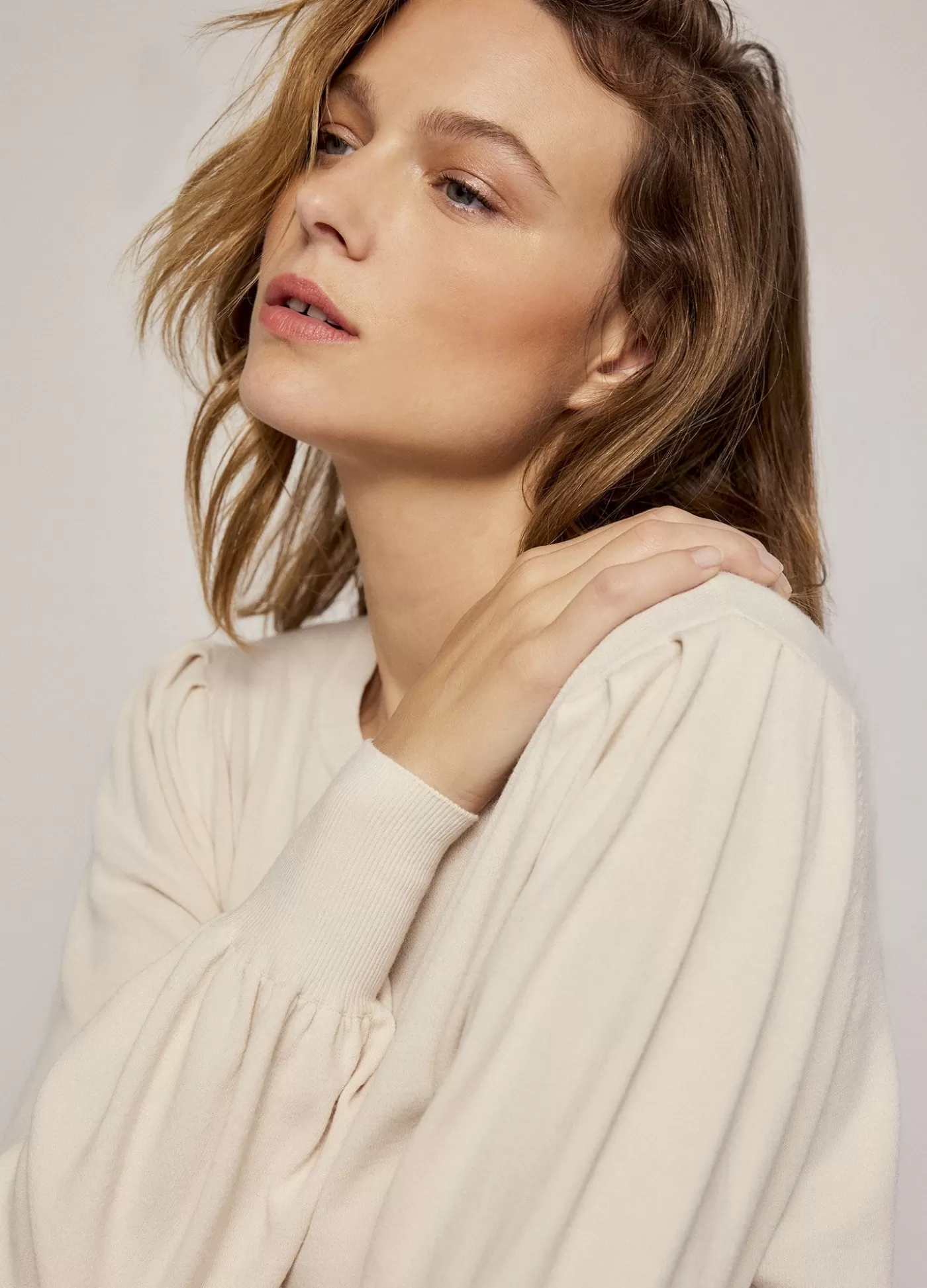 Een oversized trui met een ronde open hals, lange mouwen met plooitjes voor pofeffect en hoge manchetten.Stijlvol en comfortabel… dat is deze trui met pofmouw. Een basic, die eigenlijk te mooi is om basic te noemen. Want de combinatie van zachte viscose en lichte pofmouwtjes geeft deze ‘simpele’ trui een tijdloze en eigenzinnige uitstraling.