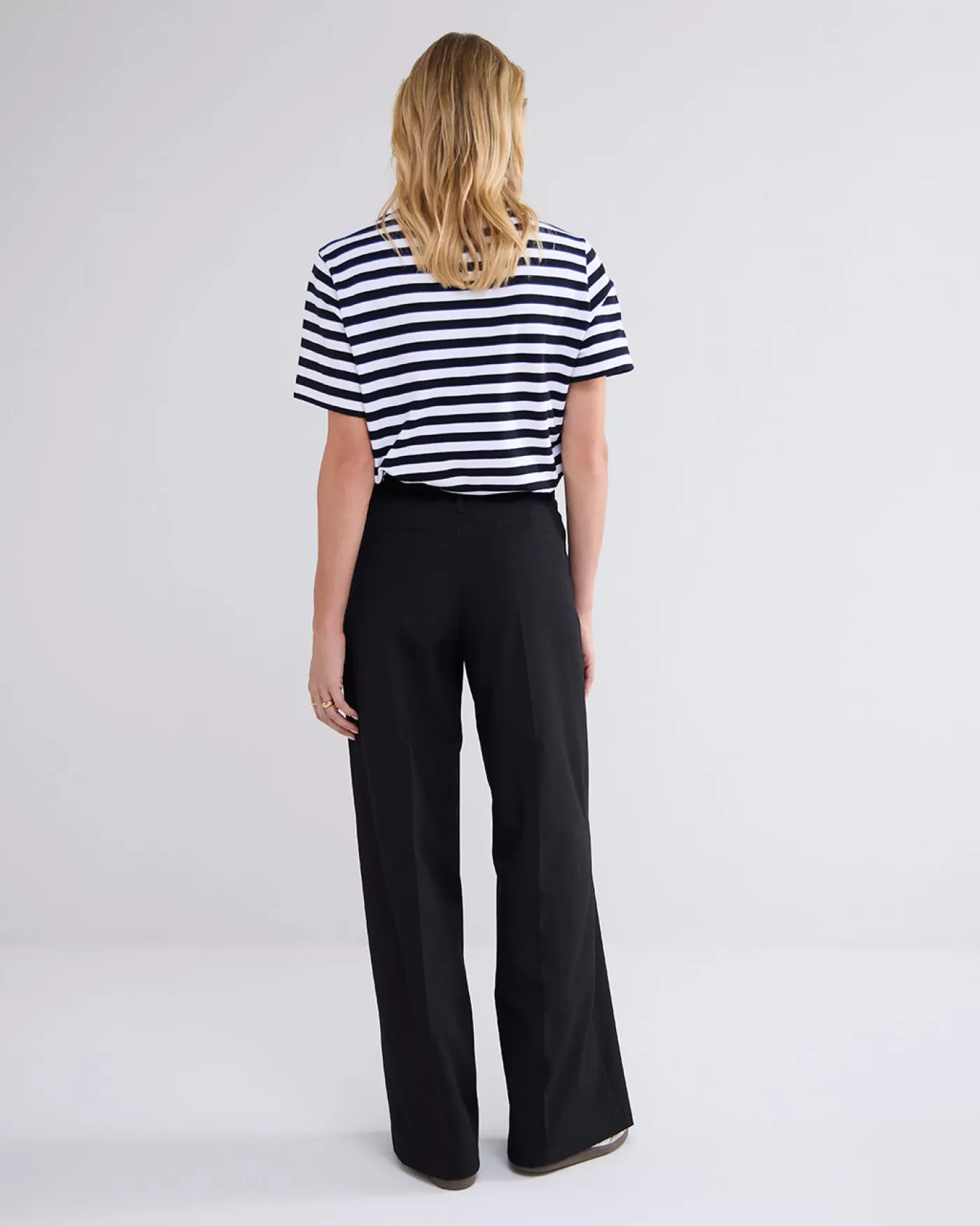 Soepelvallende broek met wijde pijpen en elastische tailleband achter. De broek heeft steekzakken voor en strookzakken achter. wijde pijpen elastische tailleband steekzakken voor strookzakken achter