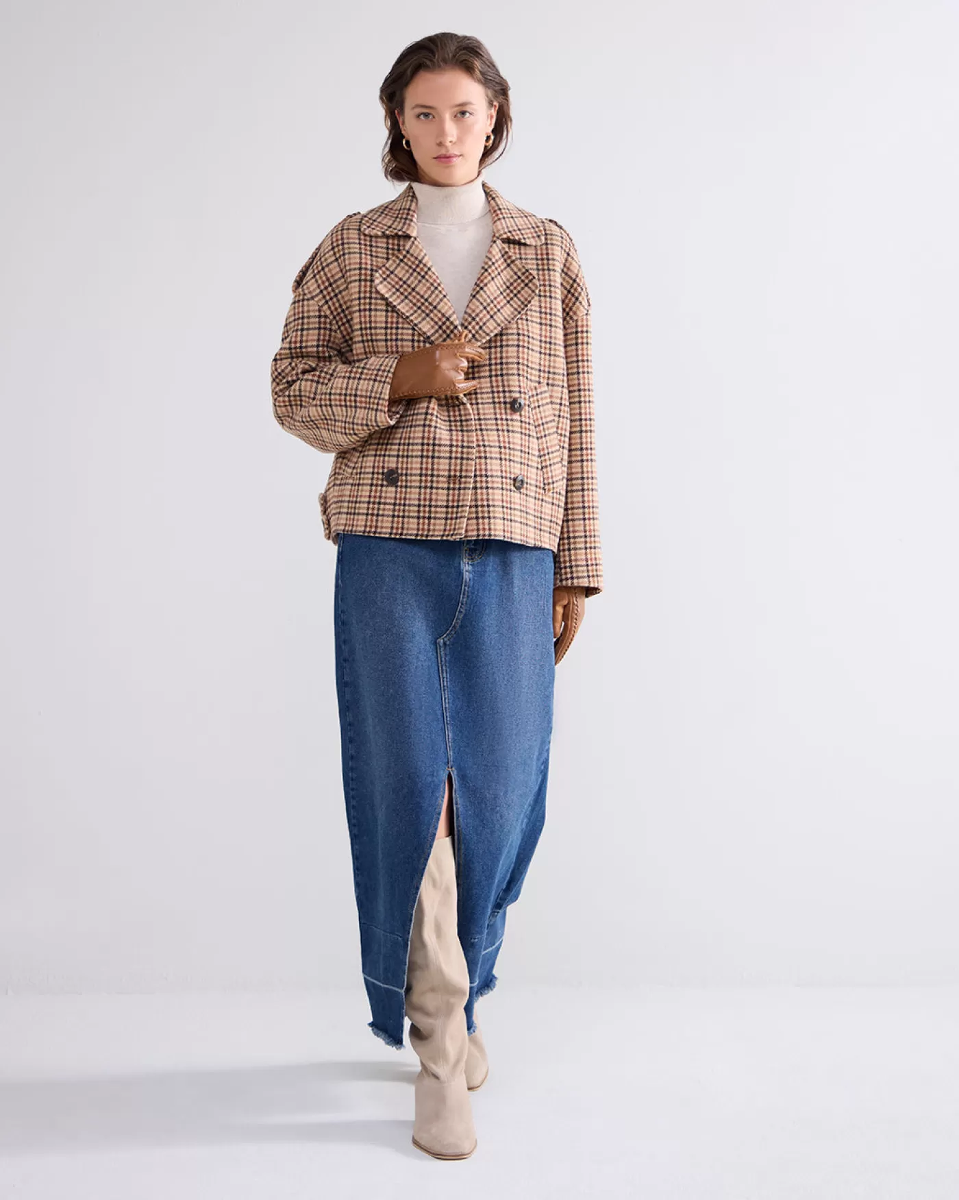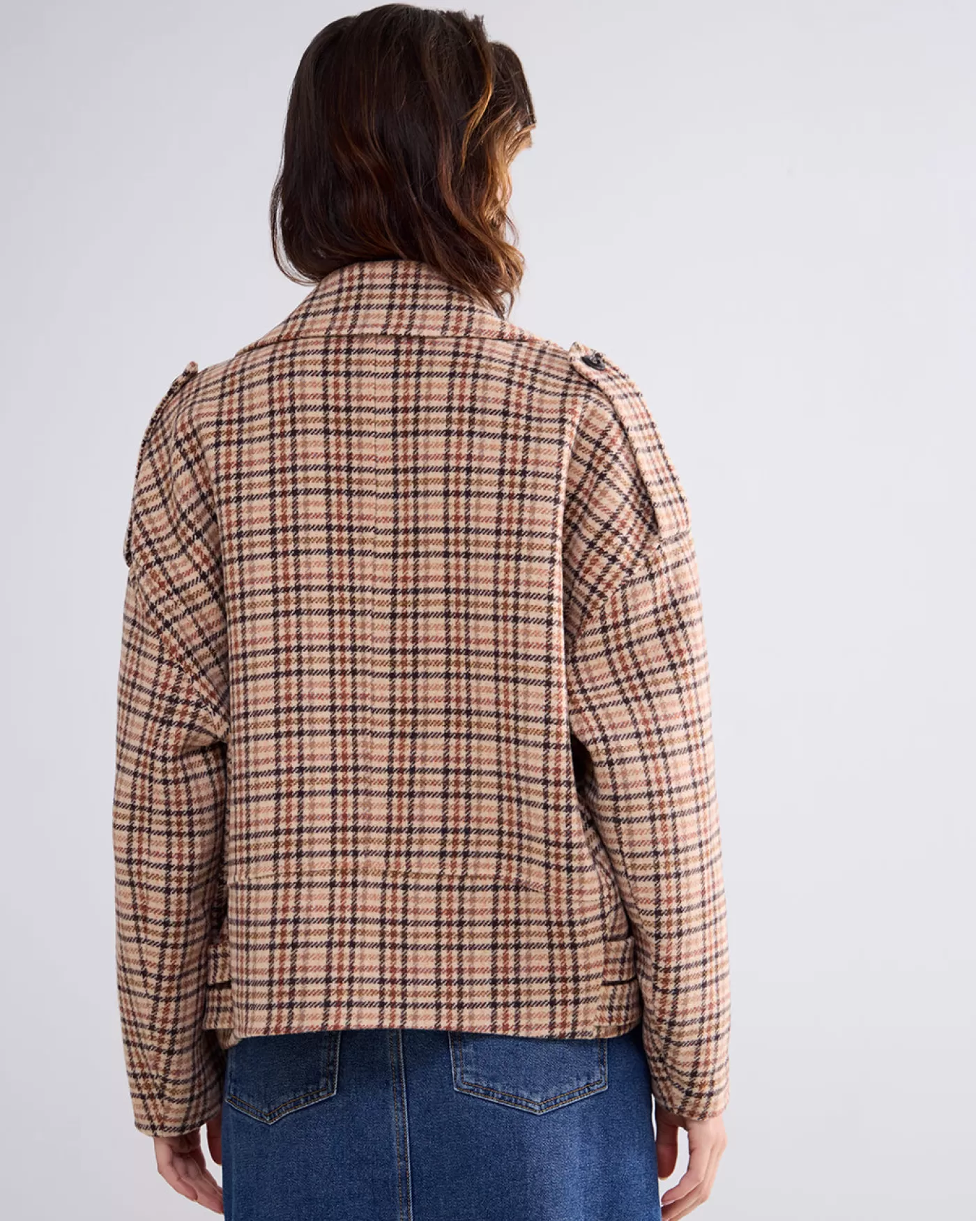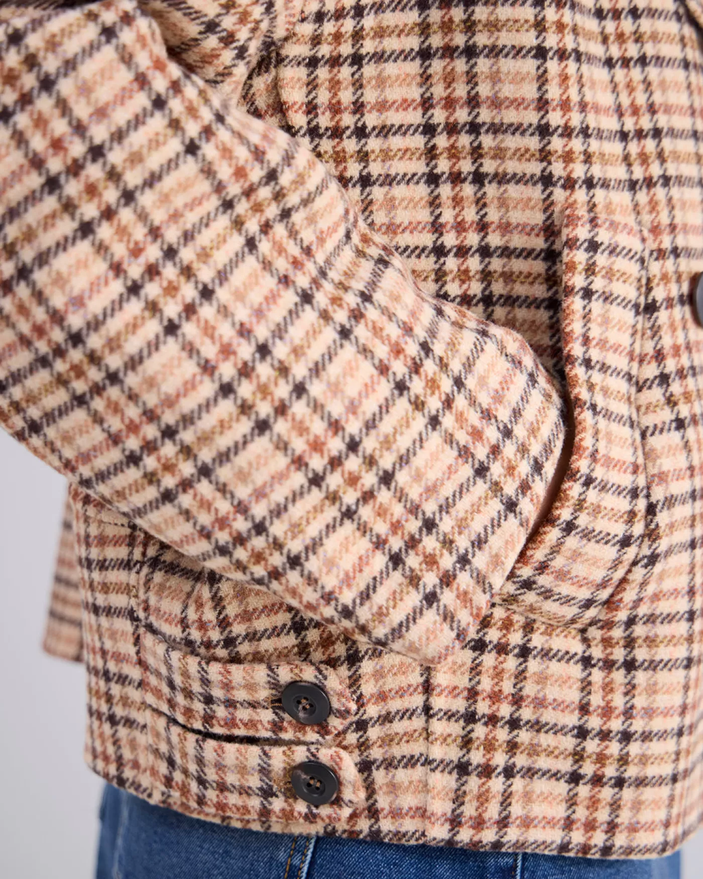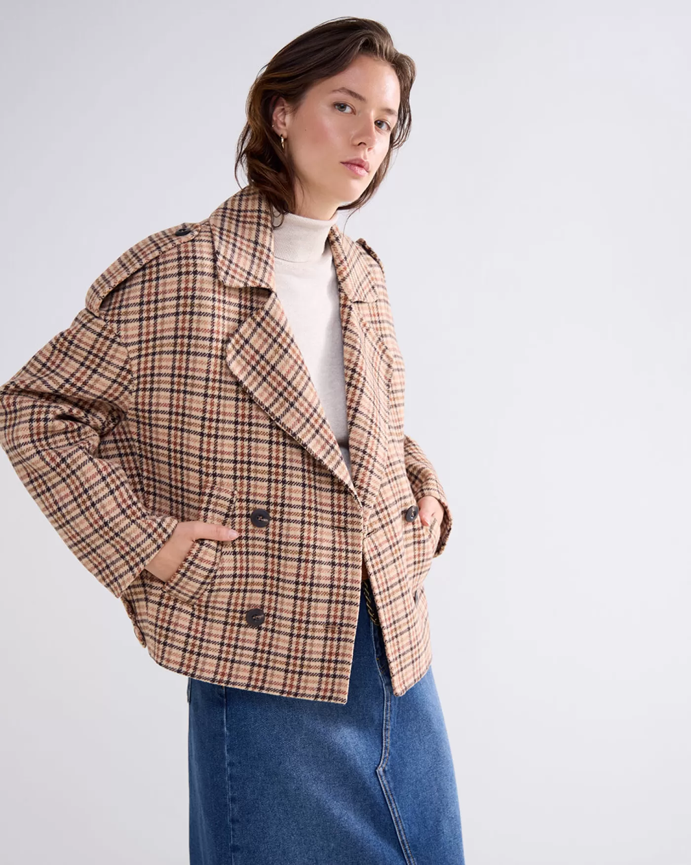 Kort wollen jasje met ruitjespatroon. Het jasje heeft een brede reverskraag en een dubbele rij knopen. korte fit geweven wol dubbele rij knopen paspelzakken