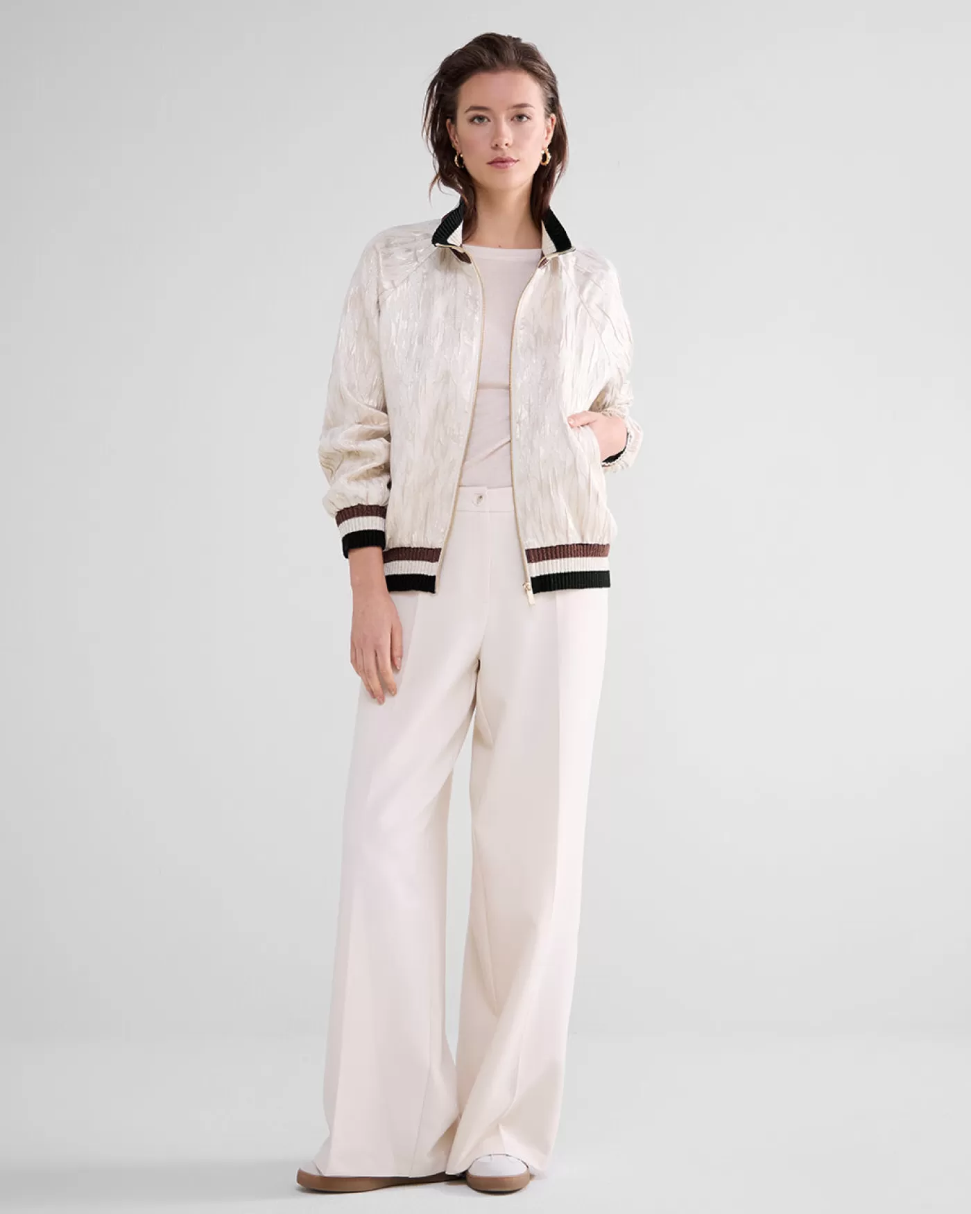 Jacquard bomberjas met voelbare structuur. De jas heeft contrasterend gestreepte ribboorden en schuine strookzakken.voel…