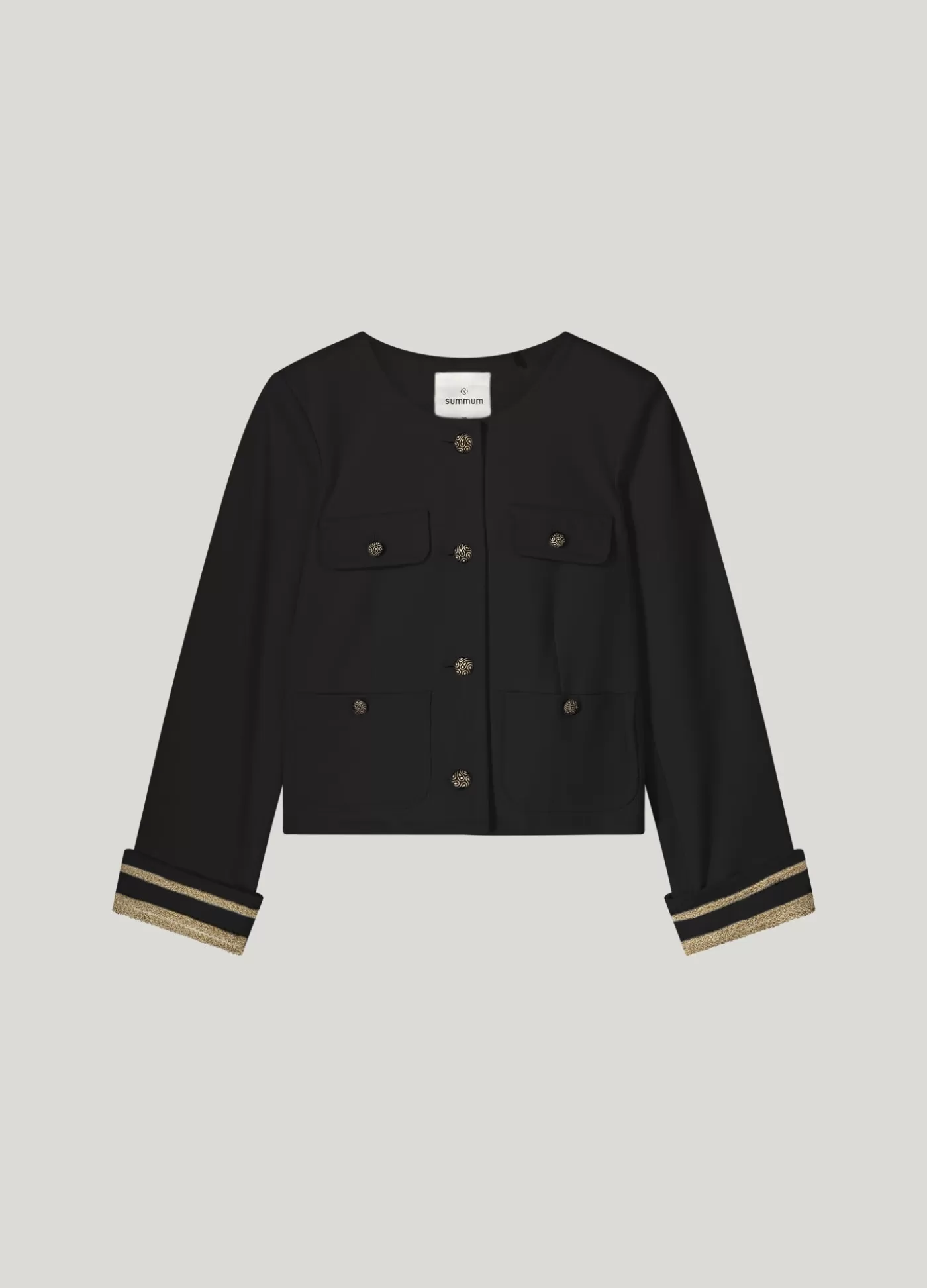 Jasje met ronde hals en gouden accenten in de knopen en manchetten. Het jasje heeft een ronde hals, rechte snit en decor…