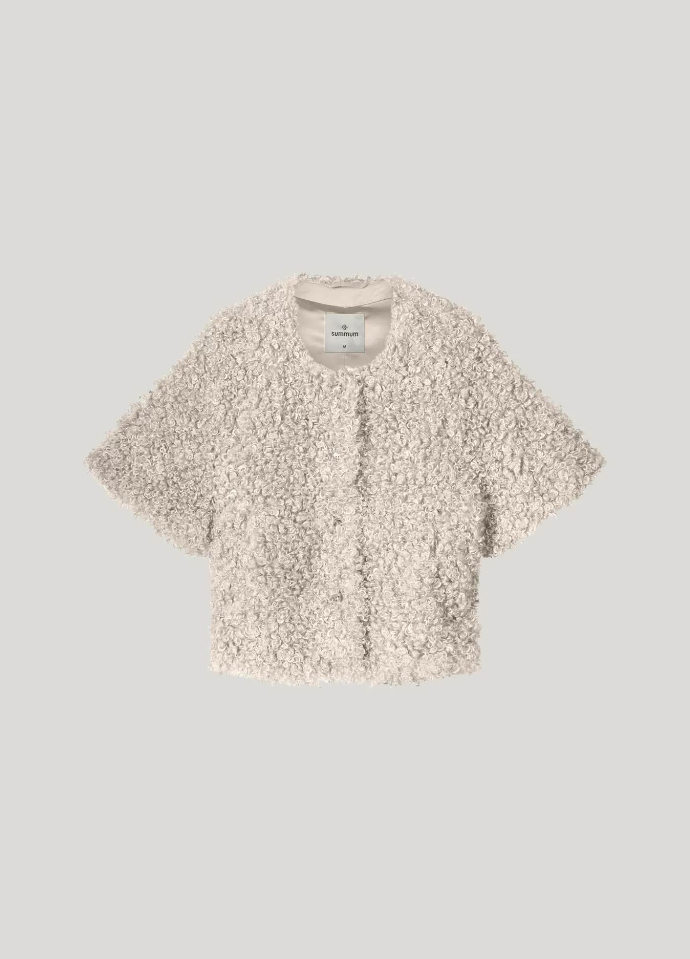 Kort veganistisch bontjasje van zacht, krullige nep bont, met revers kraag en 3/4 mouwtjes. Het jasje heeft een knoopsl…