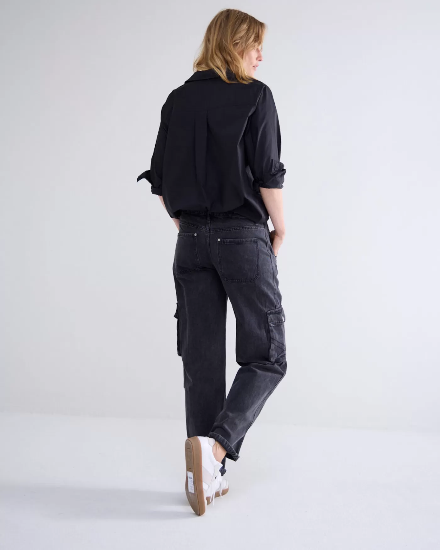Cargojeans met mid/low waist en baggy toelopende pijpen. De jeans is gemaakt van soepele stretch denim. Op de zijkant zijn zakken en sierstiksels aangebracht. loose fit stretchdenim knoopsluiting cargo stijl