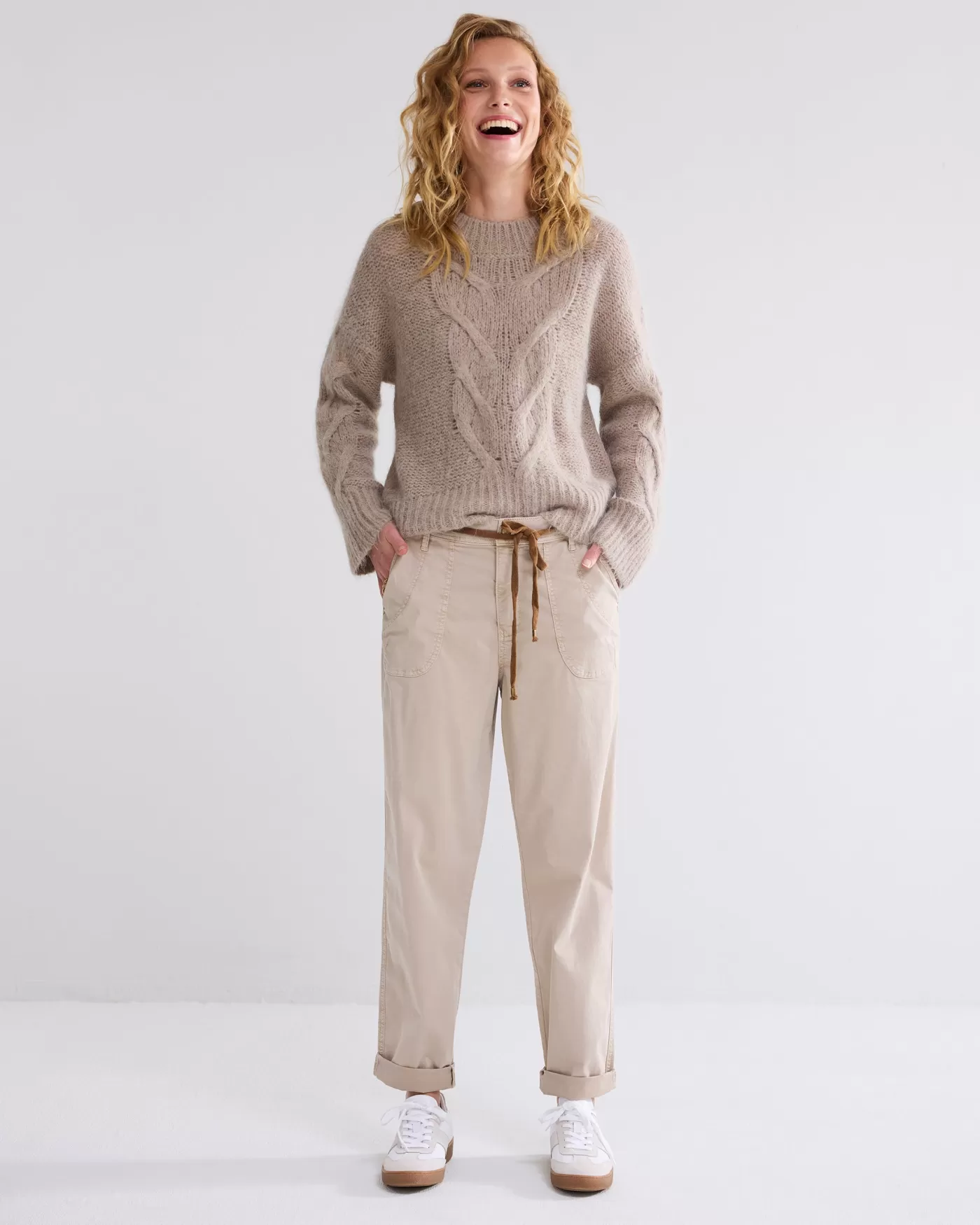 Broek met smalle pijpen en een koordsluiting in de taille. De broek heeft grote opgestikte steekzakken op het voorpand e…