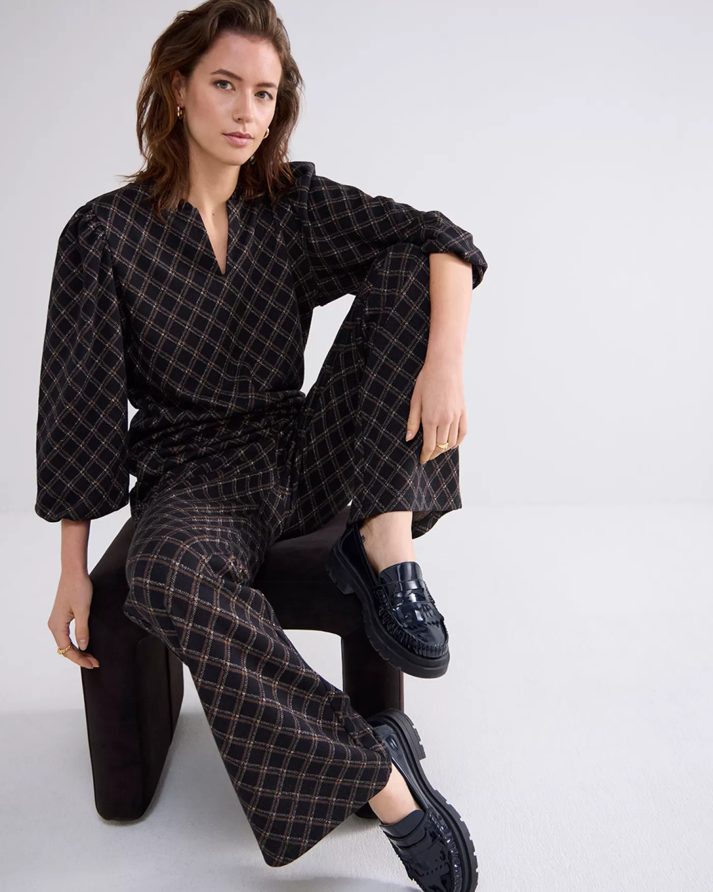 Broek met iets wijduitlopende pijpen gemaakt van een compacte jacquard stof in ruitjesdessin. De broek heeft een hoge taille met elastische tailleband en steekzakken aan de zijkant. Binnenbeenlengte is circa 82cm voor alle maten. iets wijde pijpen steekzakken elastische tailleband ruitdessin jacquard stof