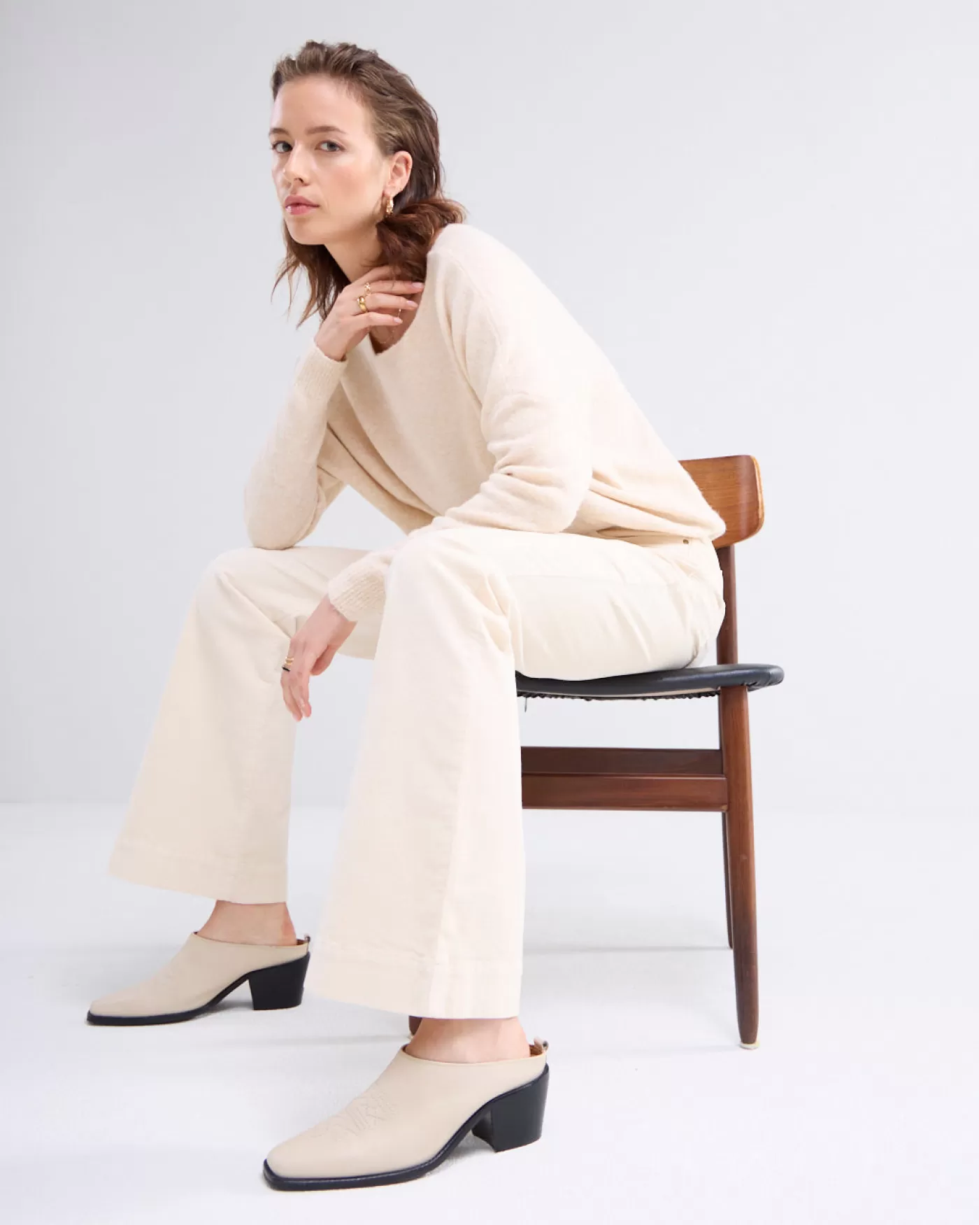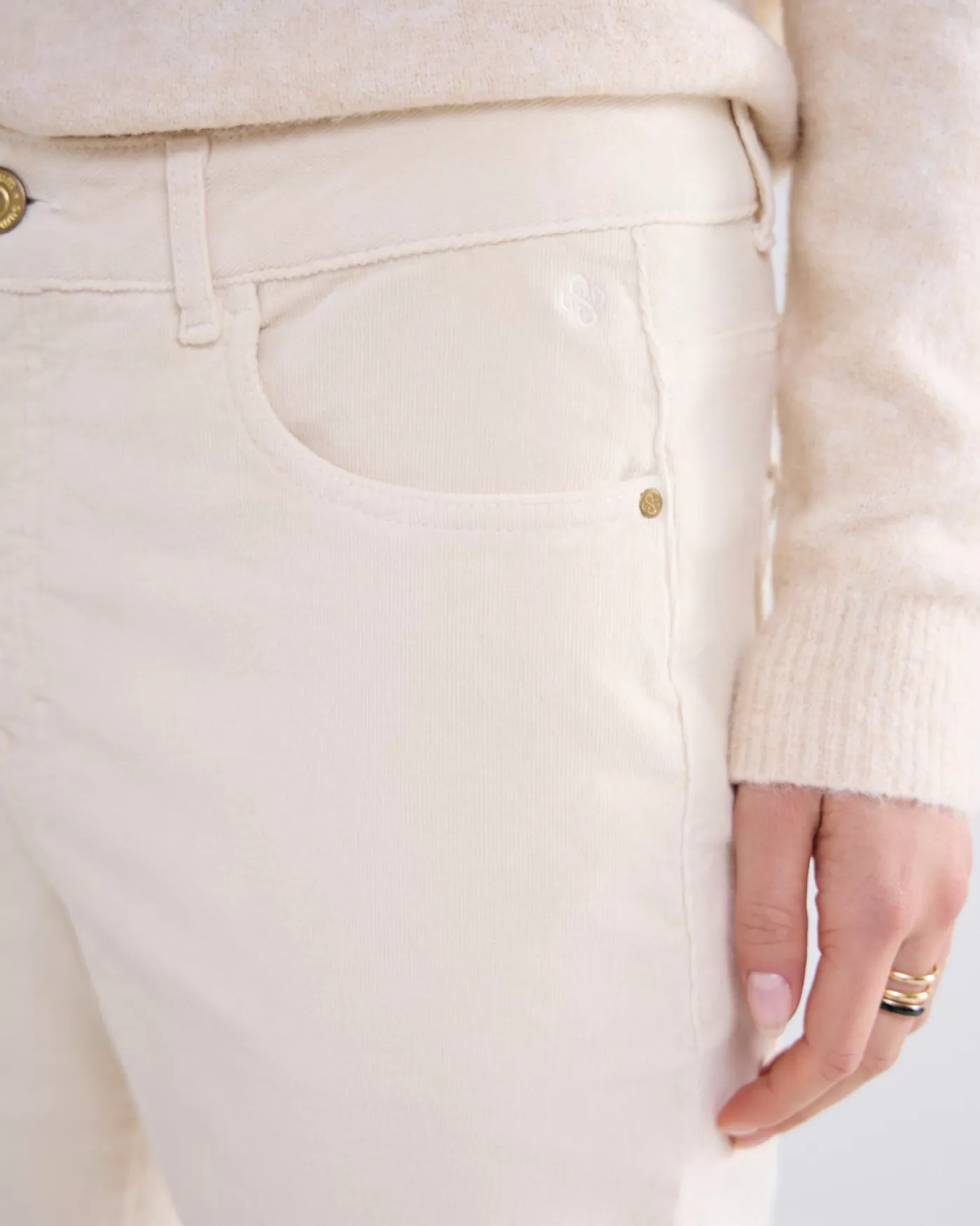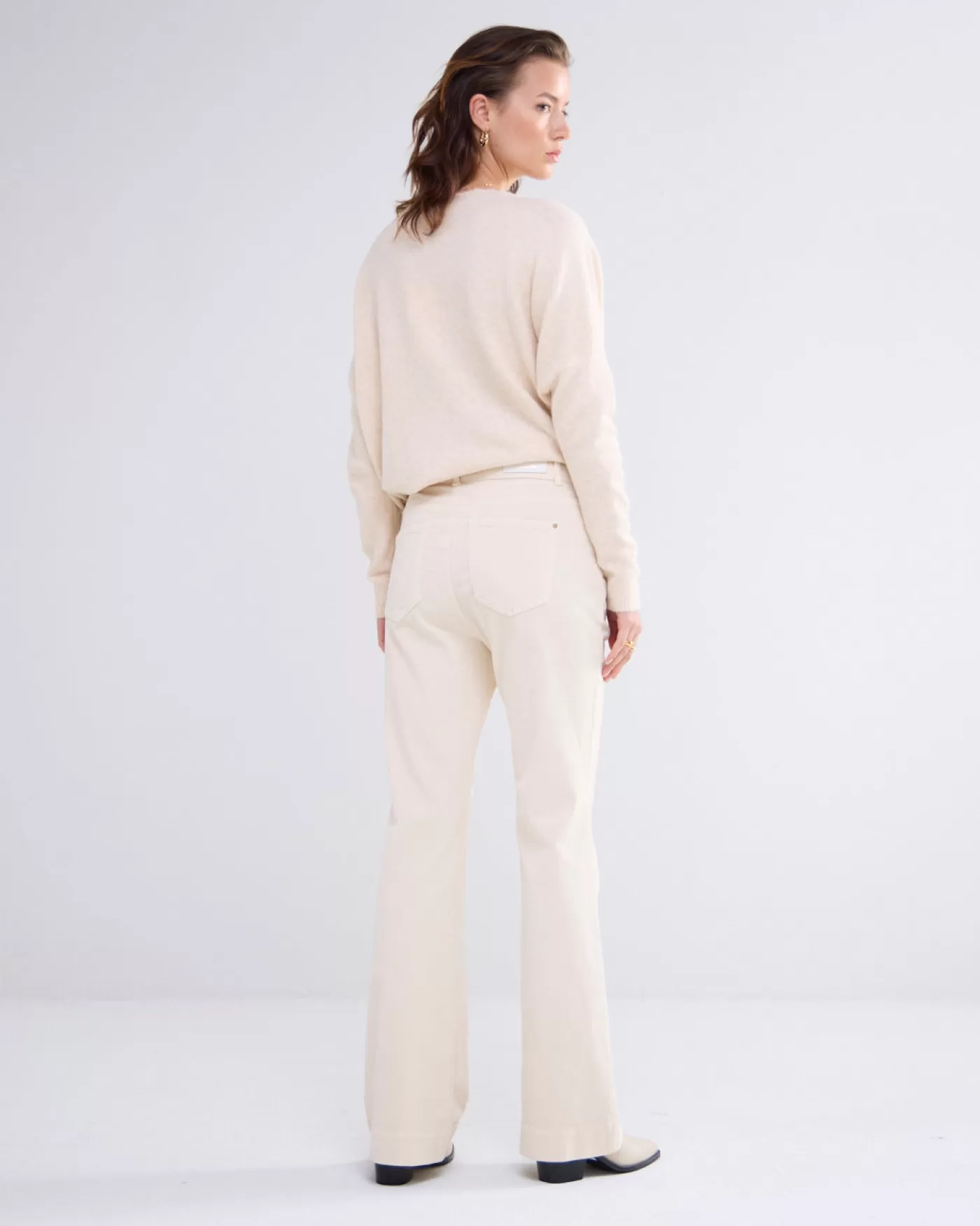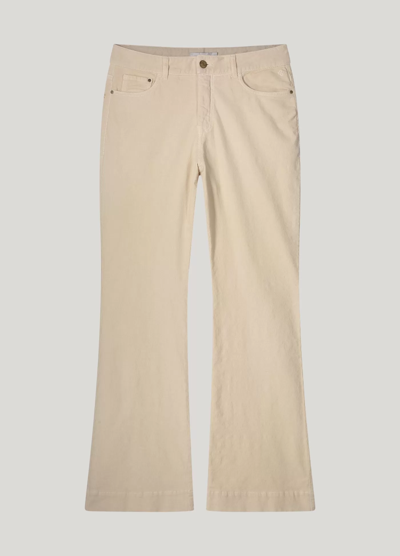 Lichte flared broek met een mid-high waist. De broek heeft steek- en strookzakken en een gulp met rits. flared midhigh waist strookzakken gulp met rits
