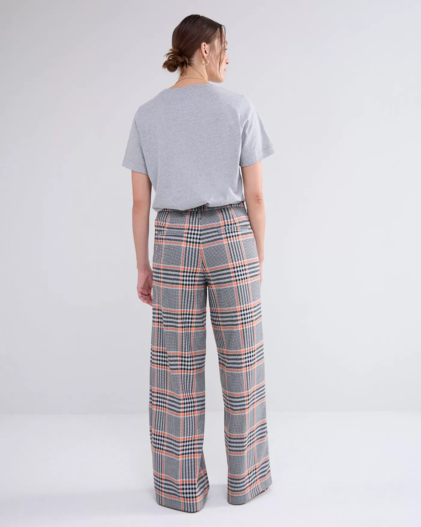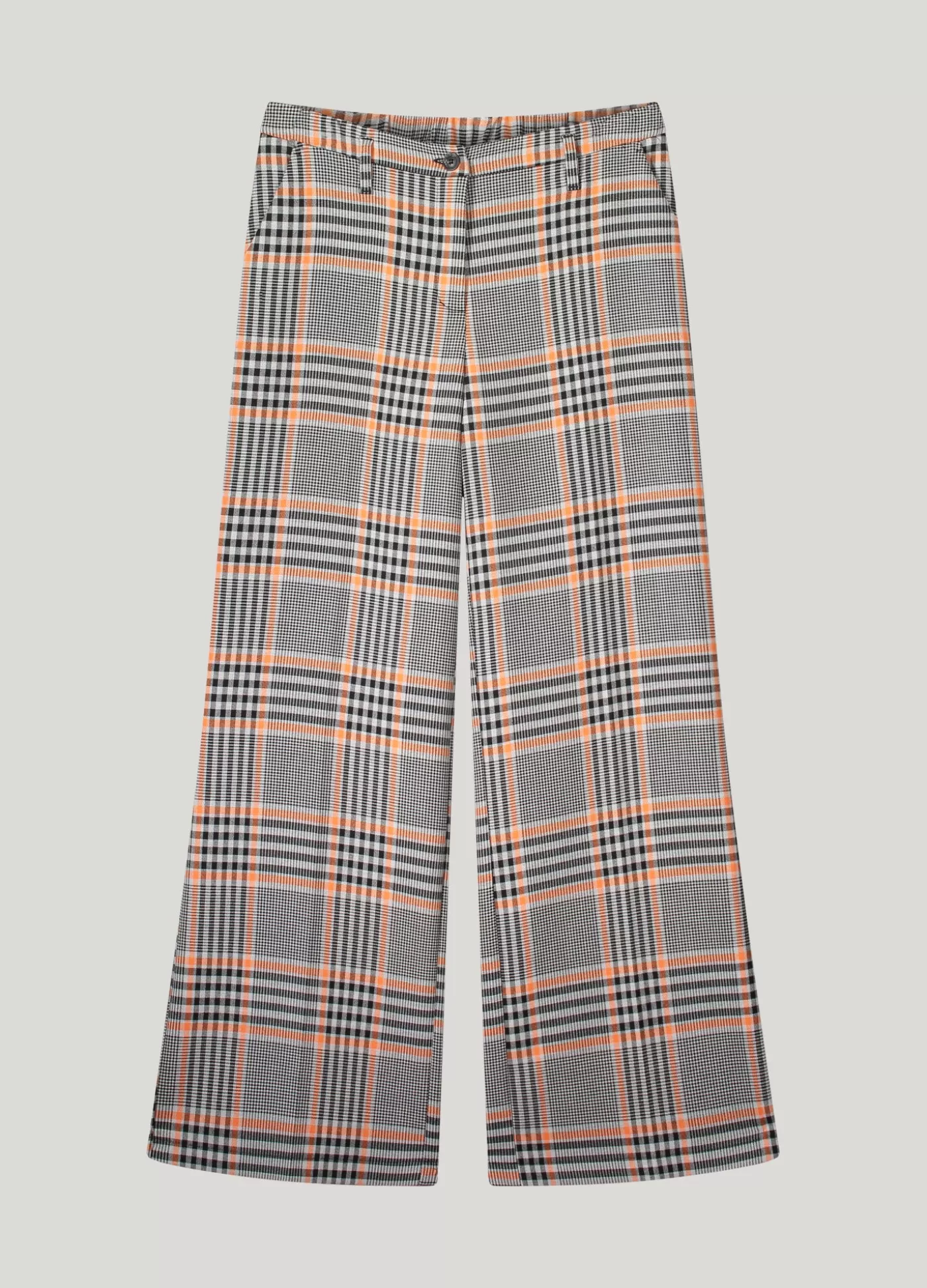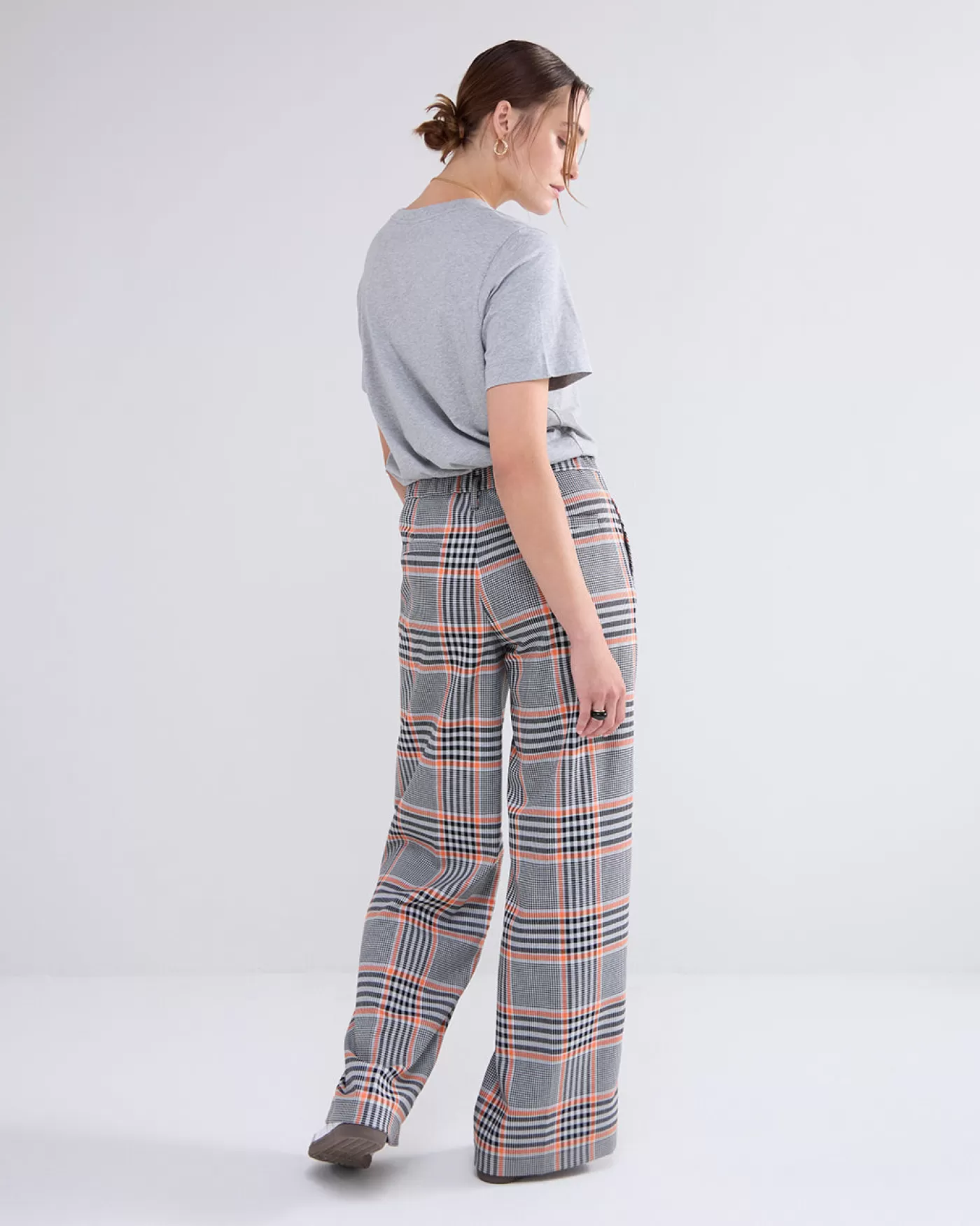 Ruitjesbroek met wijde pijpen, gemaakt van soepele kwaliteit. De broek is voorzien van steekzakken voor, strookzakken achter en elastiek in de achterkant van de taille. wijde pijpen soepele kwaliteit steekzakken voor elastiek in taille