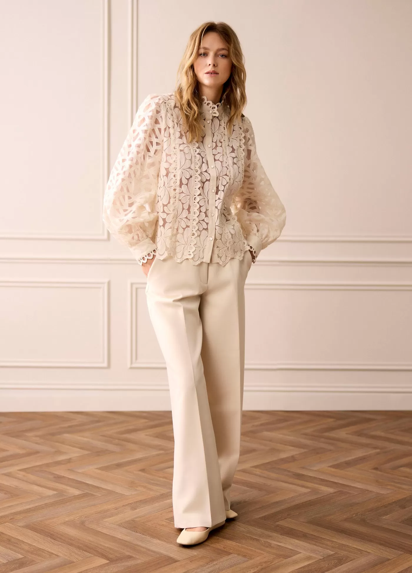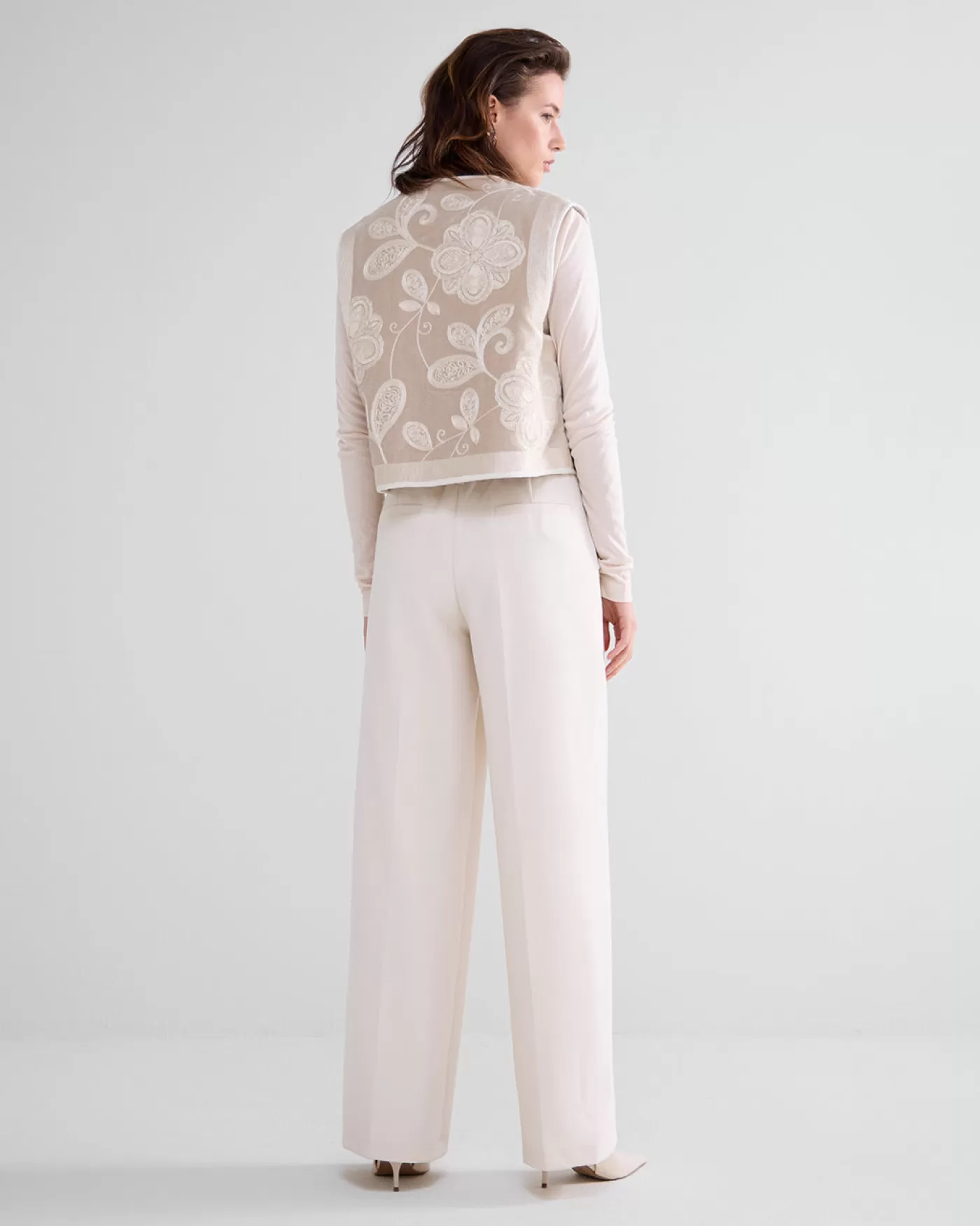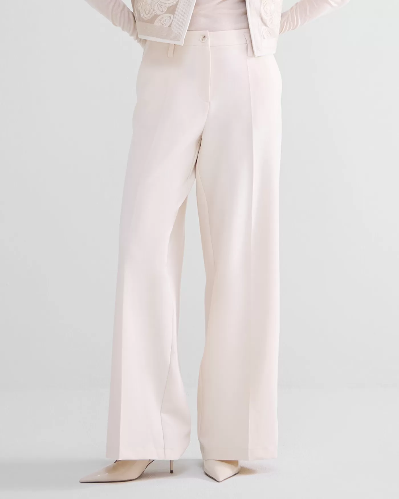 Broek met wijde pijpen, voorzien van steekzakken voor en strookzakken achter. Knoop- en ritssluiting en met elastiek in de achterkant van de taille. wijde pijpen steekzakken voor strookzakken achter elastiek in taille