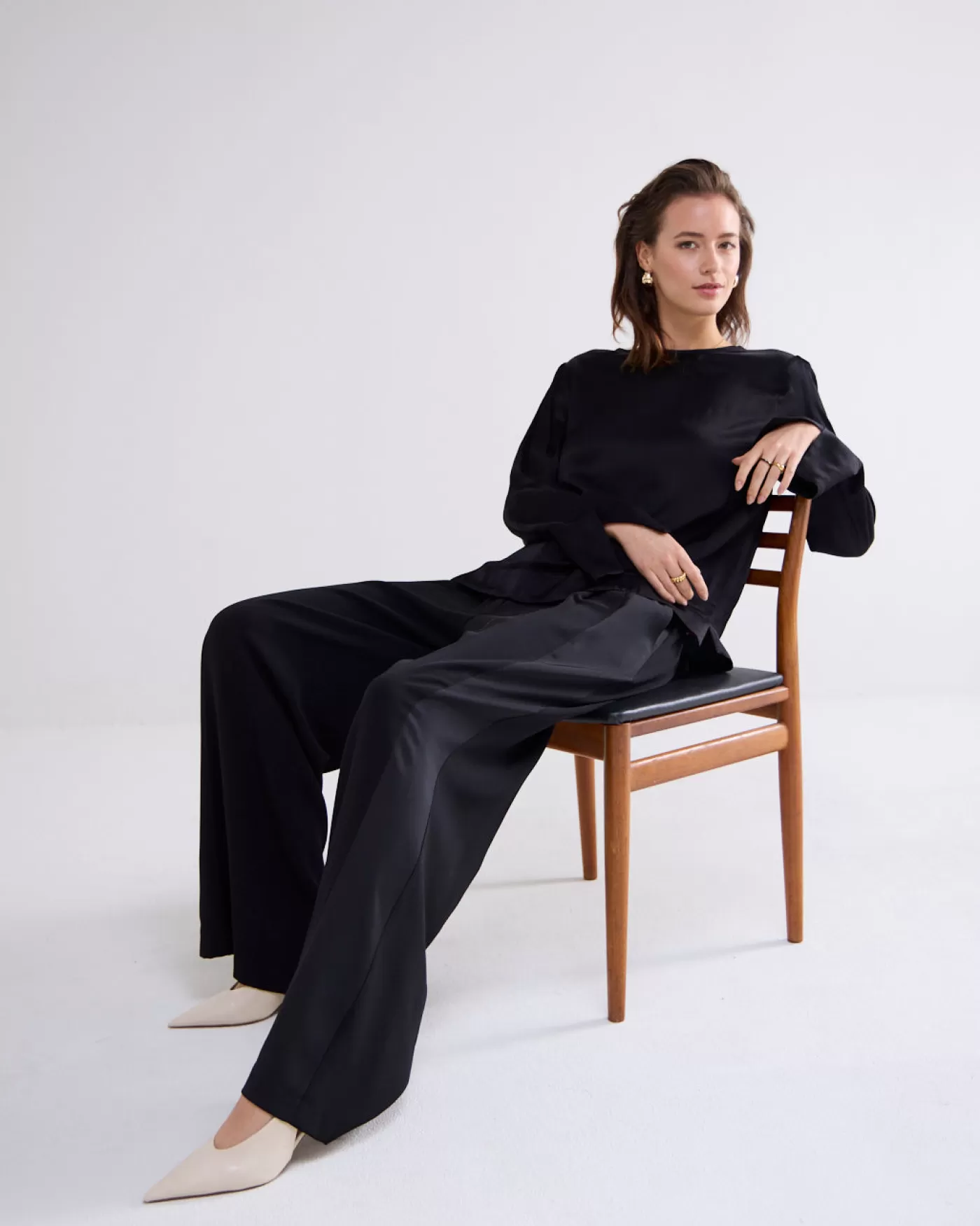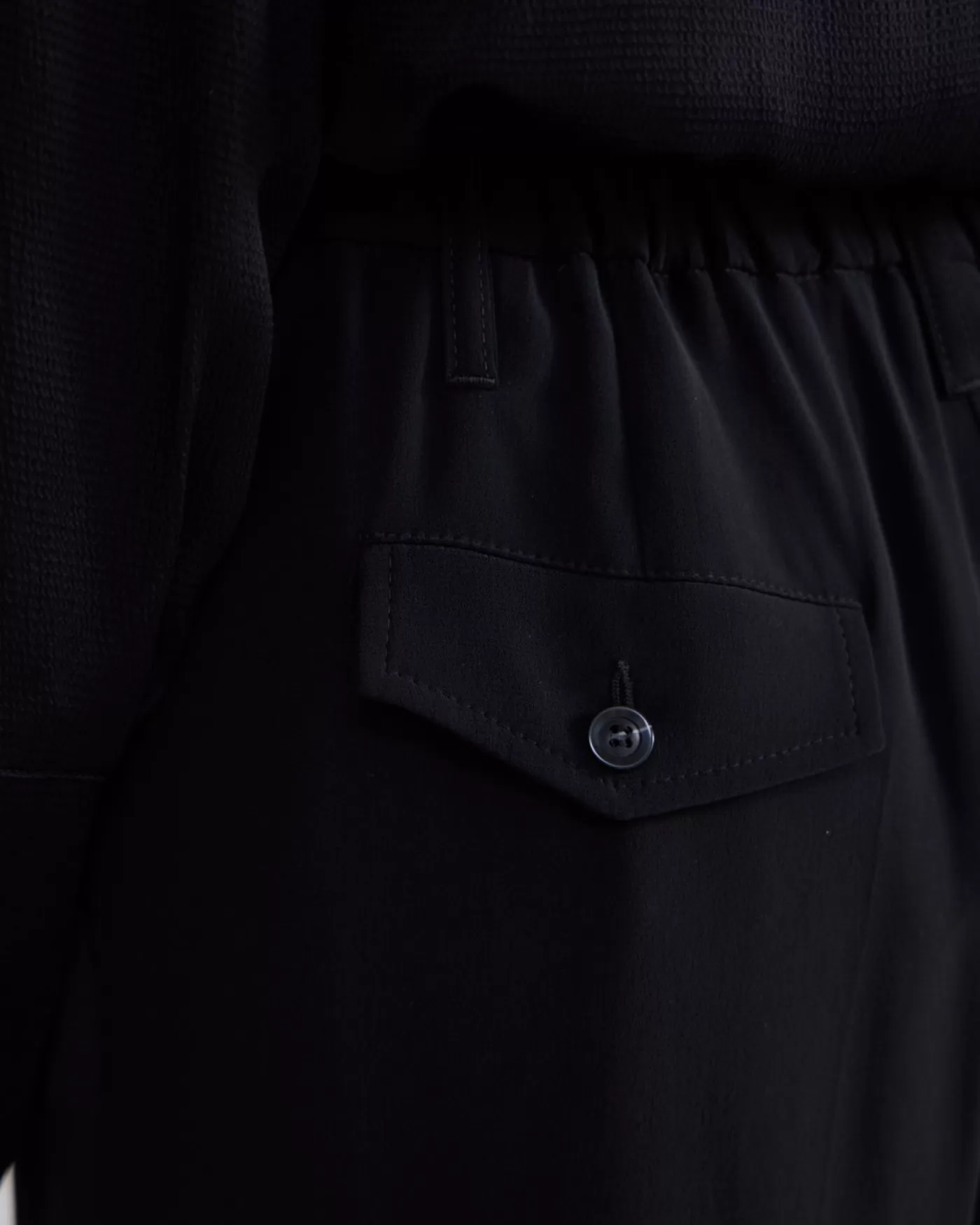 Broek met wijde pijpen, steekzakken en klepzakjes met een knoopje. Uniek aan dit ontwerp is het gebruik van twee kanten van de stof: een glanzend accent op de zijnaad en een matte crêpe finish voor de rest. wijde pijpen steekzakken en achter klepzakjes met knoop glanzende en matte crêpe details persnaad