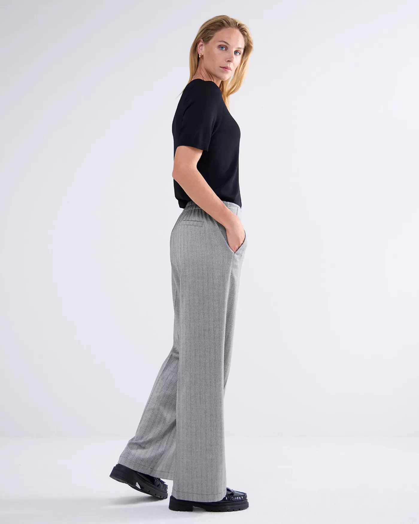 Broek met wijd uitlopende pijpen en een elastische tailleband aan de achterkant. Voorzien van steekzakken voor en strook…