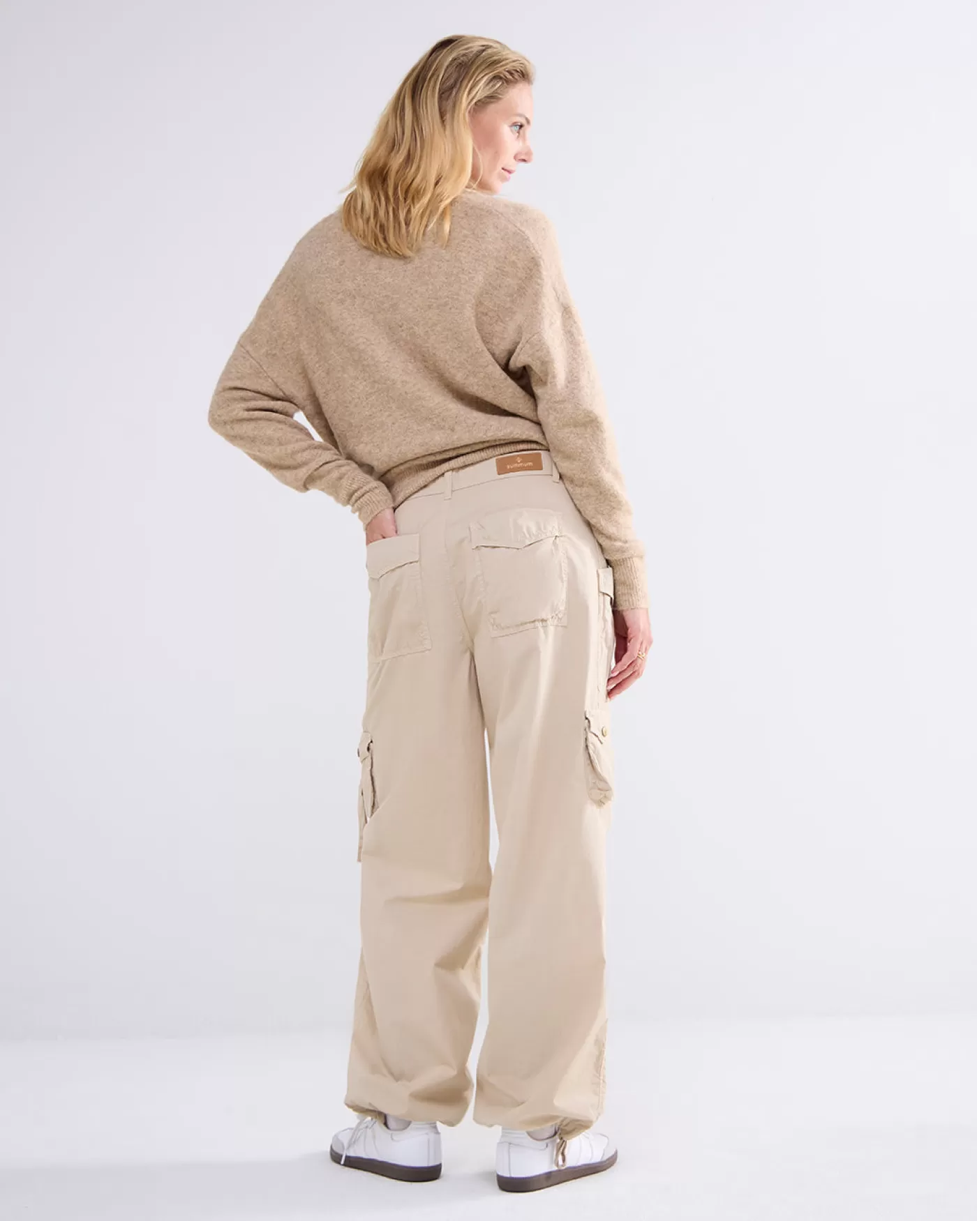 Wijde cargobroek met opgestikte zakken. De broek heeft een koordje in de zoom van de pijpen. cargostijl wijde fit opgestikte zakken koordje in zoom