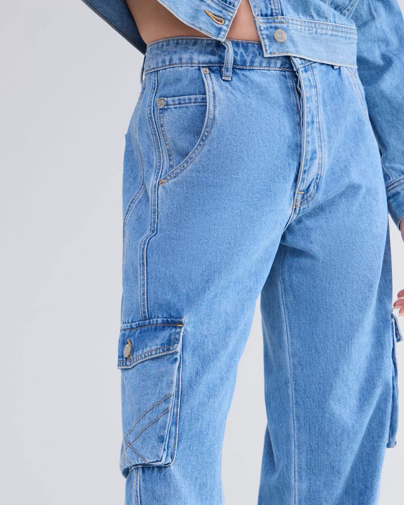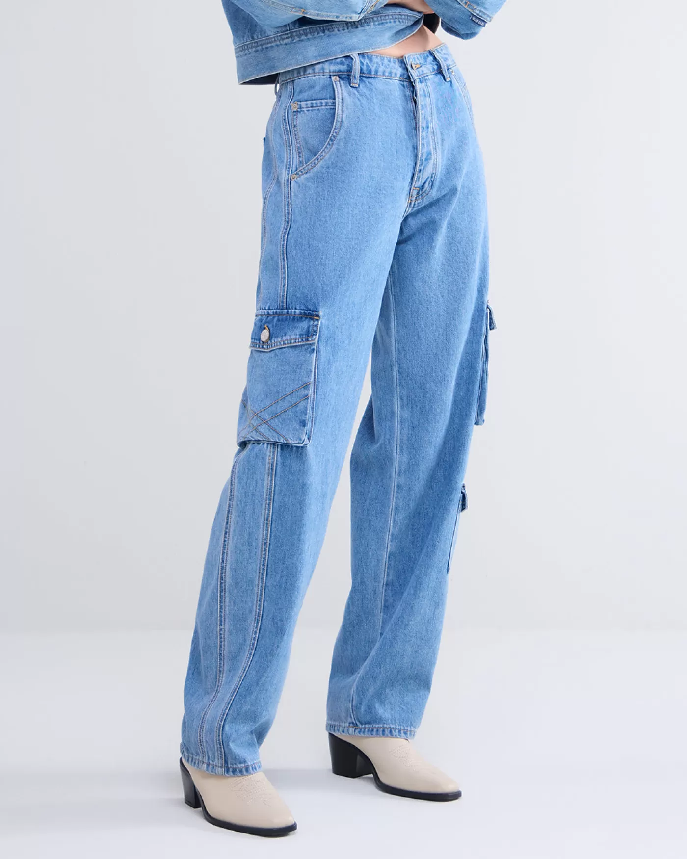 Cargojeans met loose fit, gemaakt van soepele non-stretch denim. Het zijbeen is gedecoreerd met meerdere opgestikte zakken en sierstiksels. loose fit stretch denim knoopsluiting cargo stijl