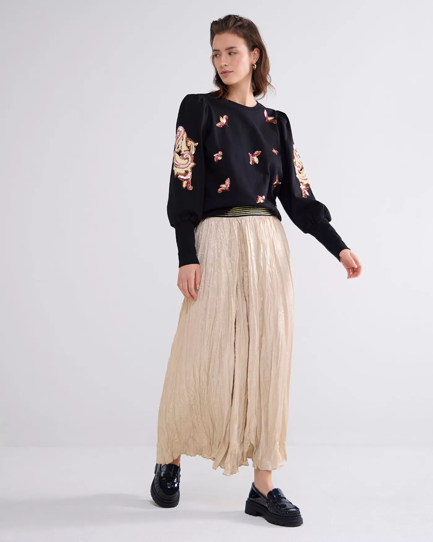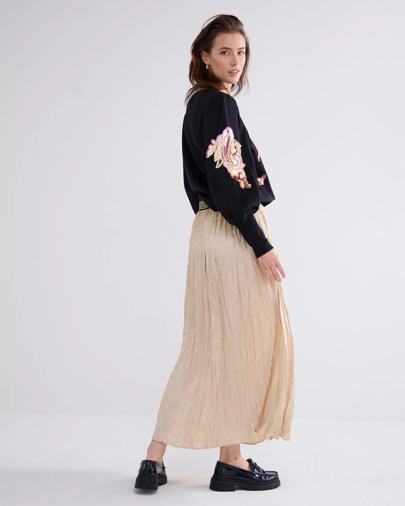 Metallic rok tot onder de knie, uitgevoerd in een glanzend, gekreukelde stof met goudkleurige tint. De rok heeft een ges…