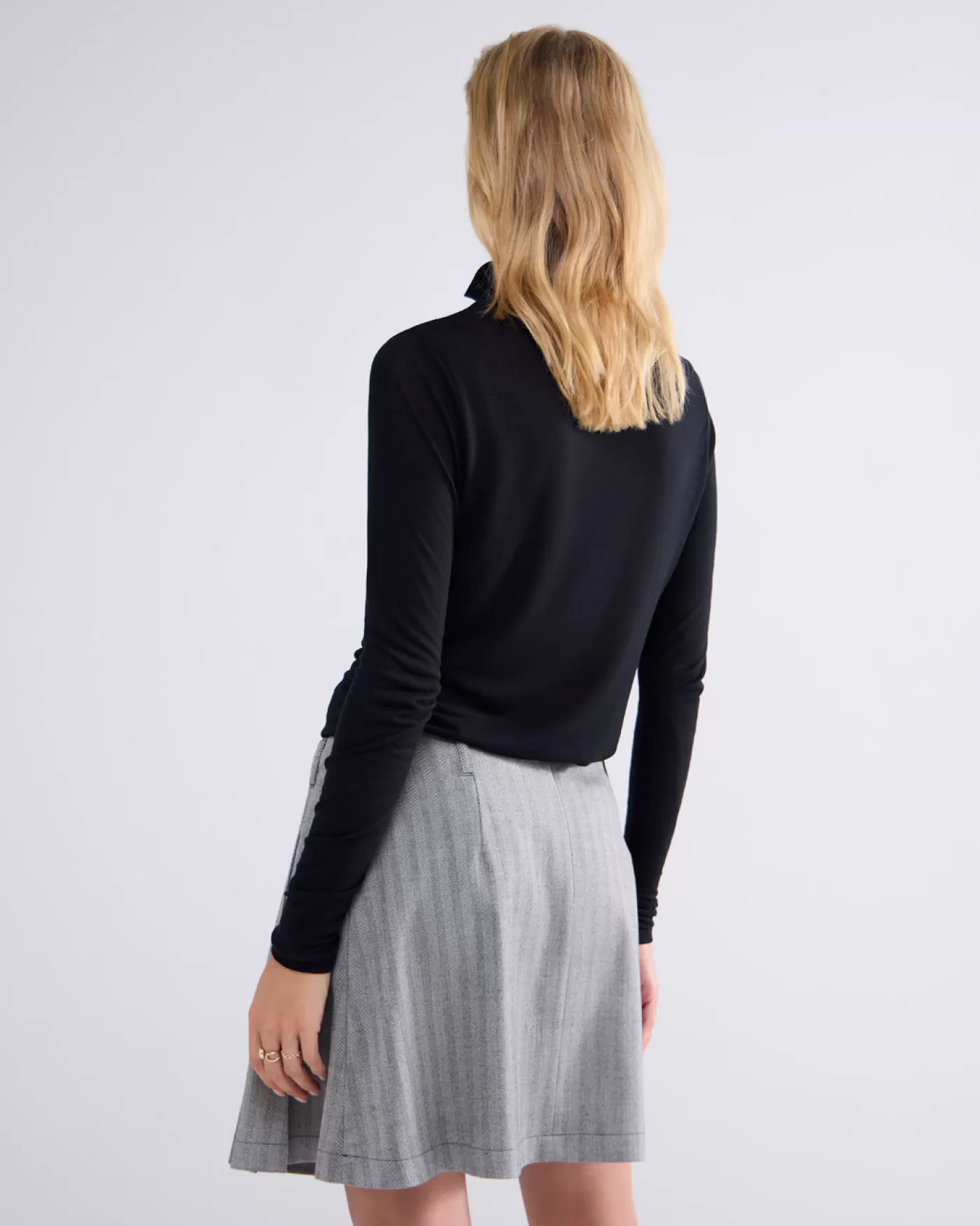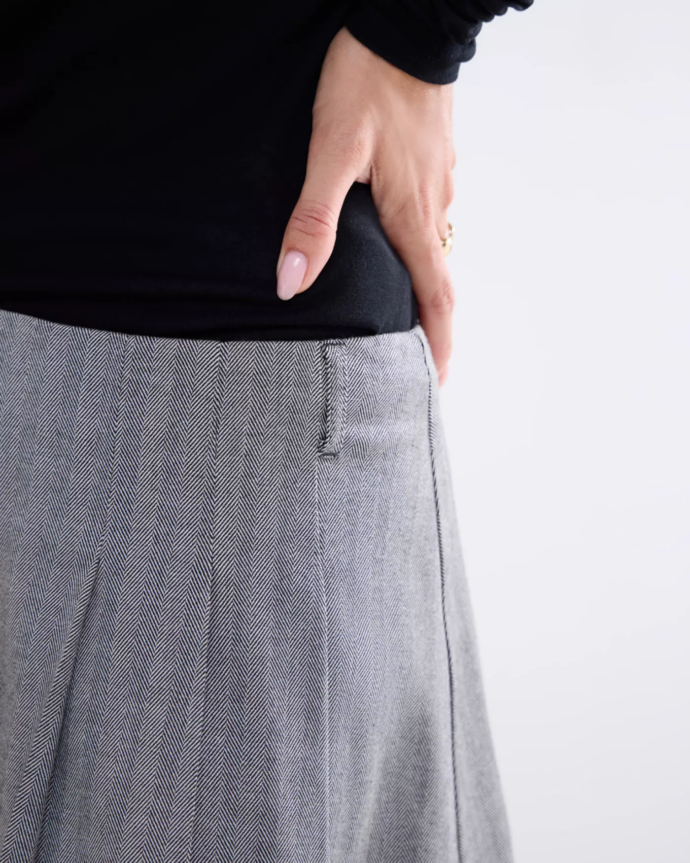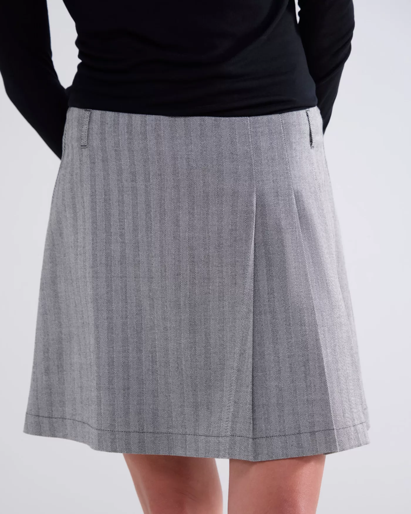 Kort rokje met plooien aan één kant en een blinde rits aan de achterkant. De rok is gemaakt van een geweven visgraat patroon. korte fit plooien aan één kant blinde rits achter u0026gt;