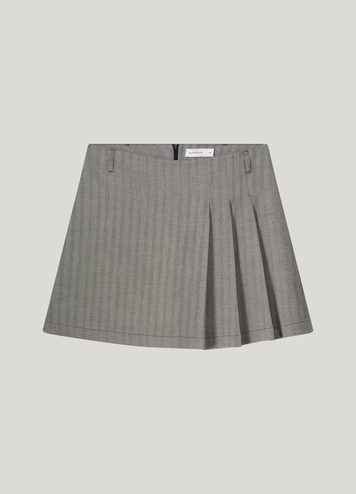 Kort rokje met plooien aan één kant en een blinde rits aan de achterkant. De rok is gemaakt van een geweven visgraat p…