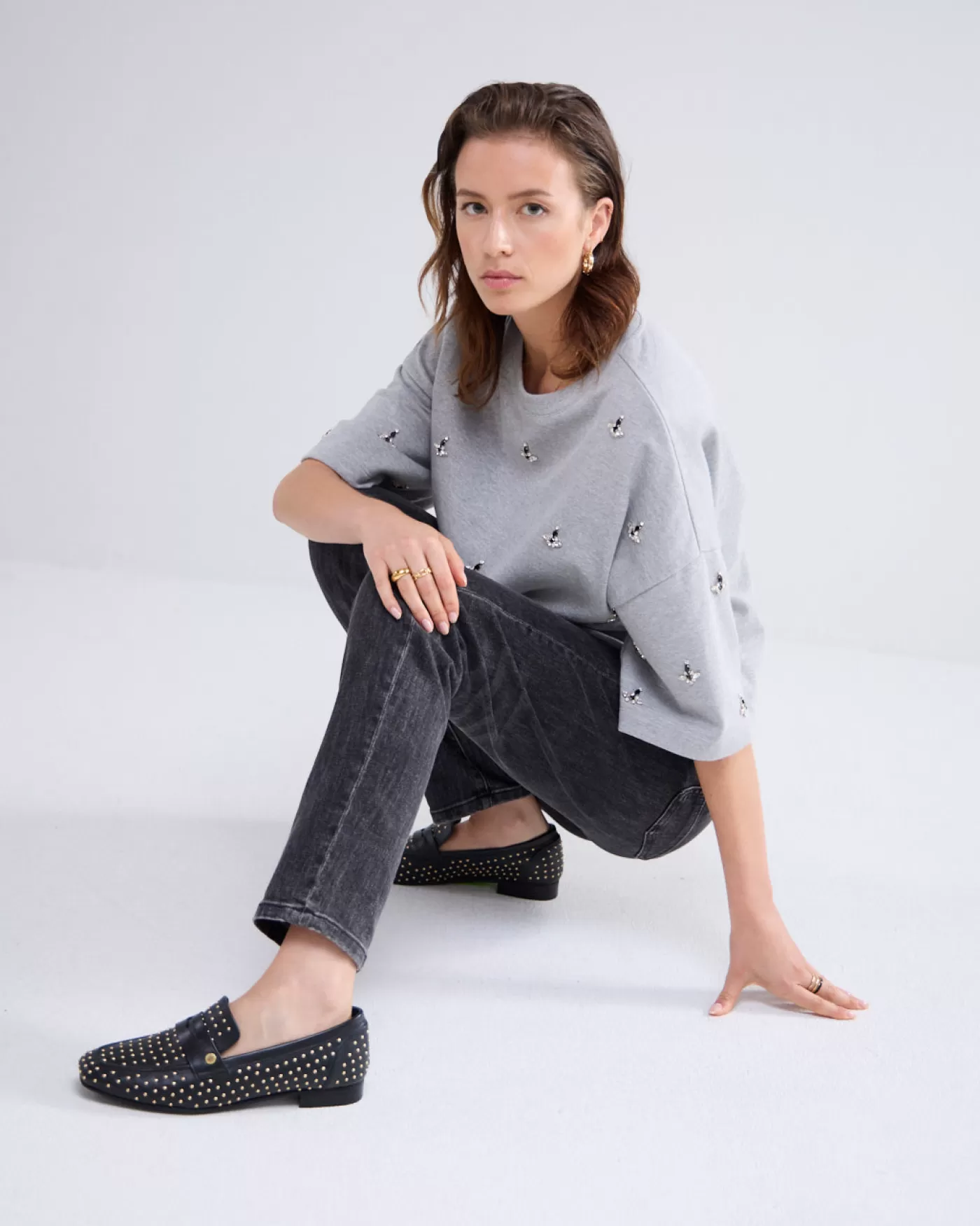 Leren loafers versierd met gouden studs en Summum-stud op het bandje. leren loafers gouden studs Summum logo