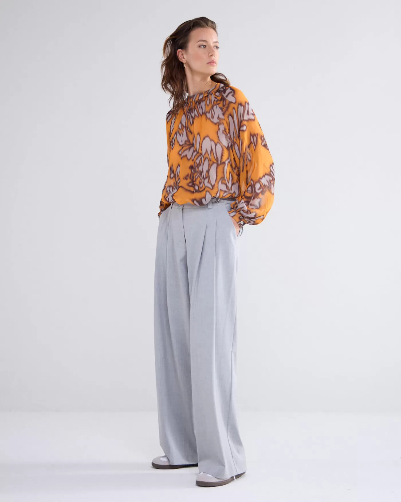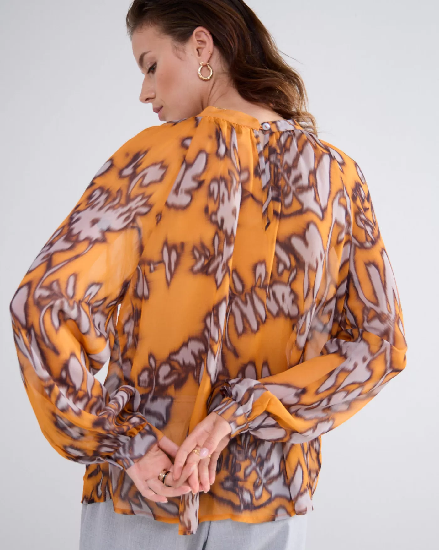 Top die op twee manieren gedragen kan worden: met een hoge iets geplooide hals of met een split en knoopje. Gemaakt van transparante bedrukte stof met raglanmouwen. hoge gerimpelde hals split en knoopje raglanmouwen transparante viscose