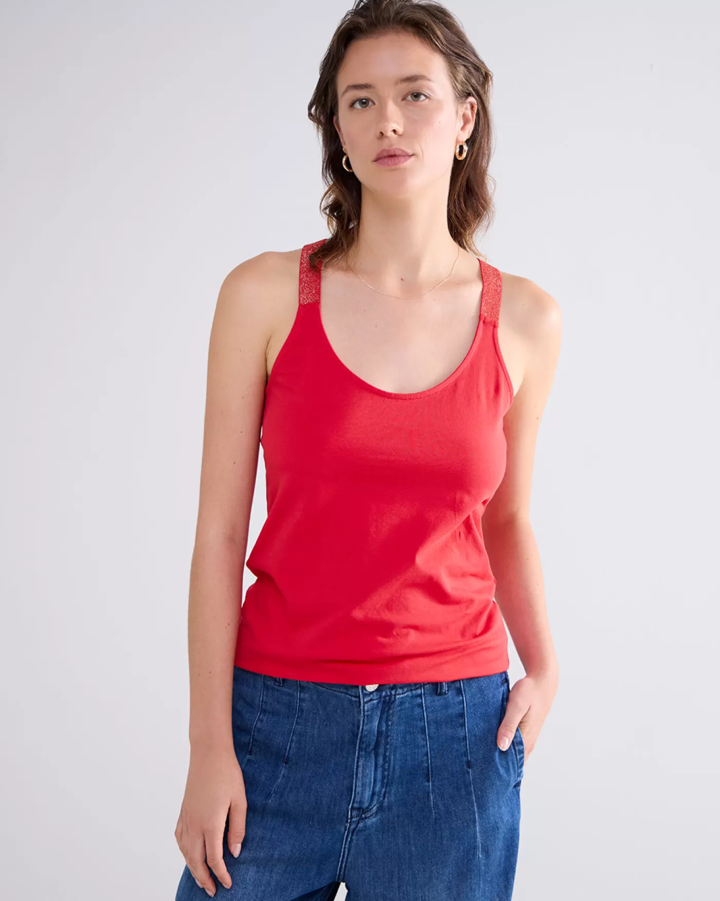 Basis singlet met kruisband op de rug, gemaakt van katoen elastaan tricot stof. De top heeft een nauwsluitende pasvorm en opvallende glitterbandjes. kruisbandjes elastiek met glitters nauwsluitend stretch tricot stof
