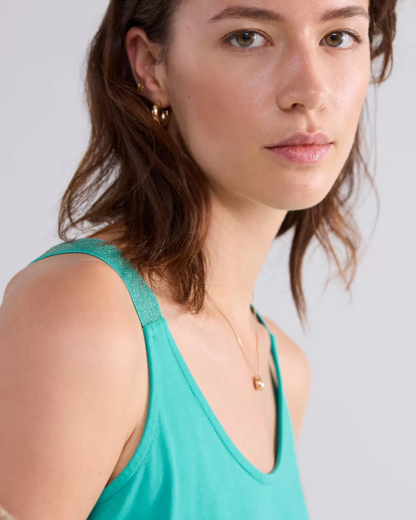 Basis singlet met kruisband op de rug, gemaakt van katoen elastaan jersey stof. De top heeft een nauwsluitende pasvorm en opvallende glitterbandjes. kruisbandjes elastiek met glitters nauwsluitend stretch jersey stof
