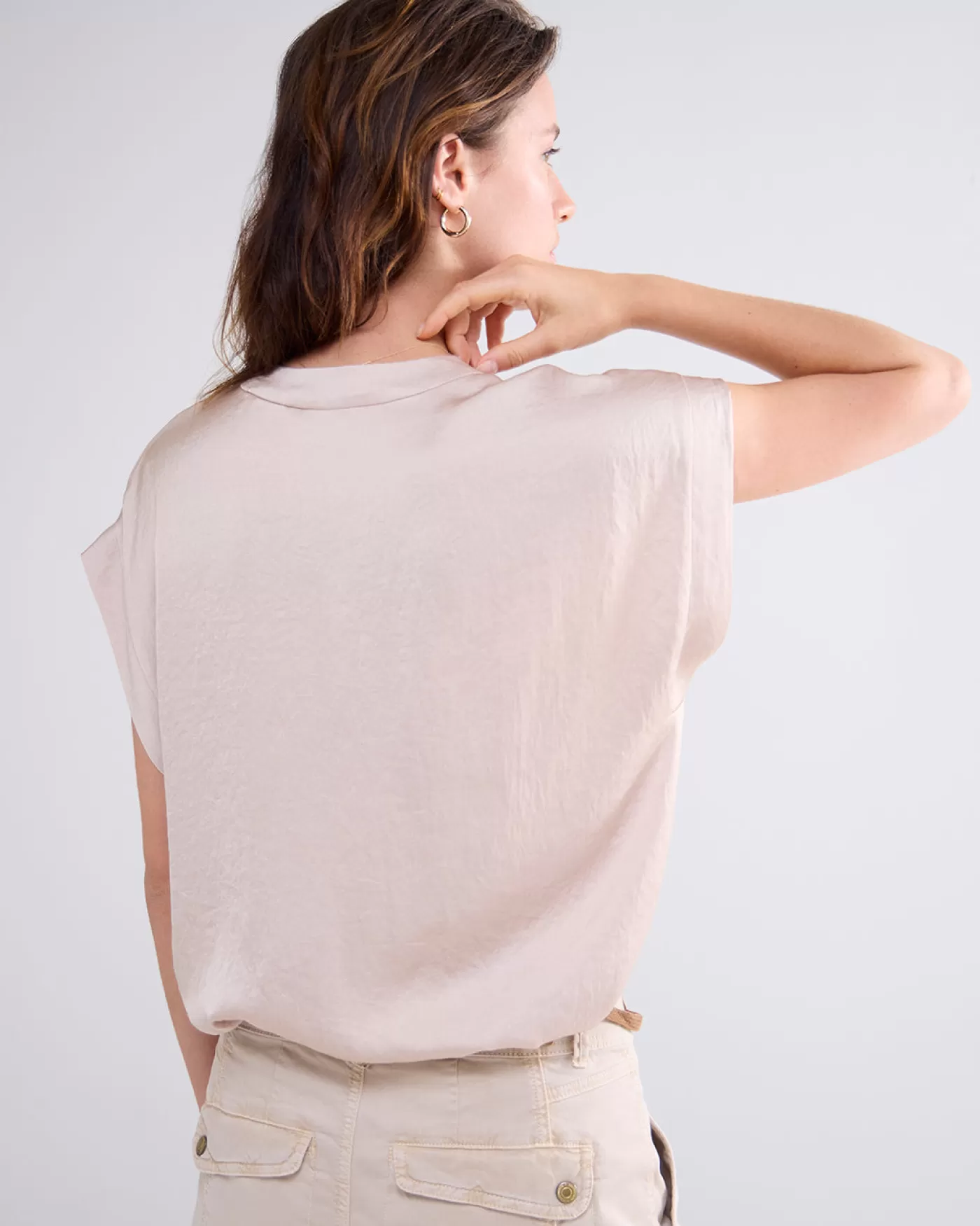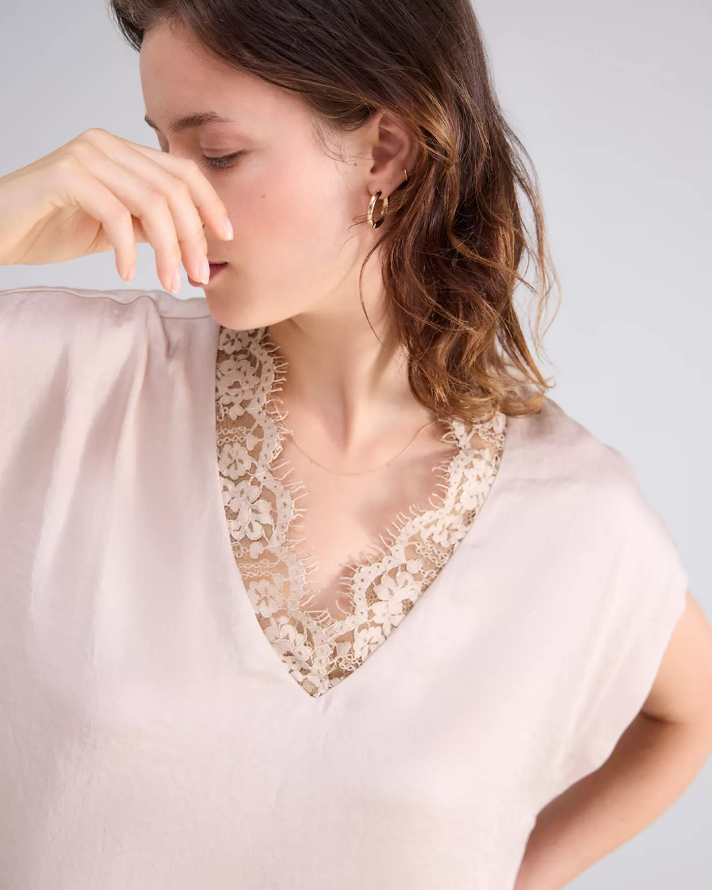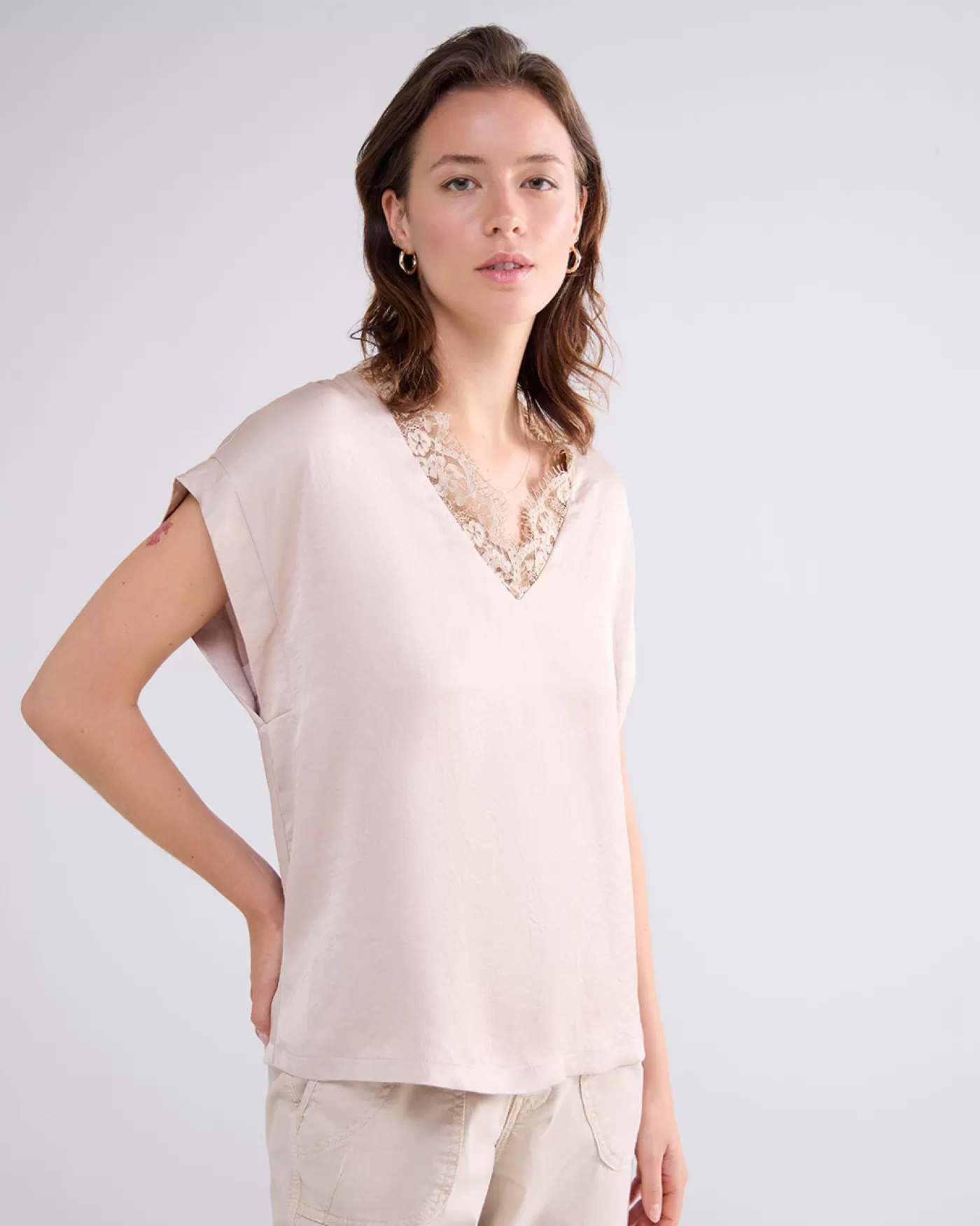 Mouwloze top met V-hals met een omlijsting van kant. De top is gemaakt van een licht glanzende stof met bewegend effect….