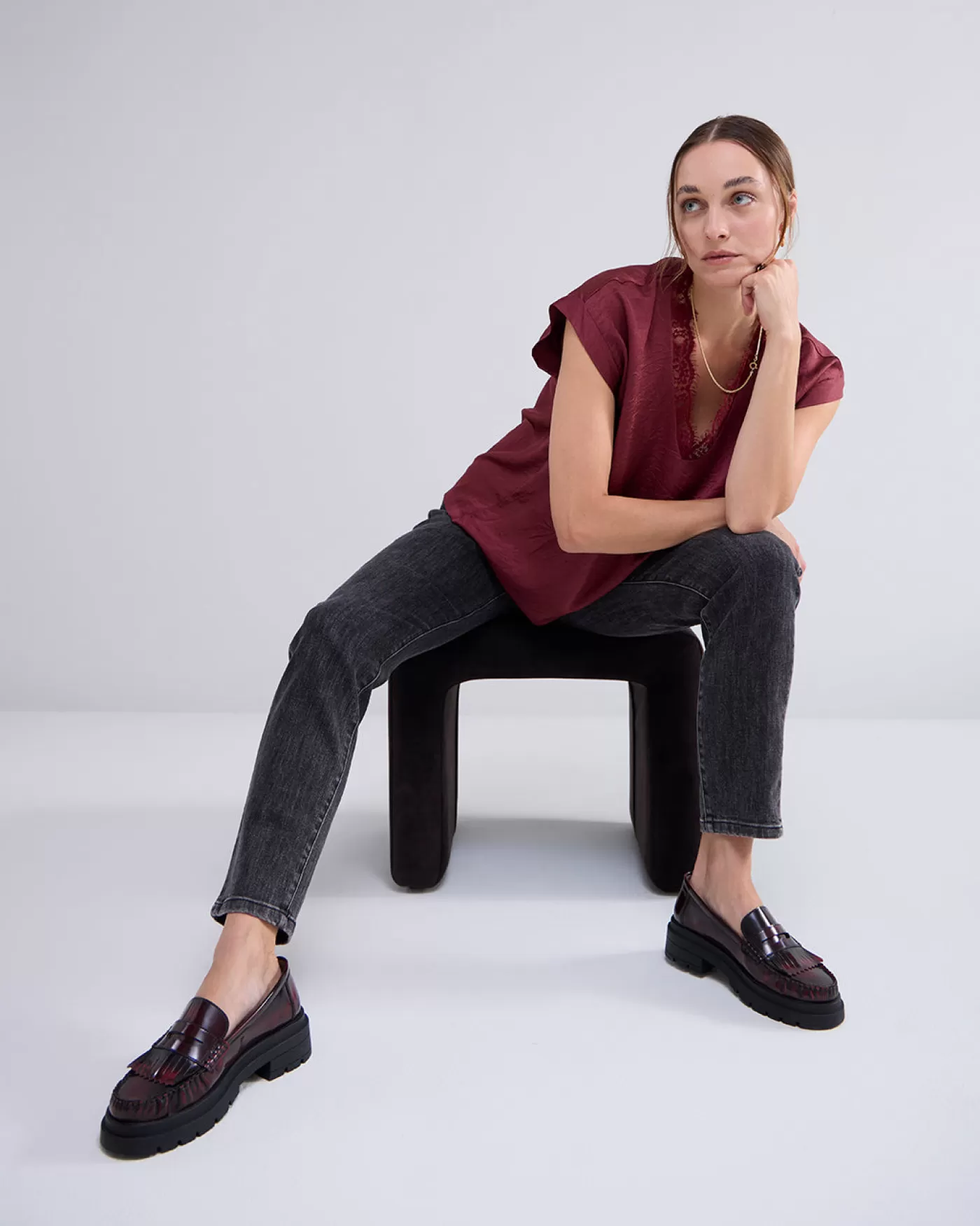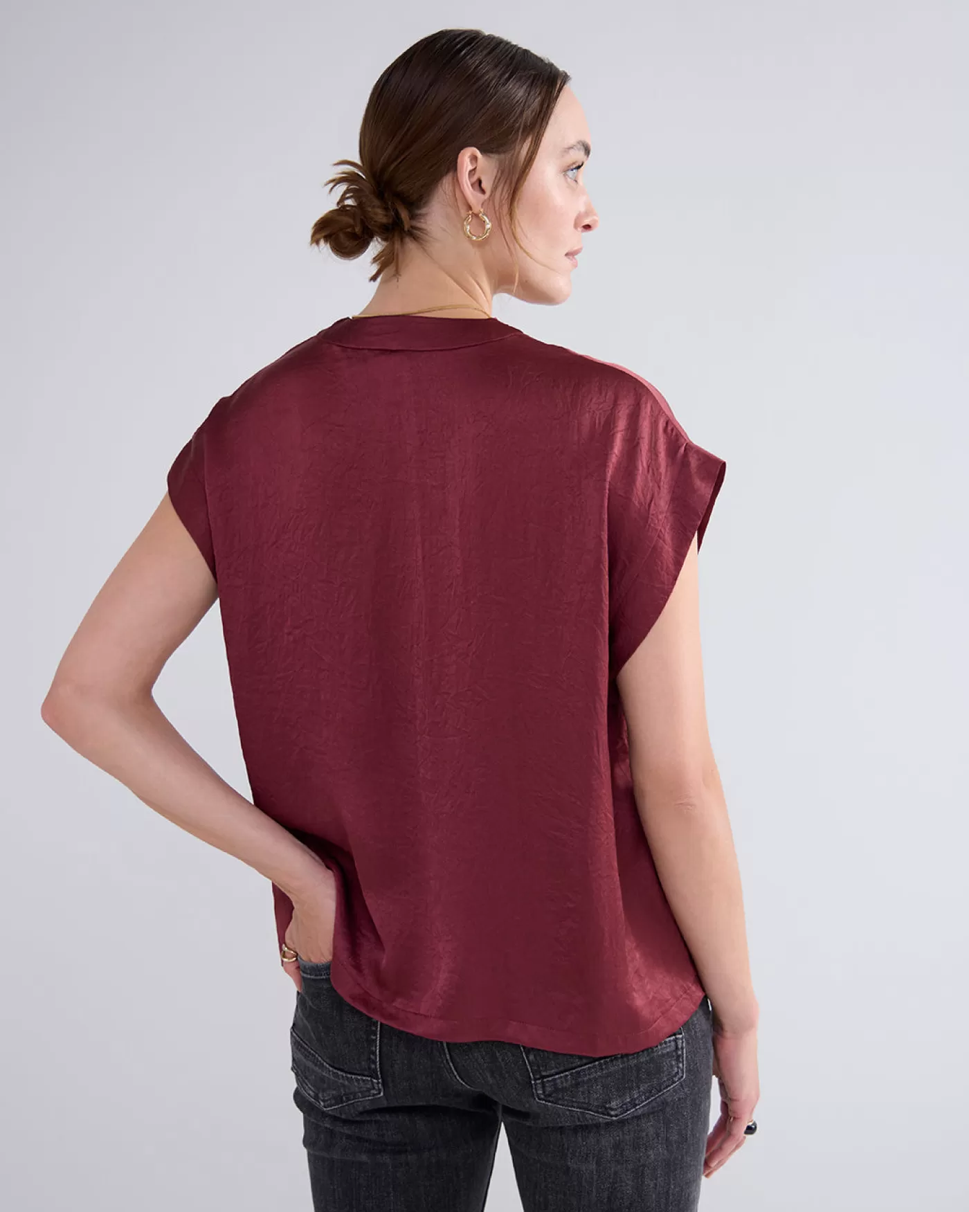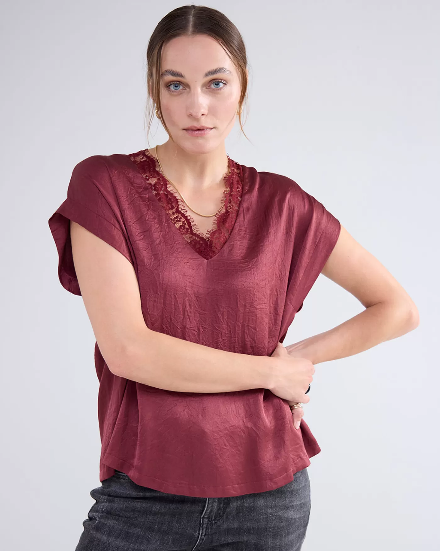 Mouwloze top met een elegante V-hals afgewerkt met kant. De top is gemaakt van een satijnlook stof met licht gehamerd effect. mouwloos V-hals met kant luchtig en elegant gehamerd satijnlook