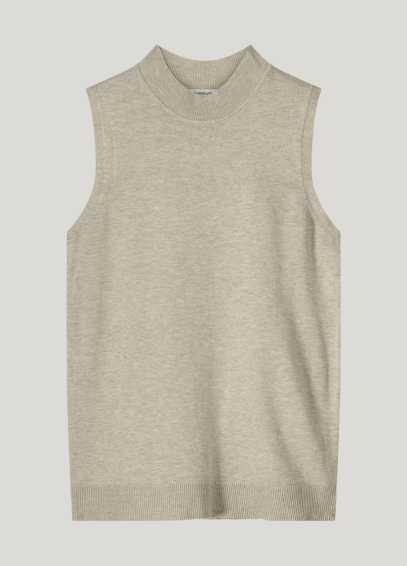 Fijngebreide mouwloze top met een opstaand rib-boordje. De top is gebreid in een compacte viscose polyamide garen met geribde boorden. mouwloos rib-boordje viscose polyamide garen compact gebreid