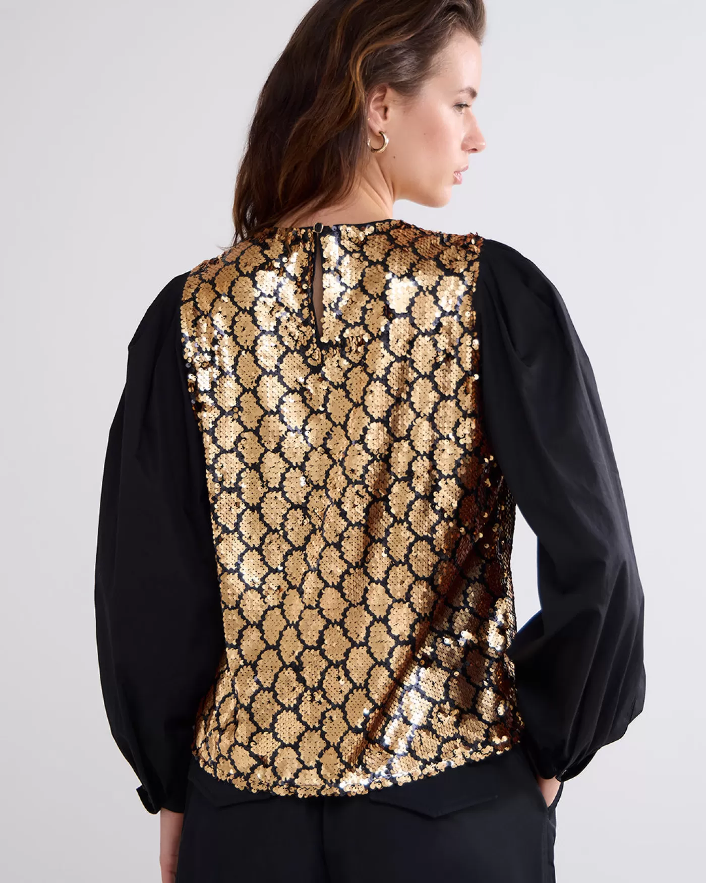 Nauwsluitende top met pailletten in honinggraat-patroon. De top heeft een ronde hals met spit in de nek en pofmouwtjes. Ronde hals met split en koordsluiting Body met pailletten Katoenen pofmouw Nauwsluitend