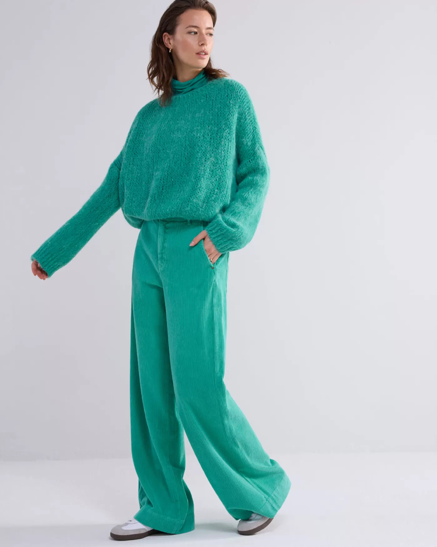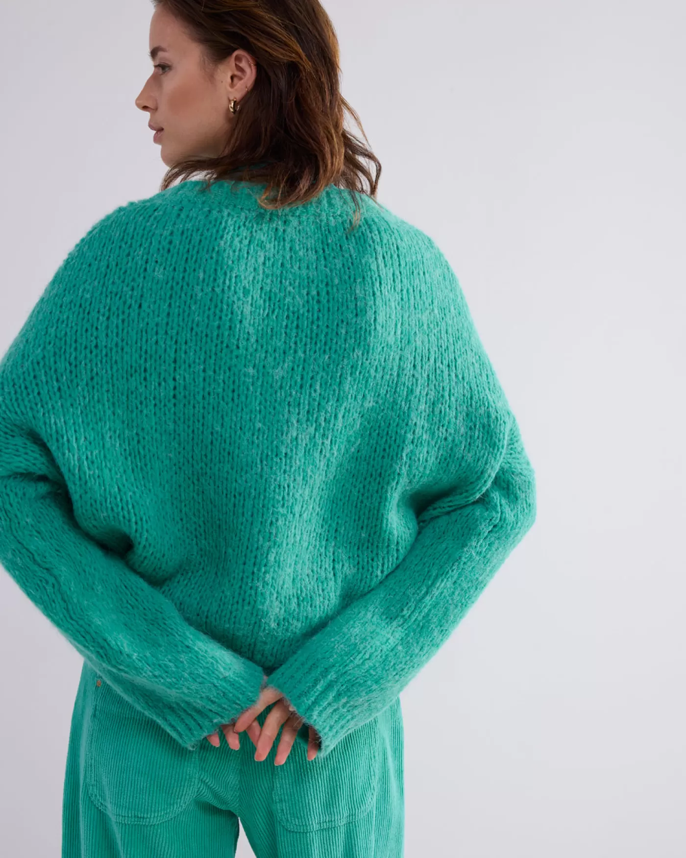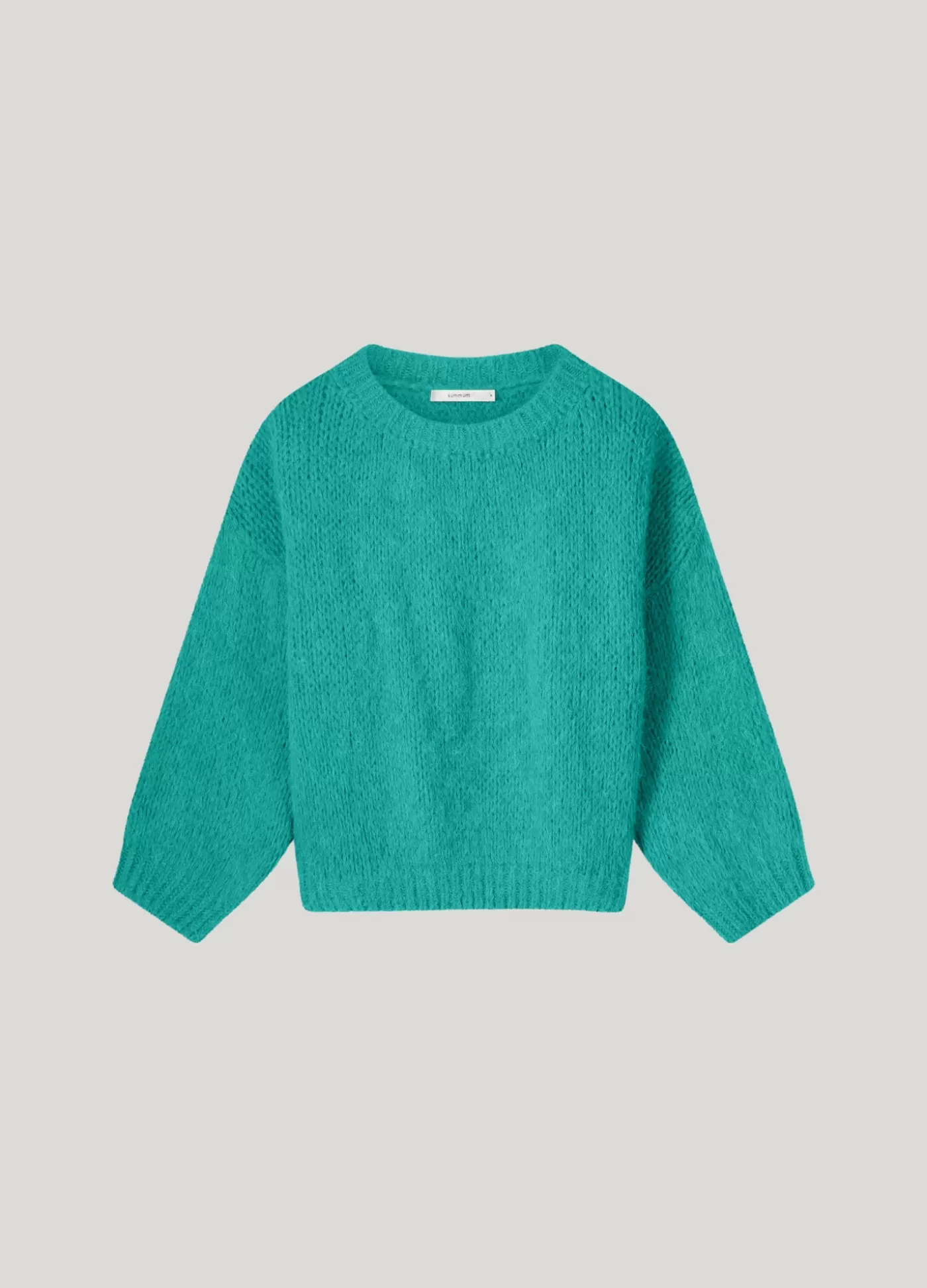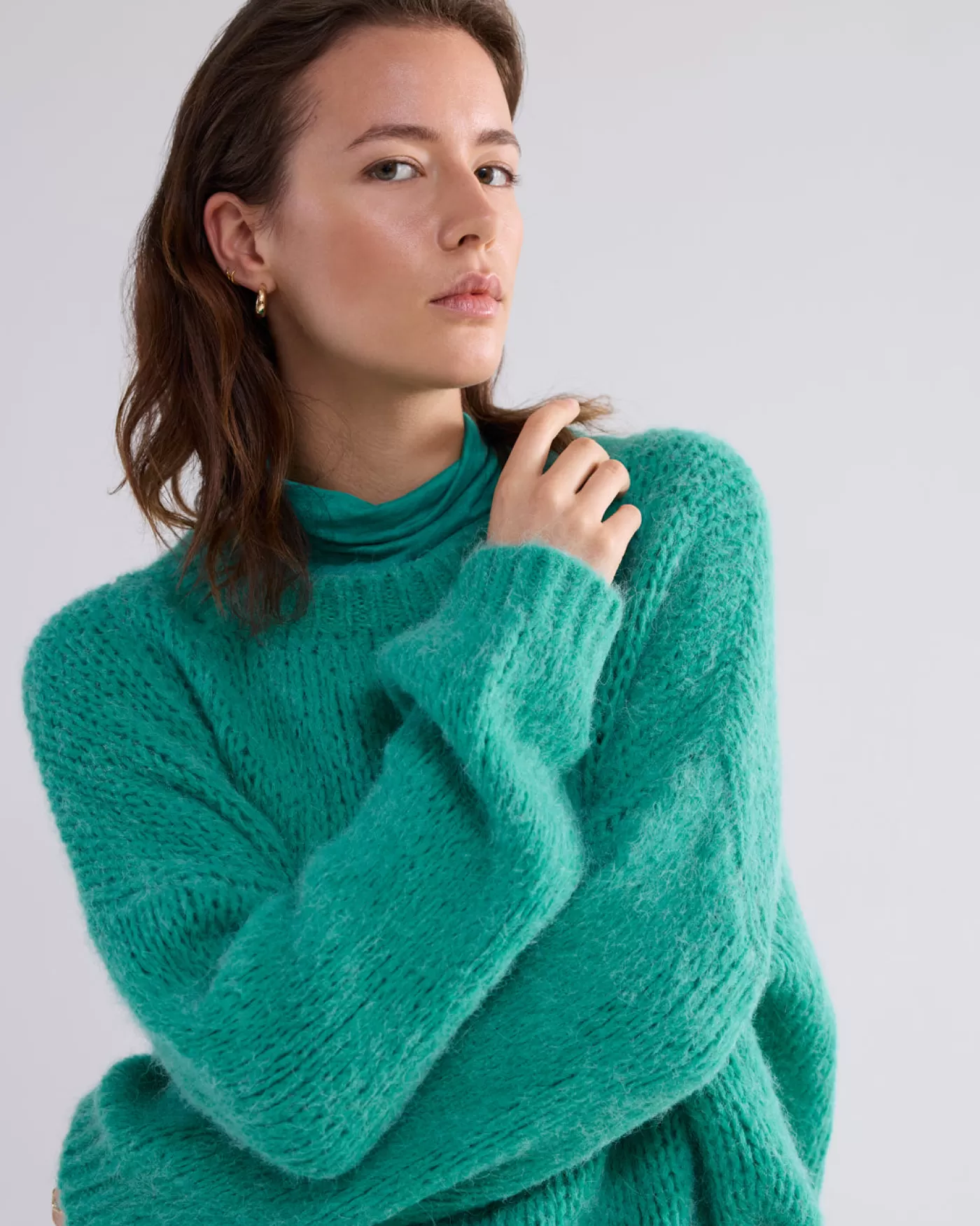 Boxy trui in een grove steek. Voorzien van een ruime ronde hals en een boxy fit. Gemaakt van een blend met alpaca wol. boxy fit grove steek ruime ronde hals alpaca wol blend