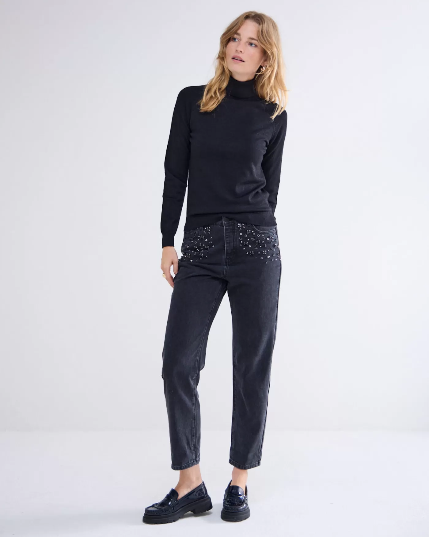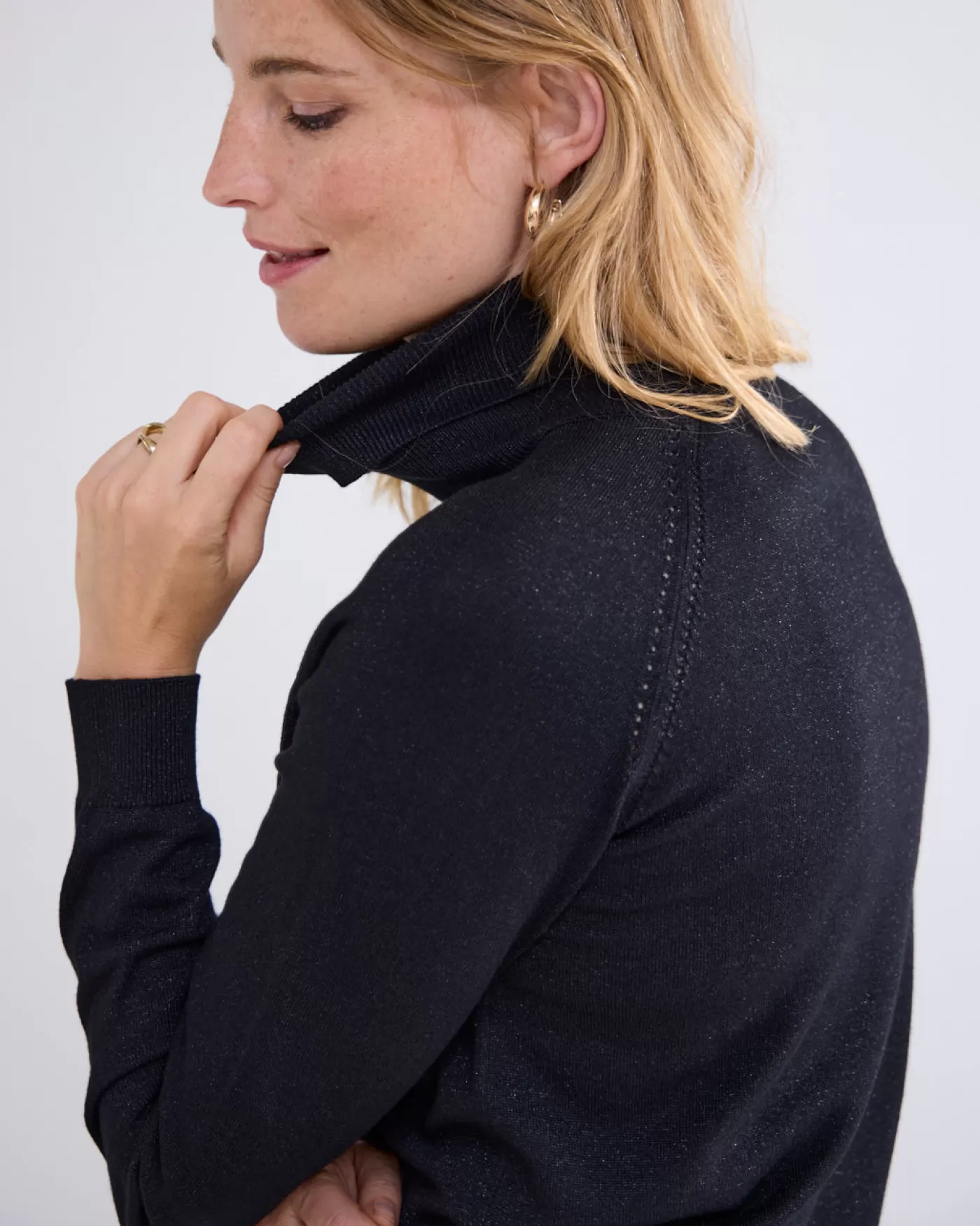 Een rechte coltrui van zachte kwaliteit met lange raglanmouwen. De trui heeft ingebreide gaatjes lans de mouwaanzet. Er is een lurex draad mee gebreid waardoor dit truitje een subtiele glans krijgt rechte pasvorm coltrui gaatjespatroon compact gebreid