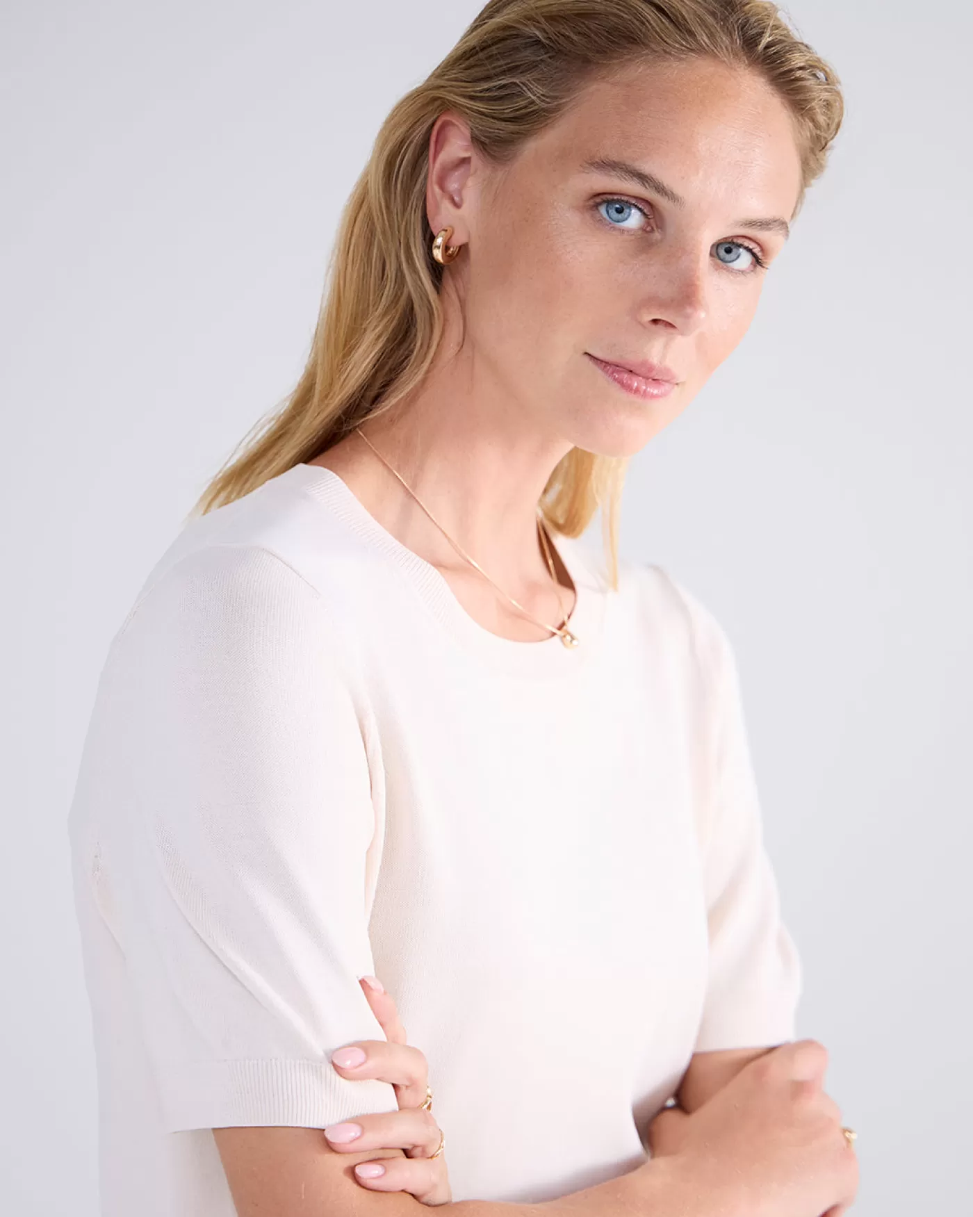 Fijngebreid truitje met ronde hals en korte mouwen, gemaakt van een viscose blend garen. De boorden van het truitje zijn met geribde boorden. ronde hals korte mouwen viscose blend comfortabel