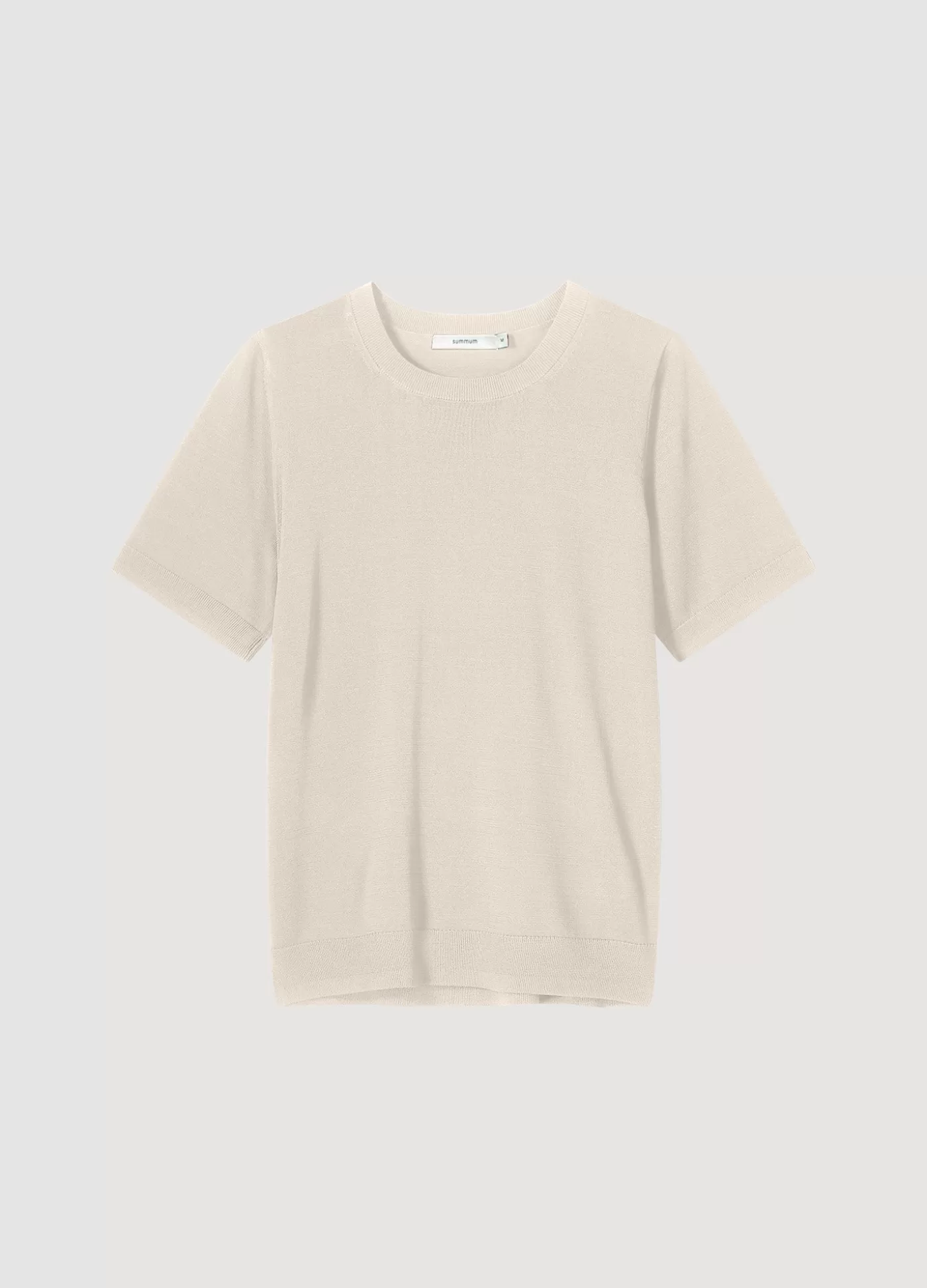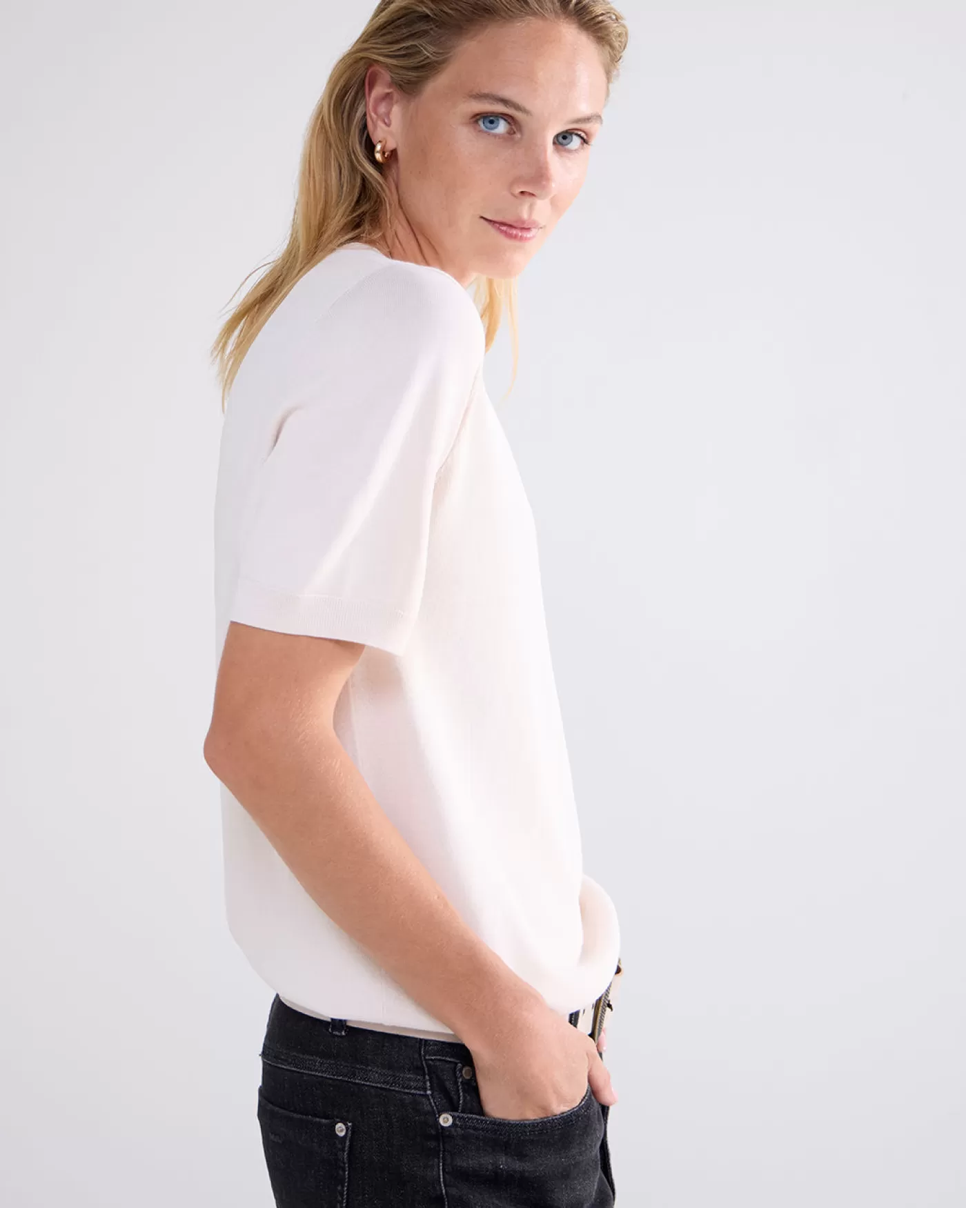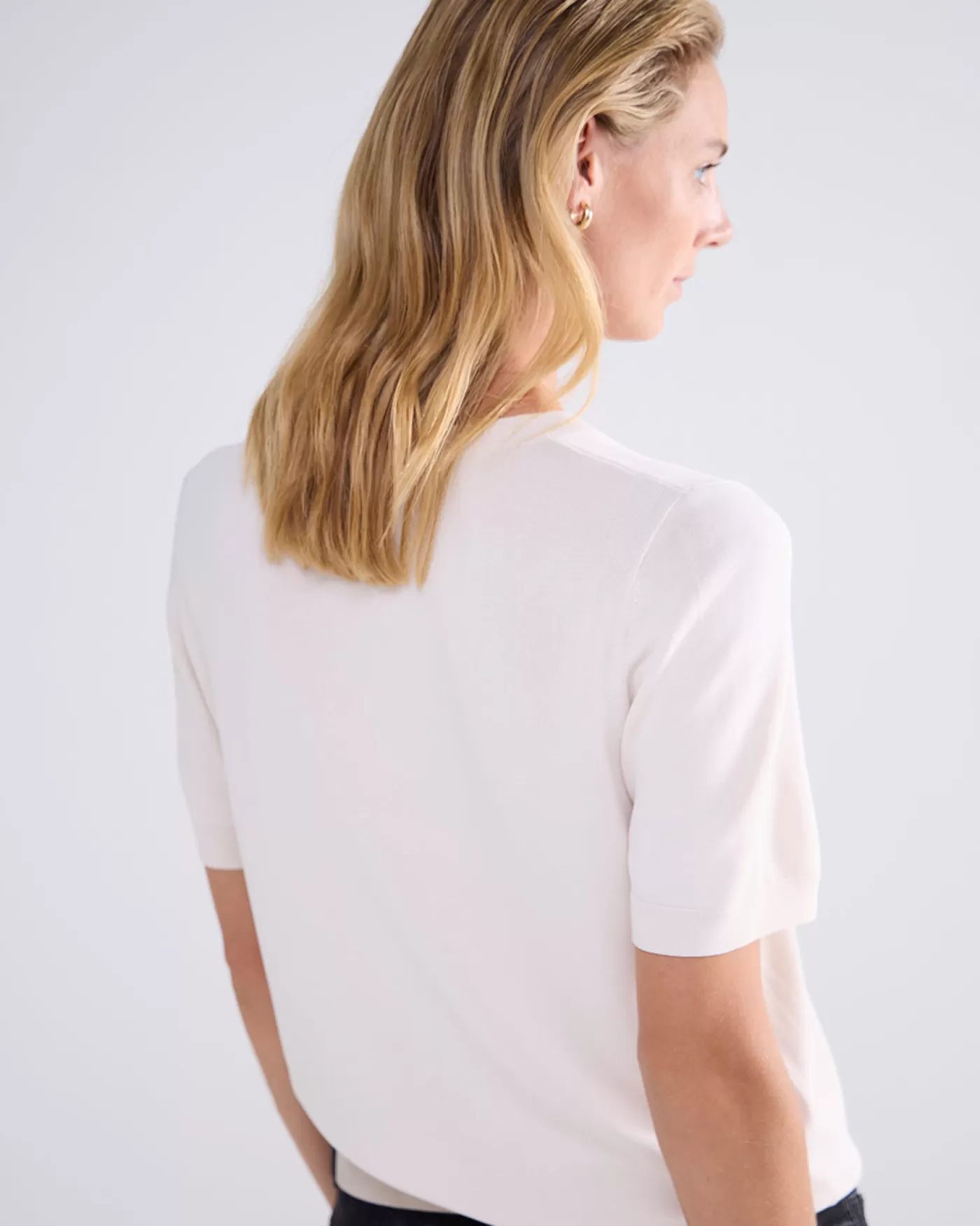 Fijngebreid truitje met ronde hals en korte mouwen, gemaakt van een viscose blend garen. De boorden van het truitje zijn…