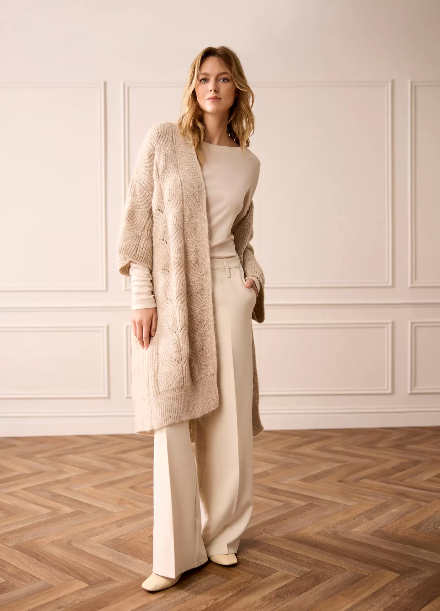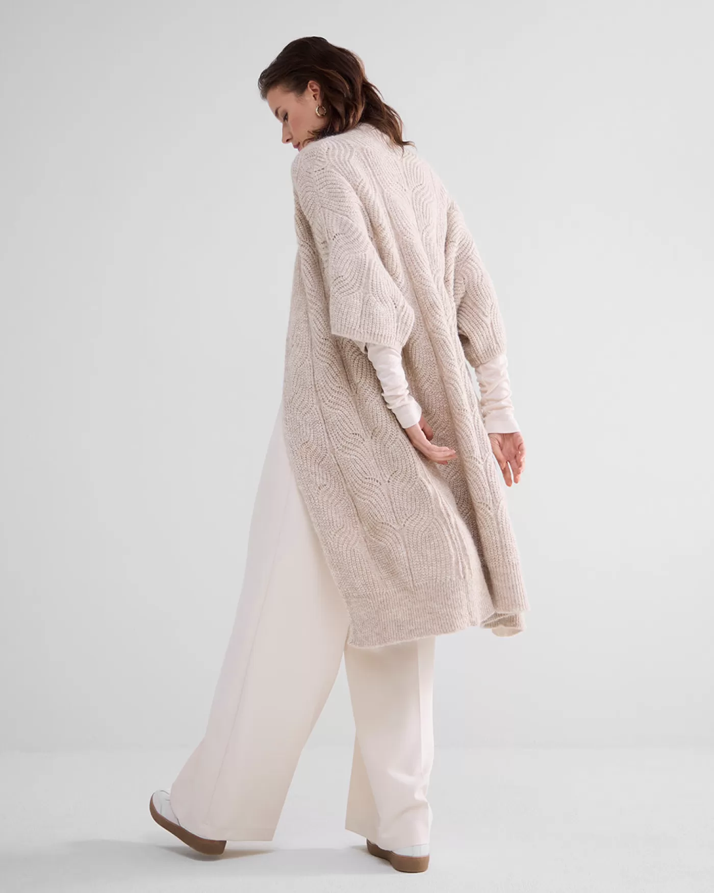 Lang kimonovest in een oversized pasvorm. Het vest is uitgevoerd in een grove kabelsteek met glimmend metallic draad. oversized fit kimonomouwen metallic garen grove kabelsteek
