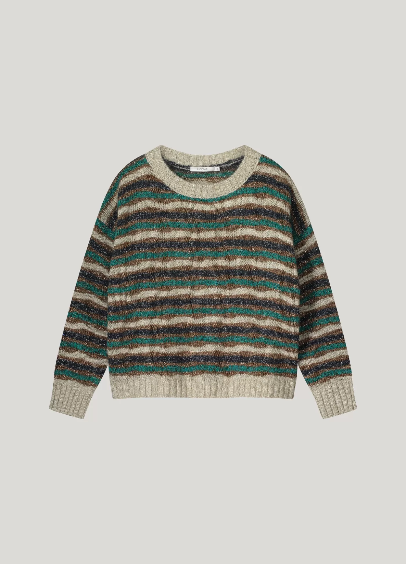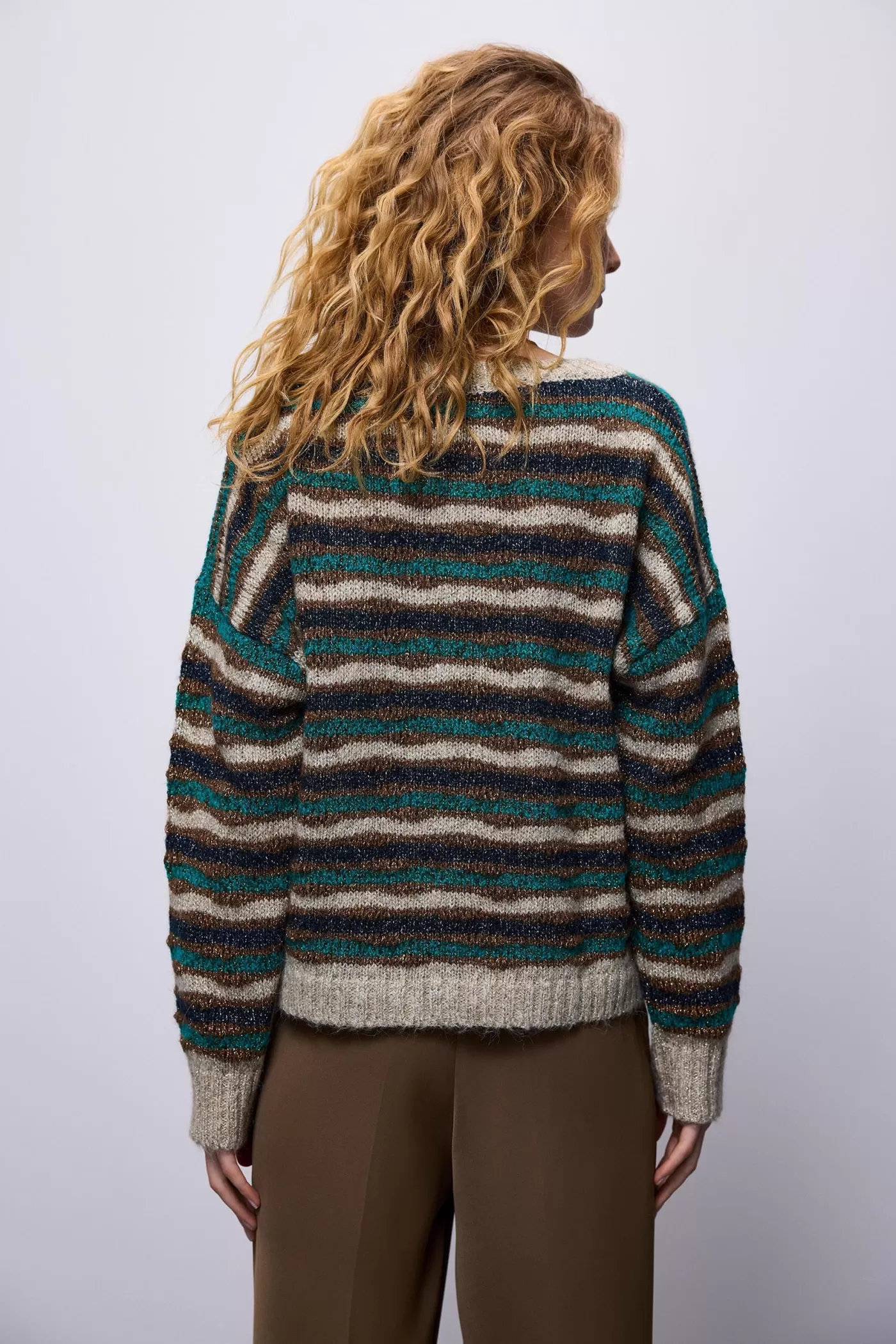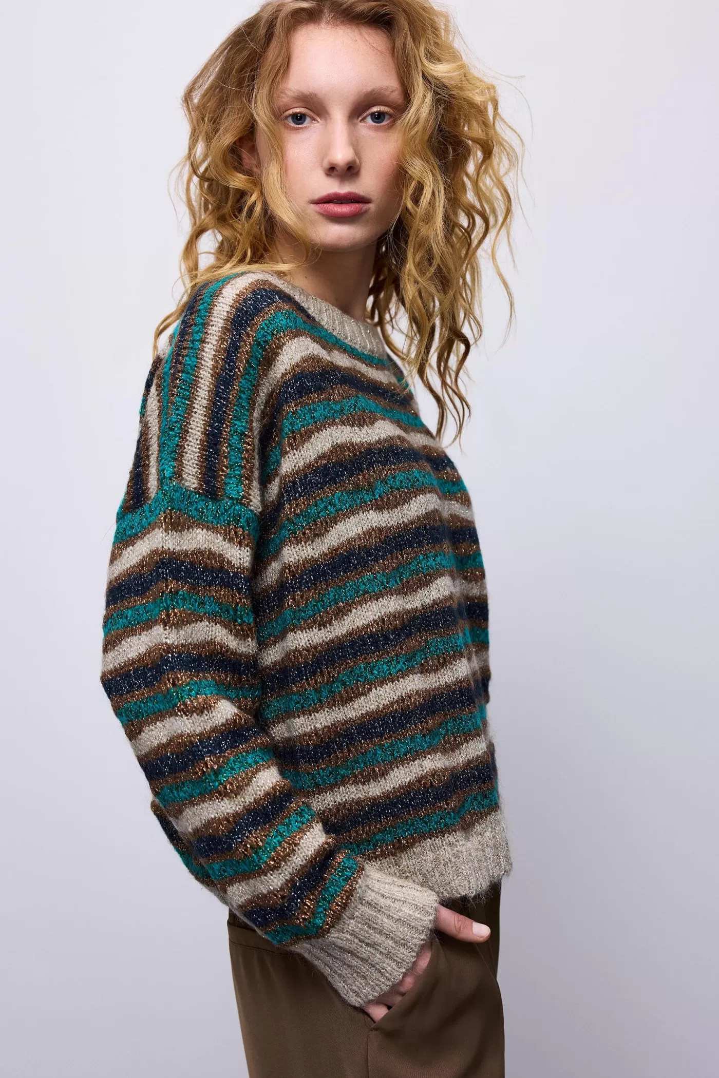 Boxy trui met een ruime ronde hals en ontworpen met meerkleurige, metallic strepen. De trui is gebreid van een lurex en alpaca blend garen. boxy fit ruime ronde hals meerkleurige ingebreide strepen lurex en alpaca blend garen