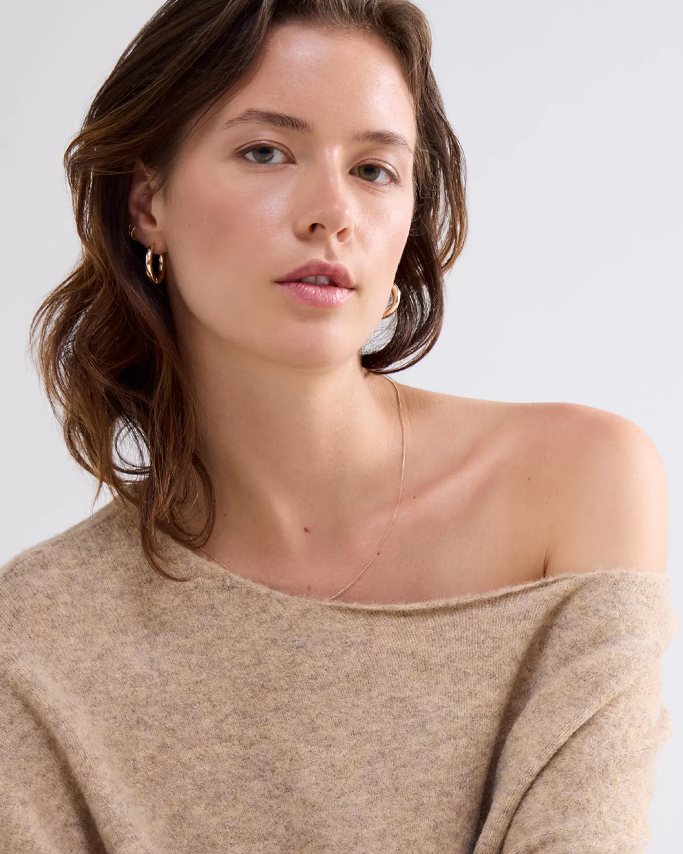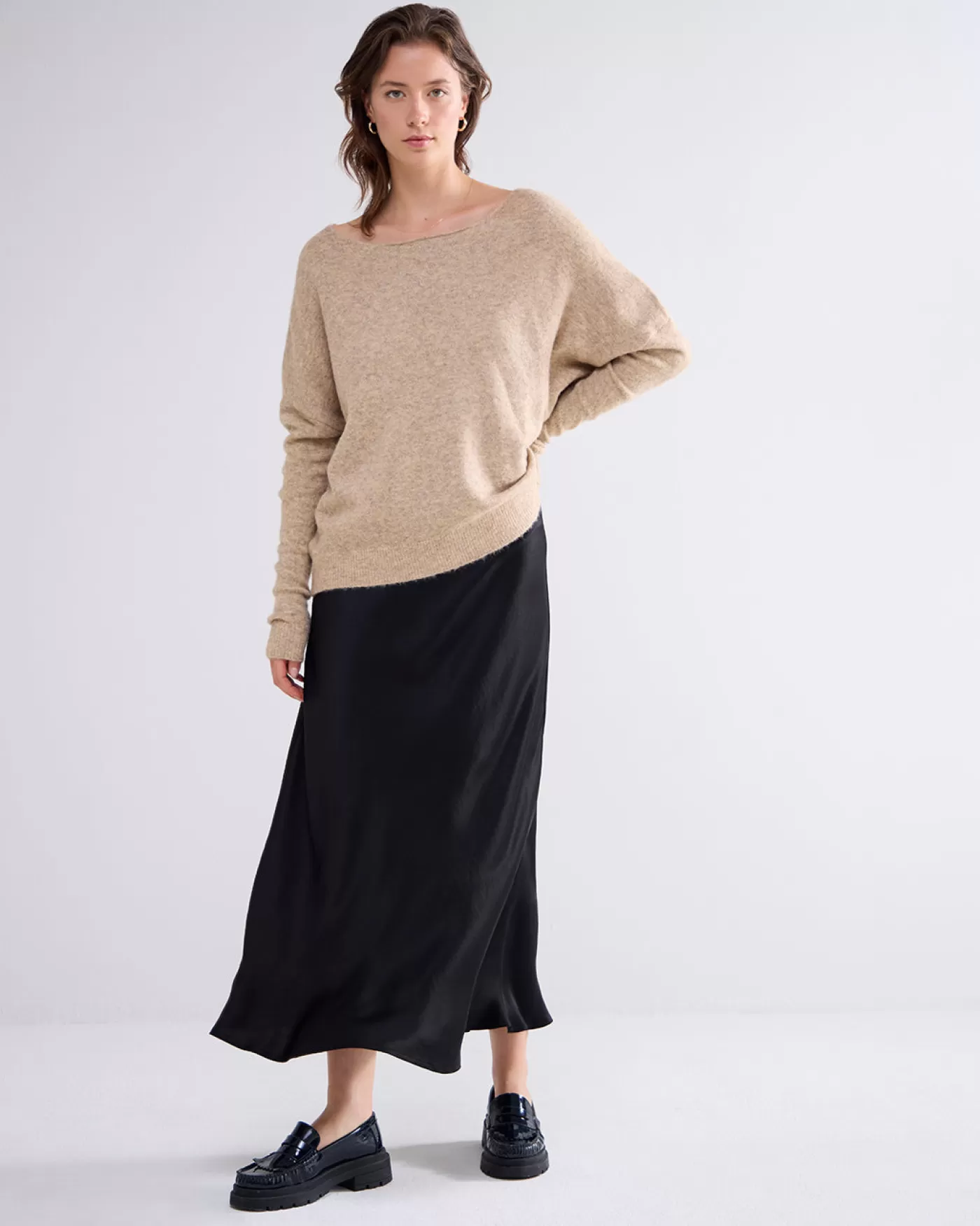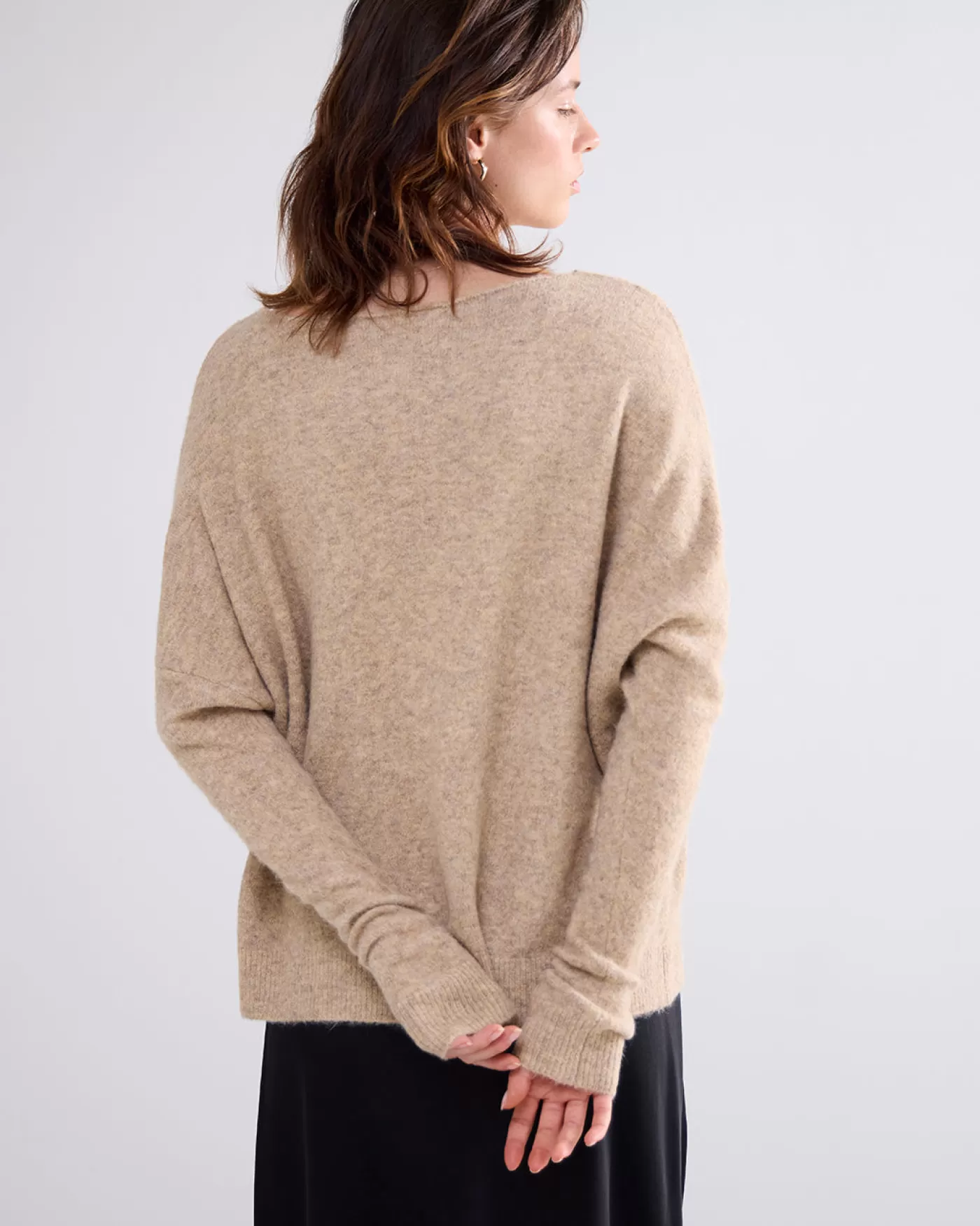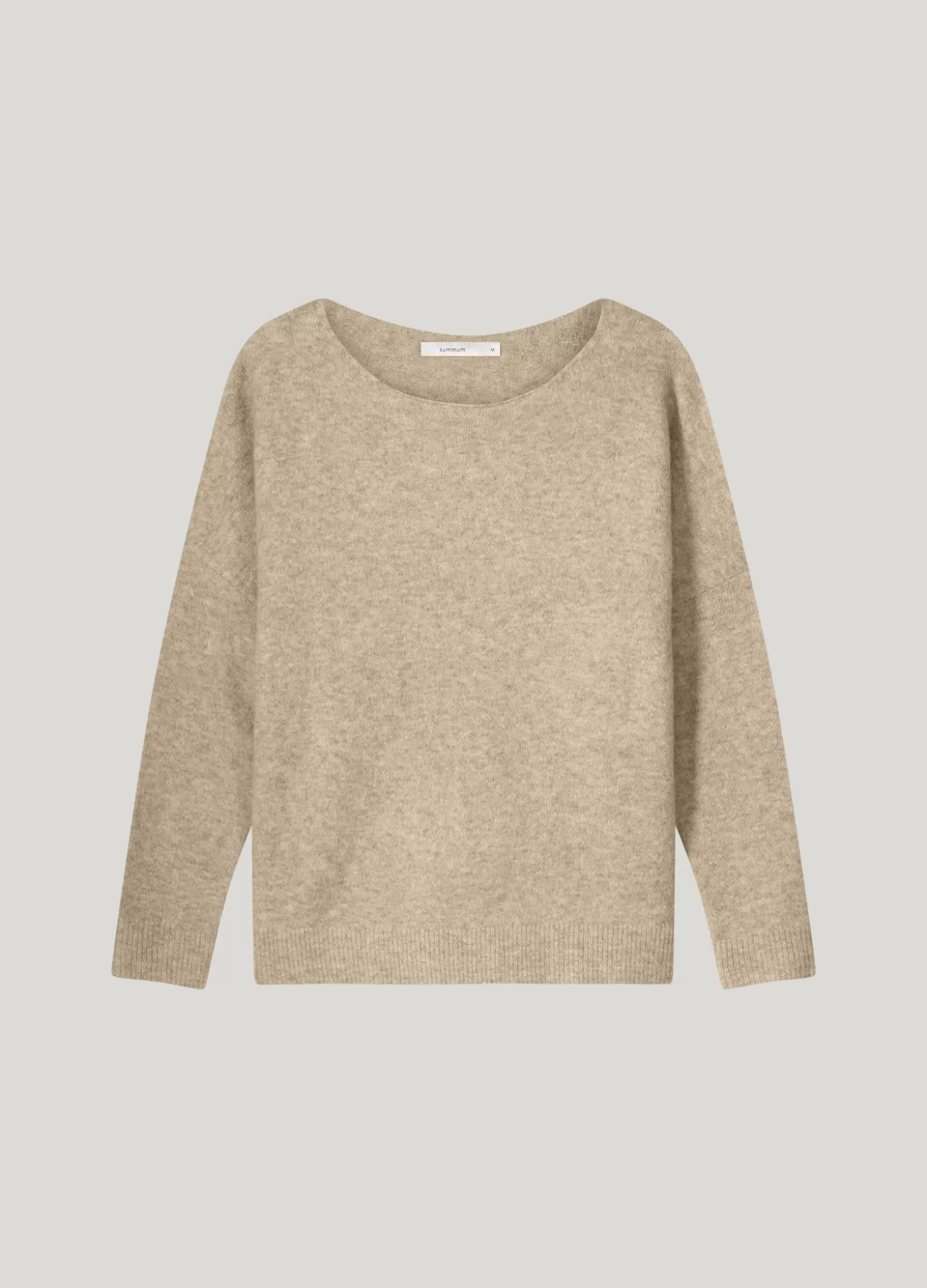 Trui met wijde boothals en ruime fit op de body, gebreid in een gemêleerd garen. De mouwen hebben een normale pasvorm. …