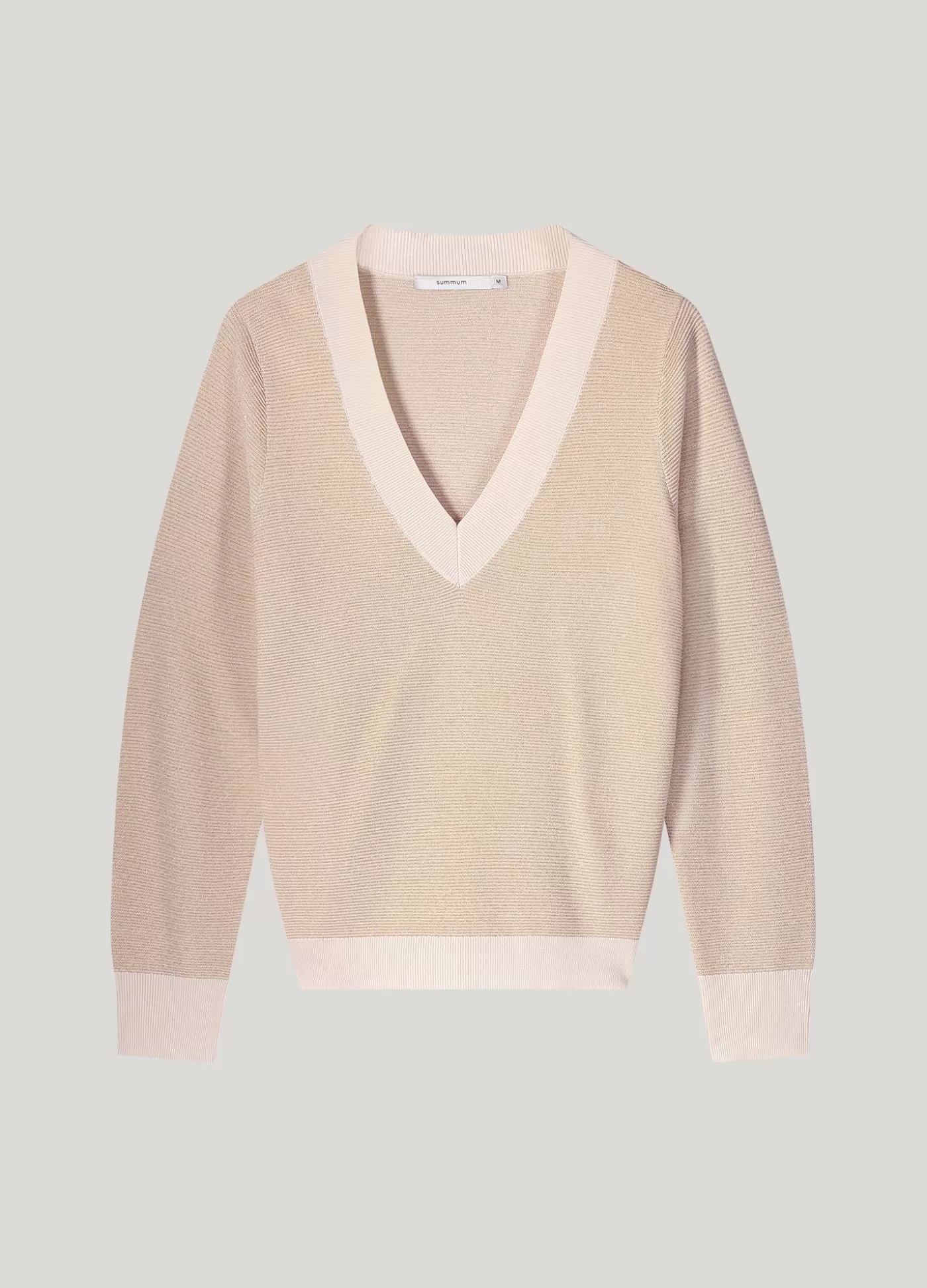 Diepe V-hals sweater, gebreid in een fijne ribbelsteek en verweven met gouden lurex. De trui heeft normale pasvorm. diepe V-hals fijne ribbelsteek gouden lurex ruime pasvorm
