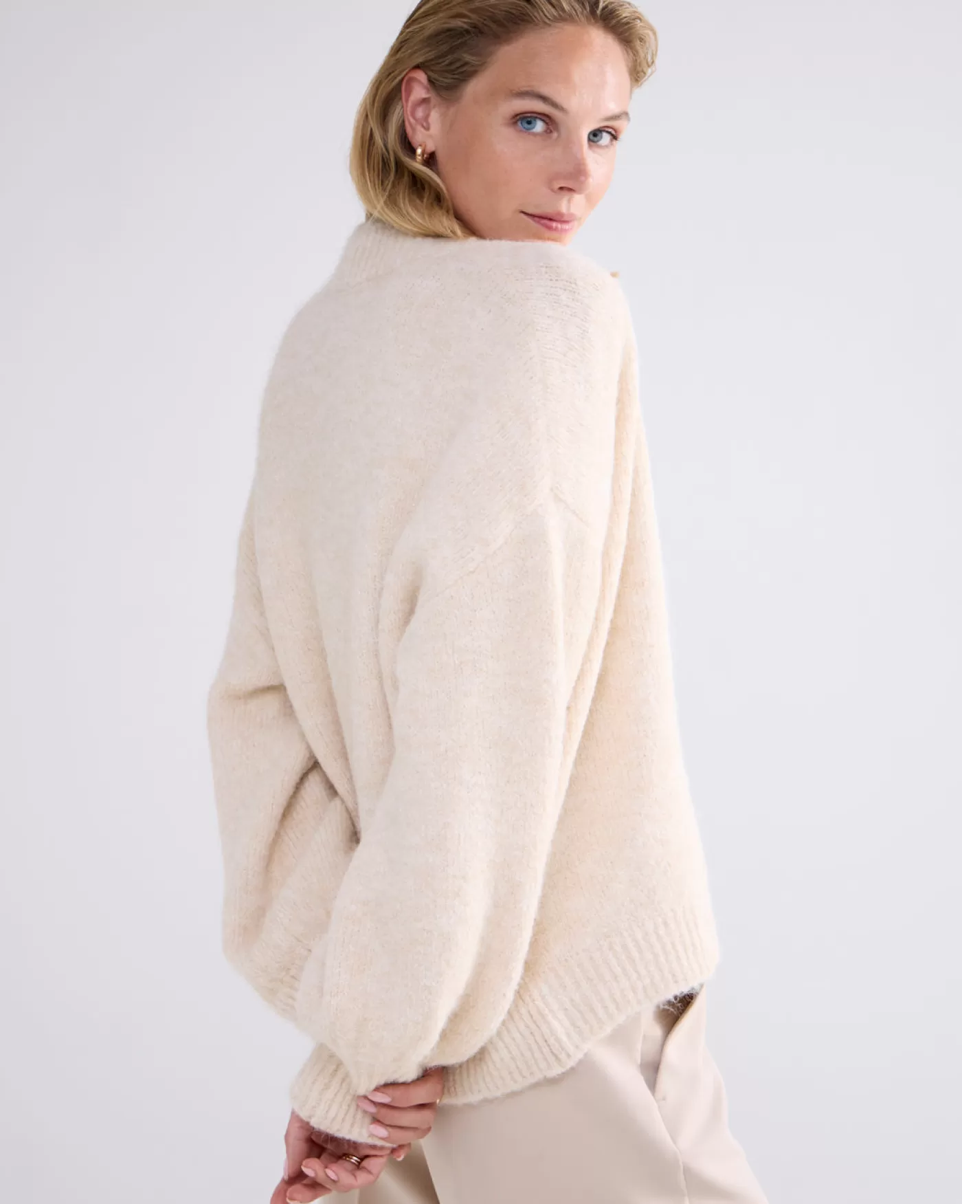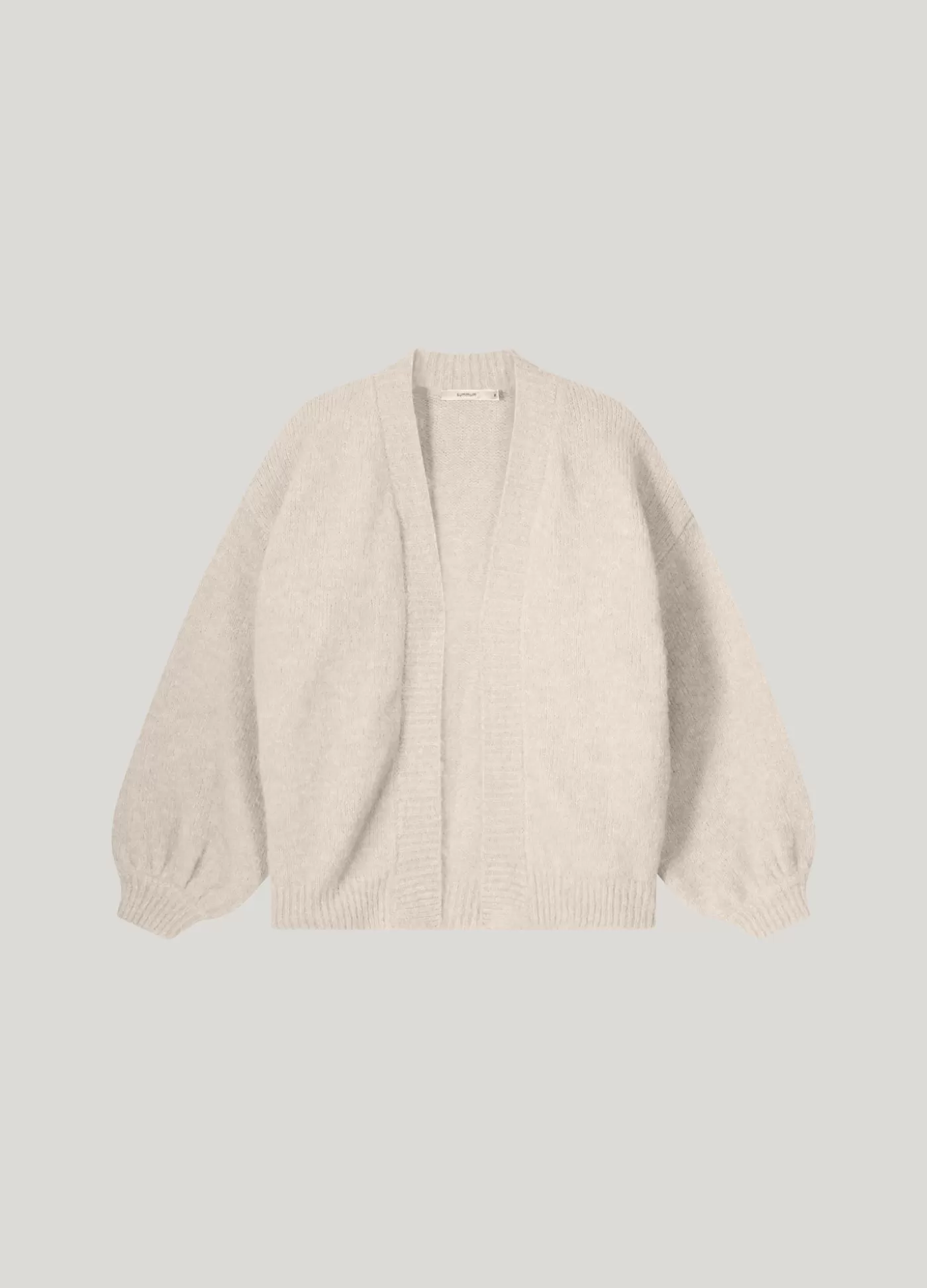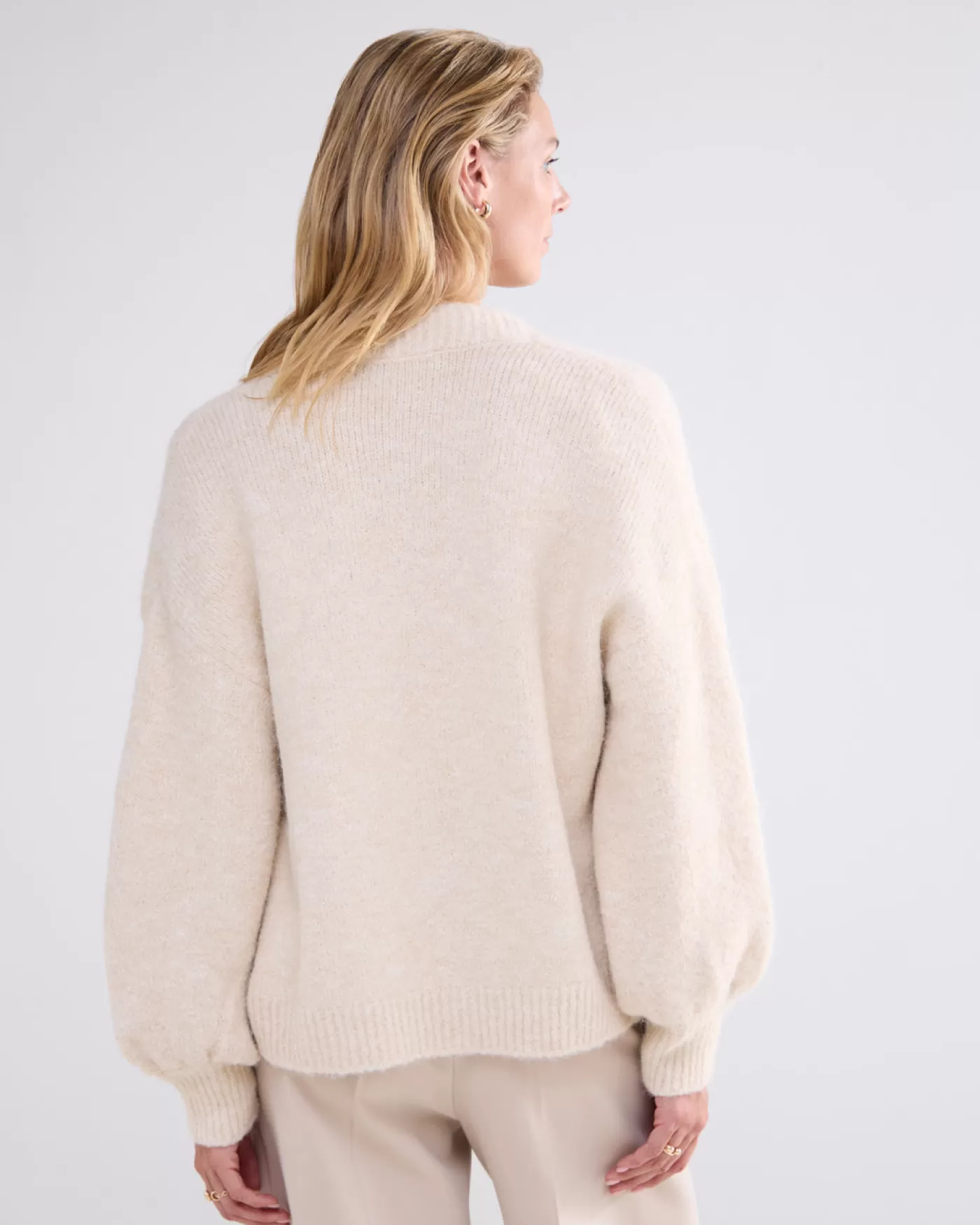 Heerlijk zacht vest zonder sluiting met grote pofmouwen. Het vest heeft brede boorden die ribgebreid zijn uitgevoerd. ge…