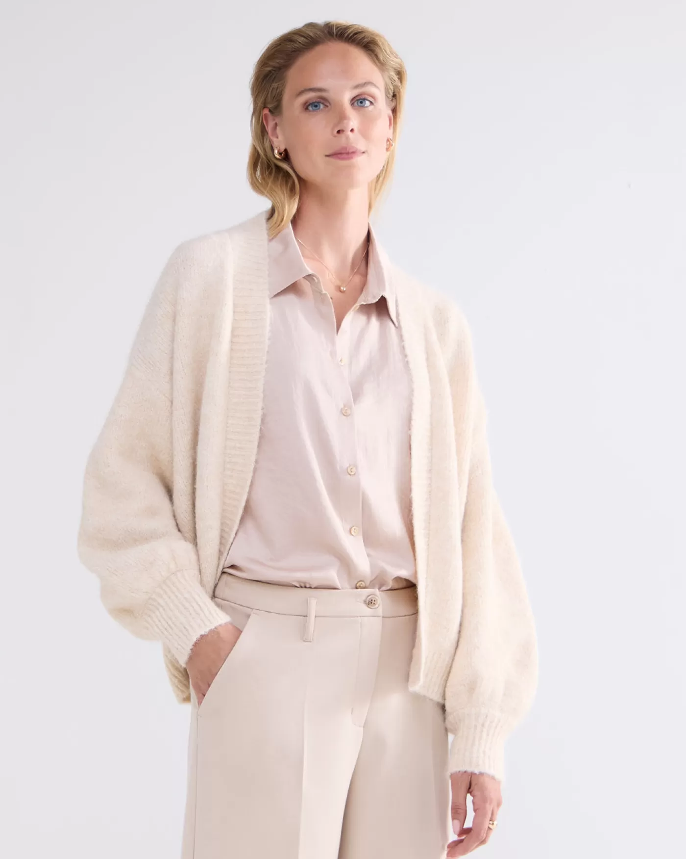 Heerlijk zacht vest zonder sluiting met grote pofmouwen. Het vest heeft brede boorden die ribgebreid zijn uitgevoerd. geen sluiting pofmouwen zachte stof geribde boorden