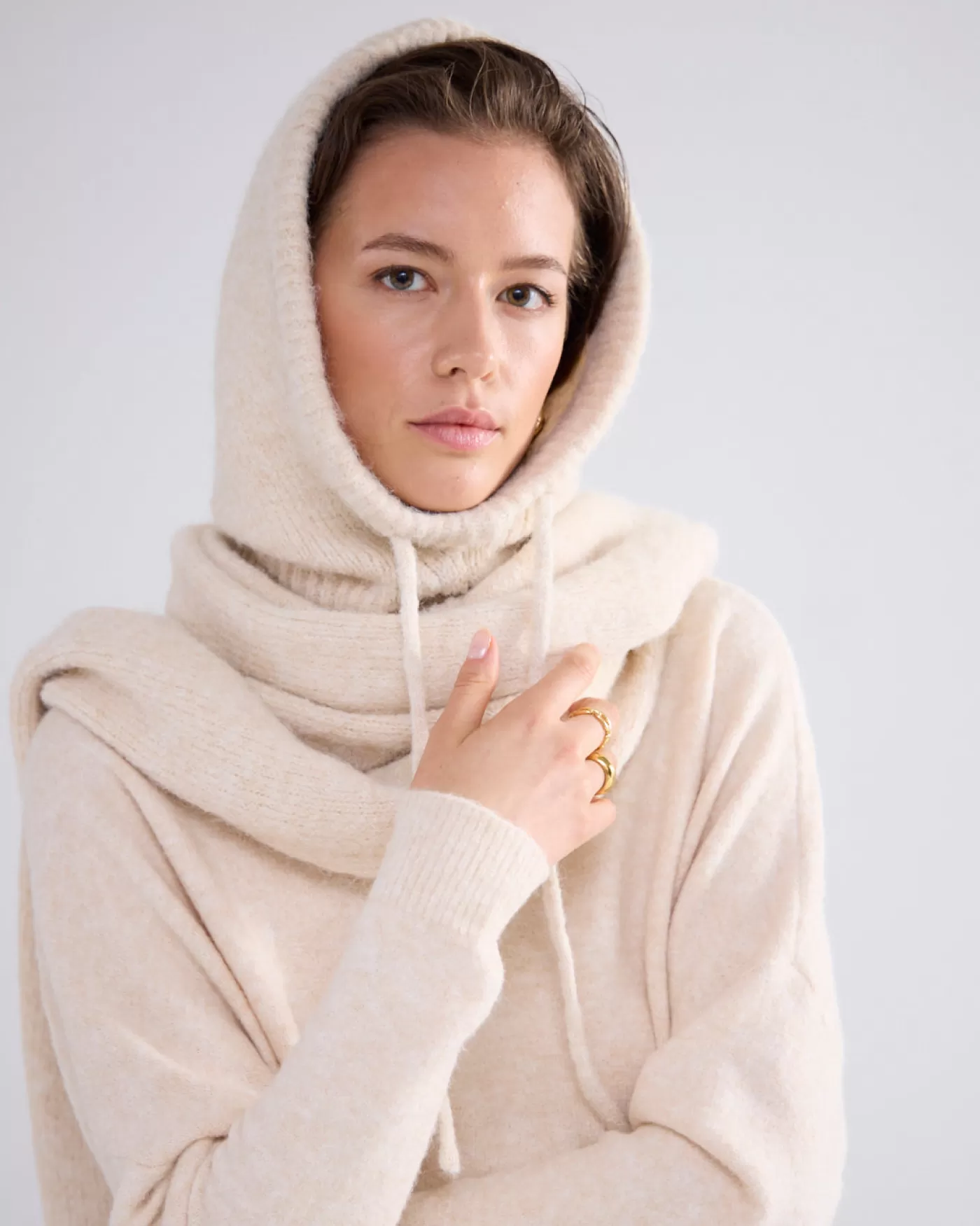 Balaclava muts met koordjes, gebreid in een zacht garen. balaclava stijl koordjes zacht garen