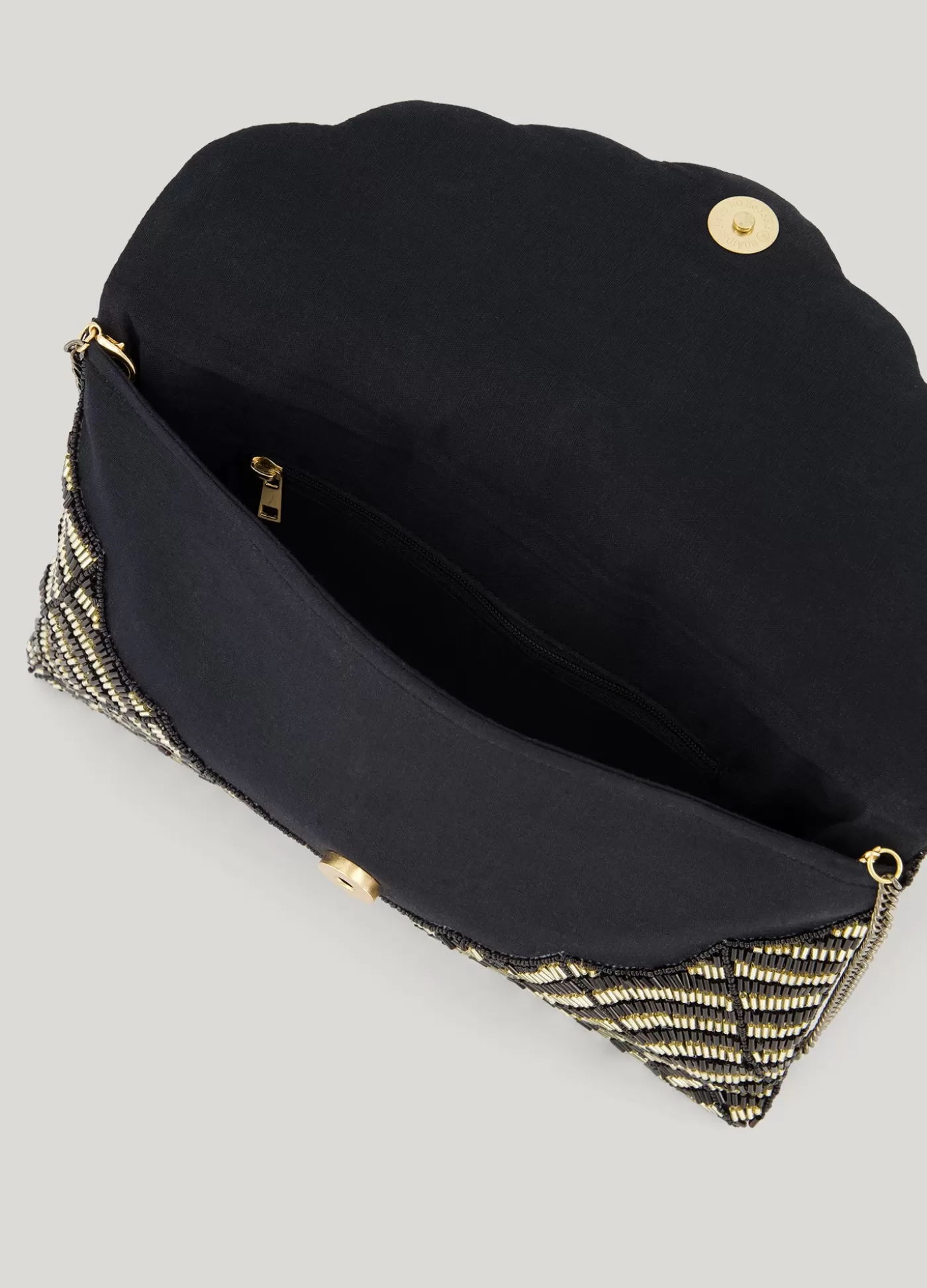 Clutch met 2 kleurige kralen en een schelpvormige klep. Het hengsel is gemaakt van een fijne ketting. 2 kleurige kralen u0026amp; borduurwerk schelpvormige klep ketting