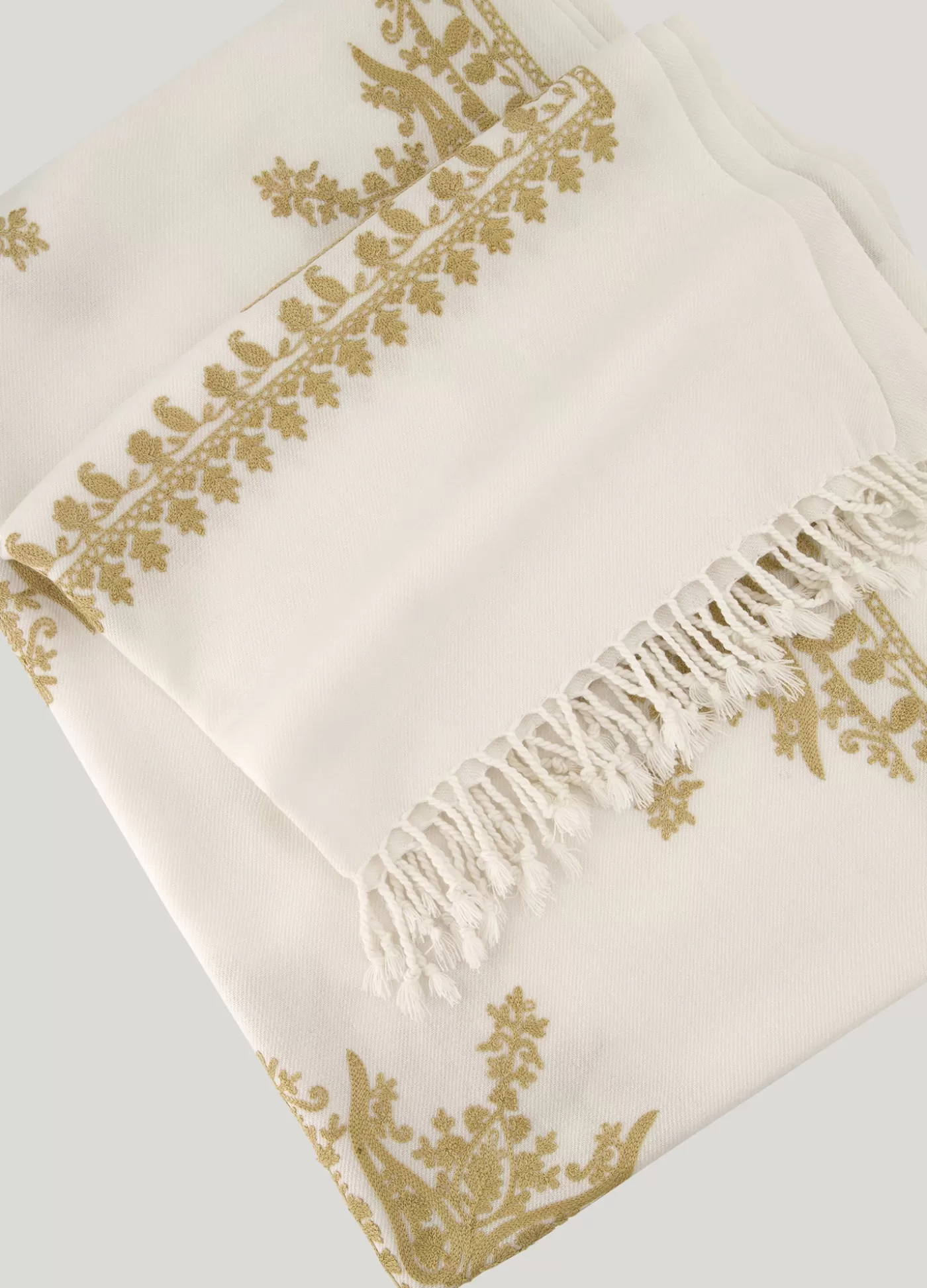 Grote, dunne sjaal versierd met verfijnd goudkleurig borduurwerk en franjes aan de uiteinden. groot goudkleurig borduurwerk franjes