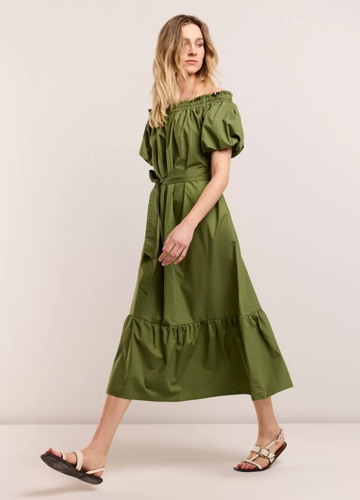 Lange jurk met korte pofmouwtjes, die door de gesmokte halslijn off-shoulder draagbaar is.