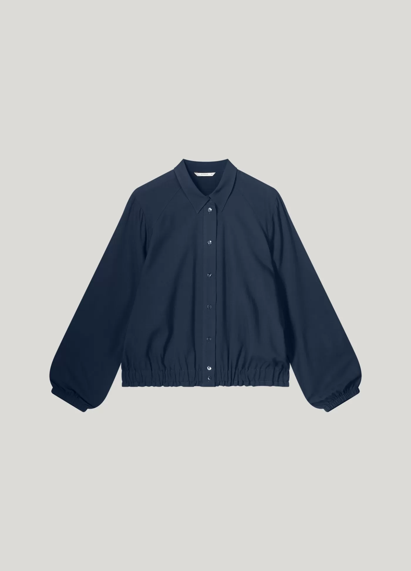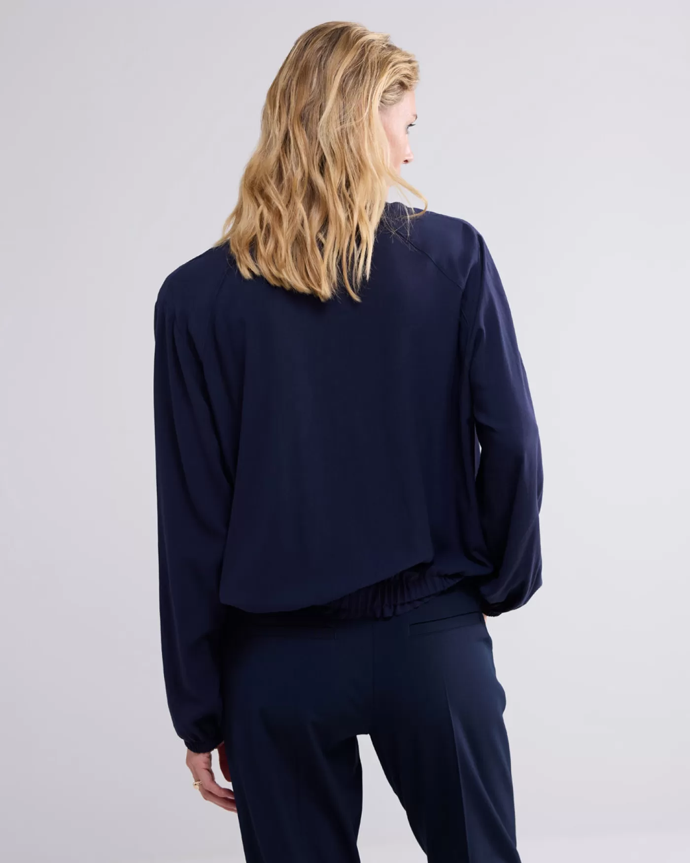 Blouse met elastische zoom, waardoor een bloezend bomber-effect ontstaat. De blouse heeft lange pofmouwen, knoopsluiting en overhemdkraag. bomberfit lange mouwen overhemdkraag pofmouwen