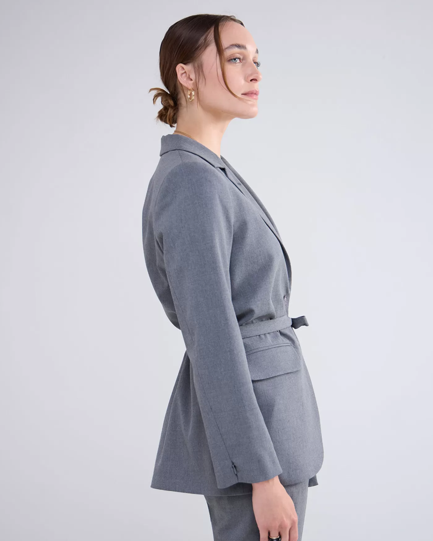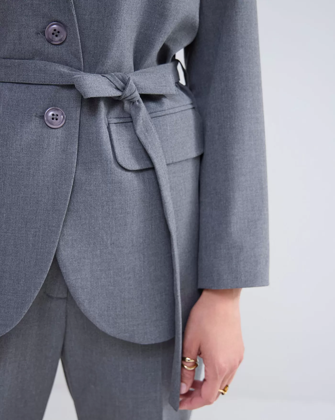 Stoere boyfriend blazer met reverskraag en stoffen ceintuur in de taille. De blazer heeft paspelzakken met klep en een blinde rits aan de buitenkant van de mouw. reverskraag stoffen ceintuur paspelzak met klep blinde rits in mouw