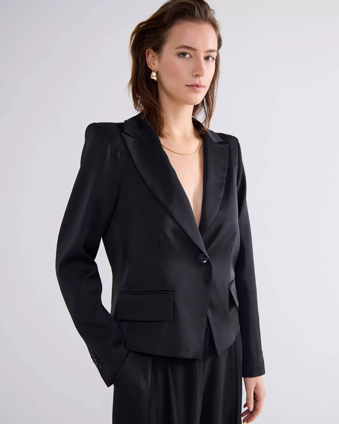Getailleerde blazer met een enkele knoopsluiting en subtiele accenten op de schouders. Het jasje is voorzien van een klassieke reverskraag en paspelzakken met klep. Slank gesneden Enkele knoopsluiting Accent op de schouders Paspelzak met klep