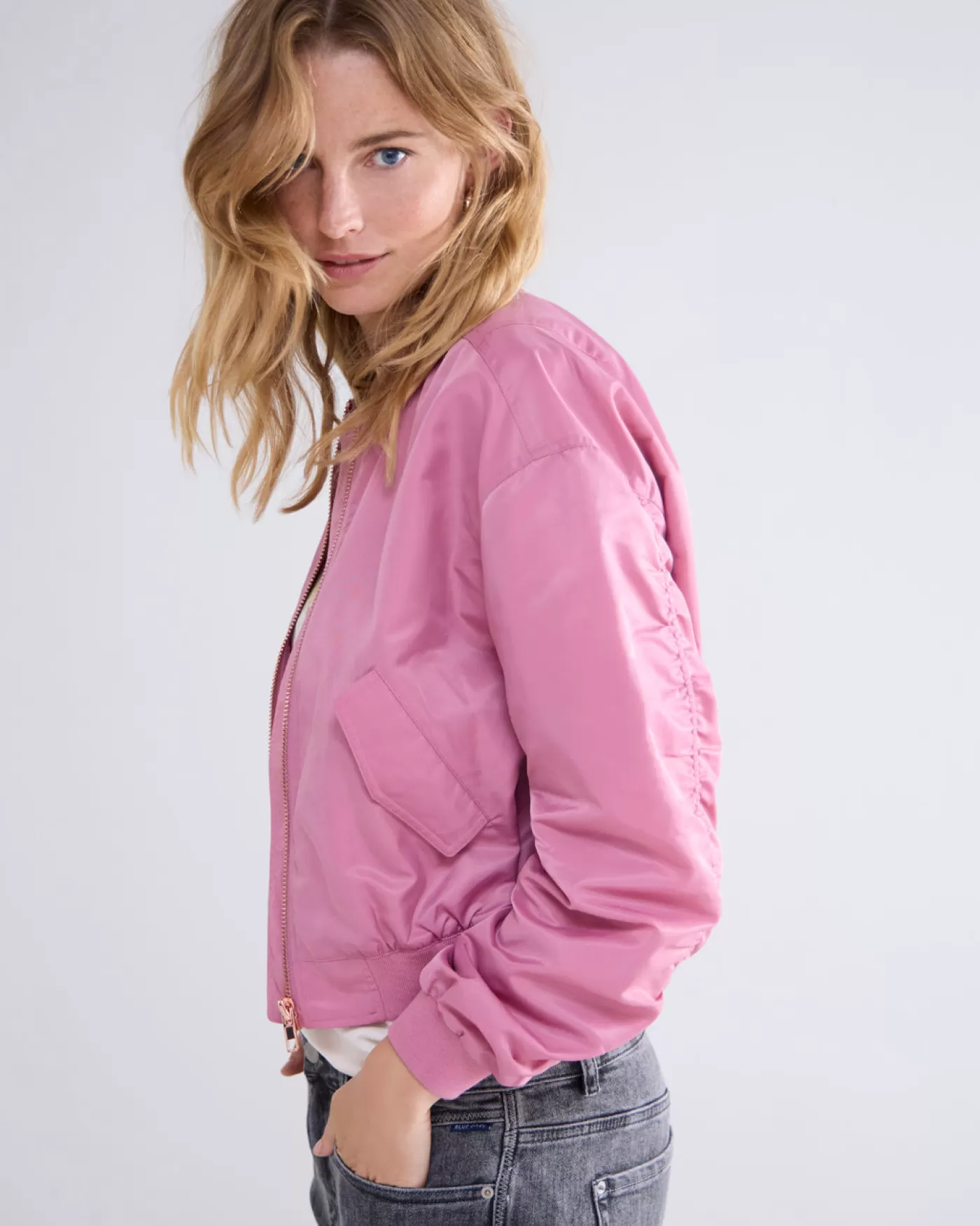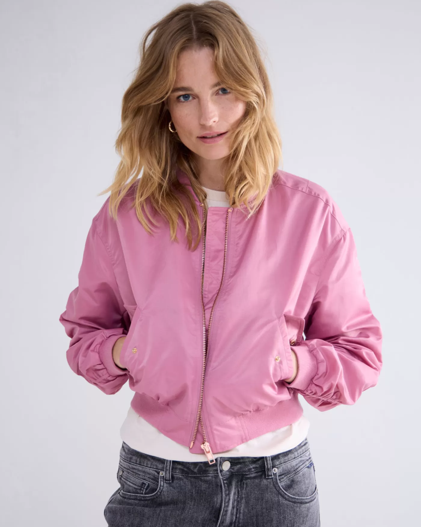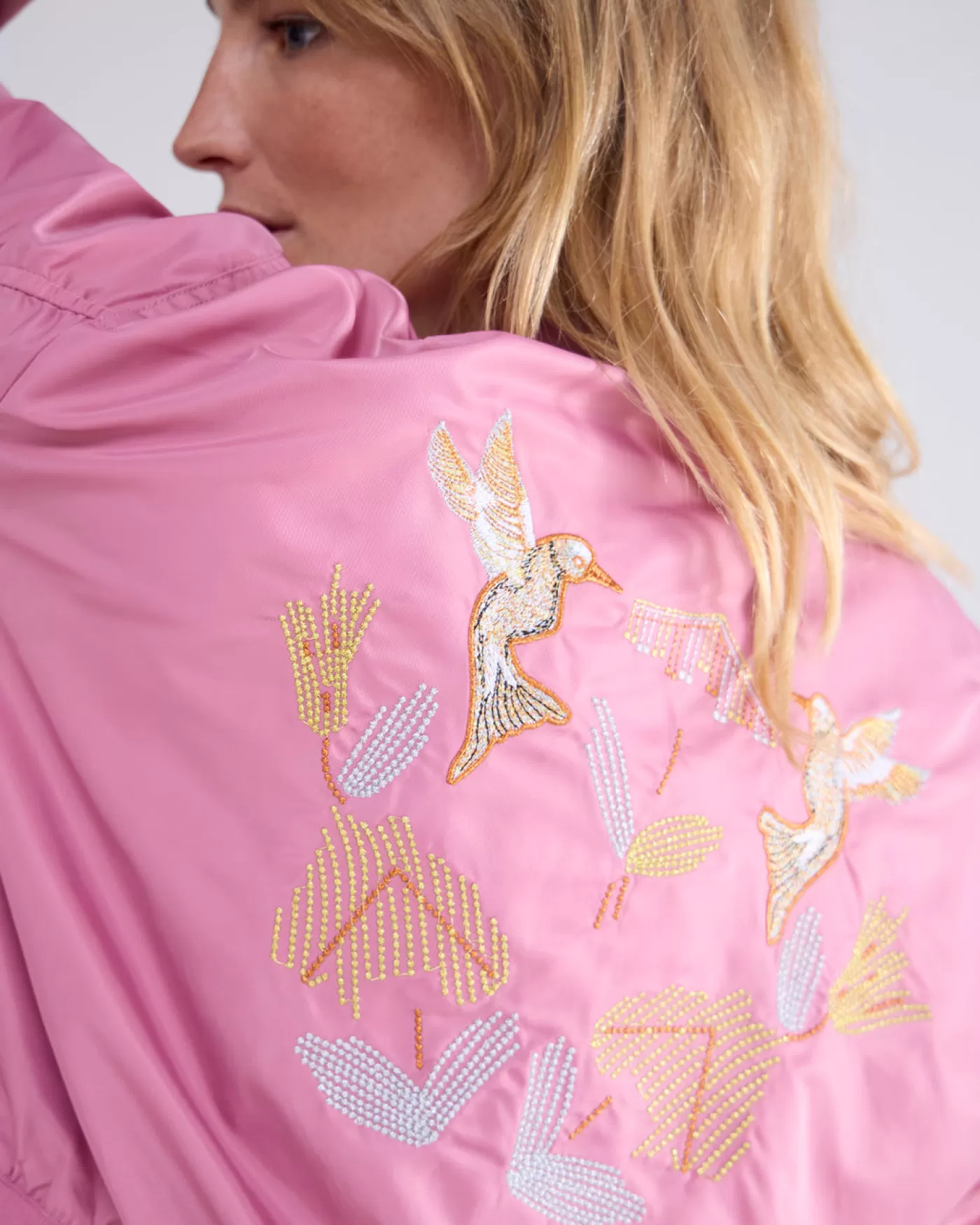 Gewatteerde bomber gemaakt van een glanzende geweven stof in antiekroze. Een borduurwerk met kolibries siert het achterp…