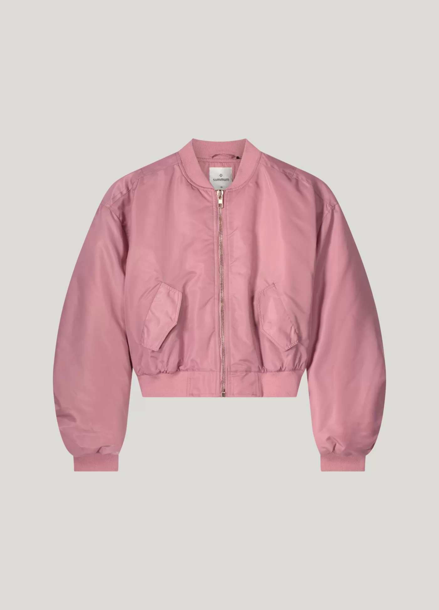 Gewatteerde bomber gemaakt van een glanzende geweven stof in antiekroze. Een borduurwerk met kolibries siert het achterpand. steekzakjes met klep ritssluiting geribde boorden bies op de mouw