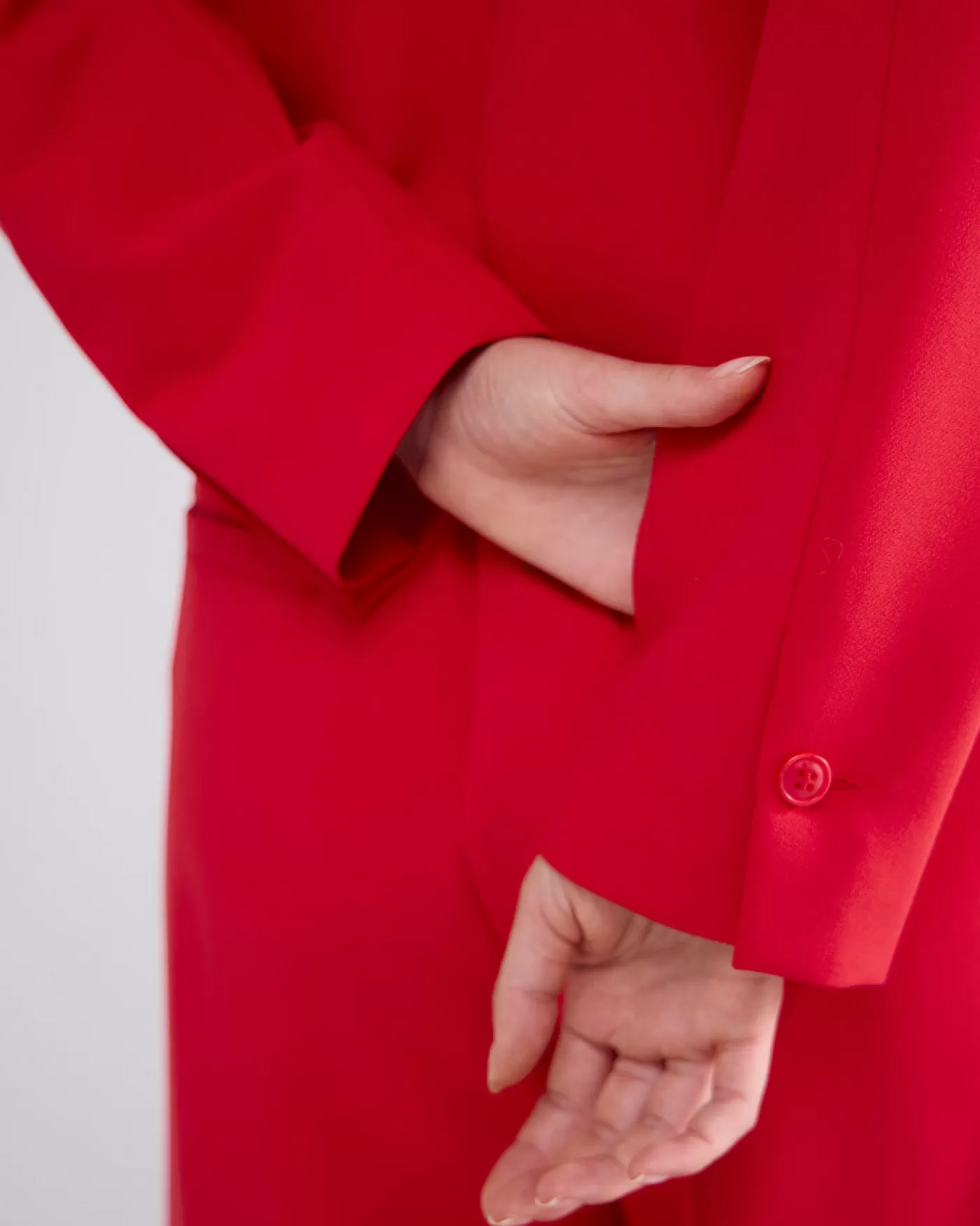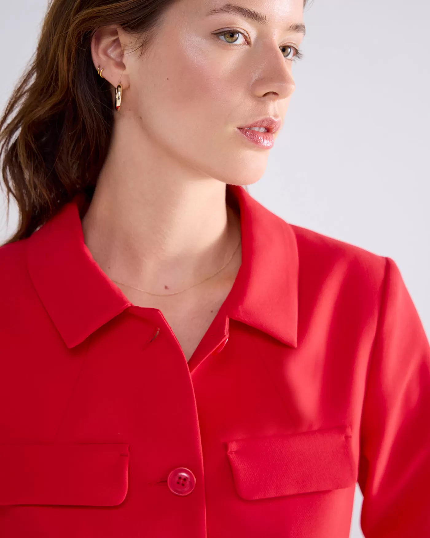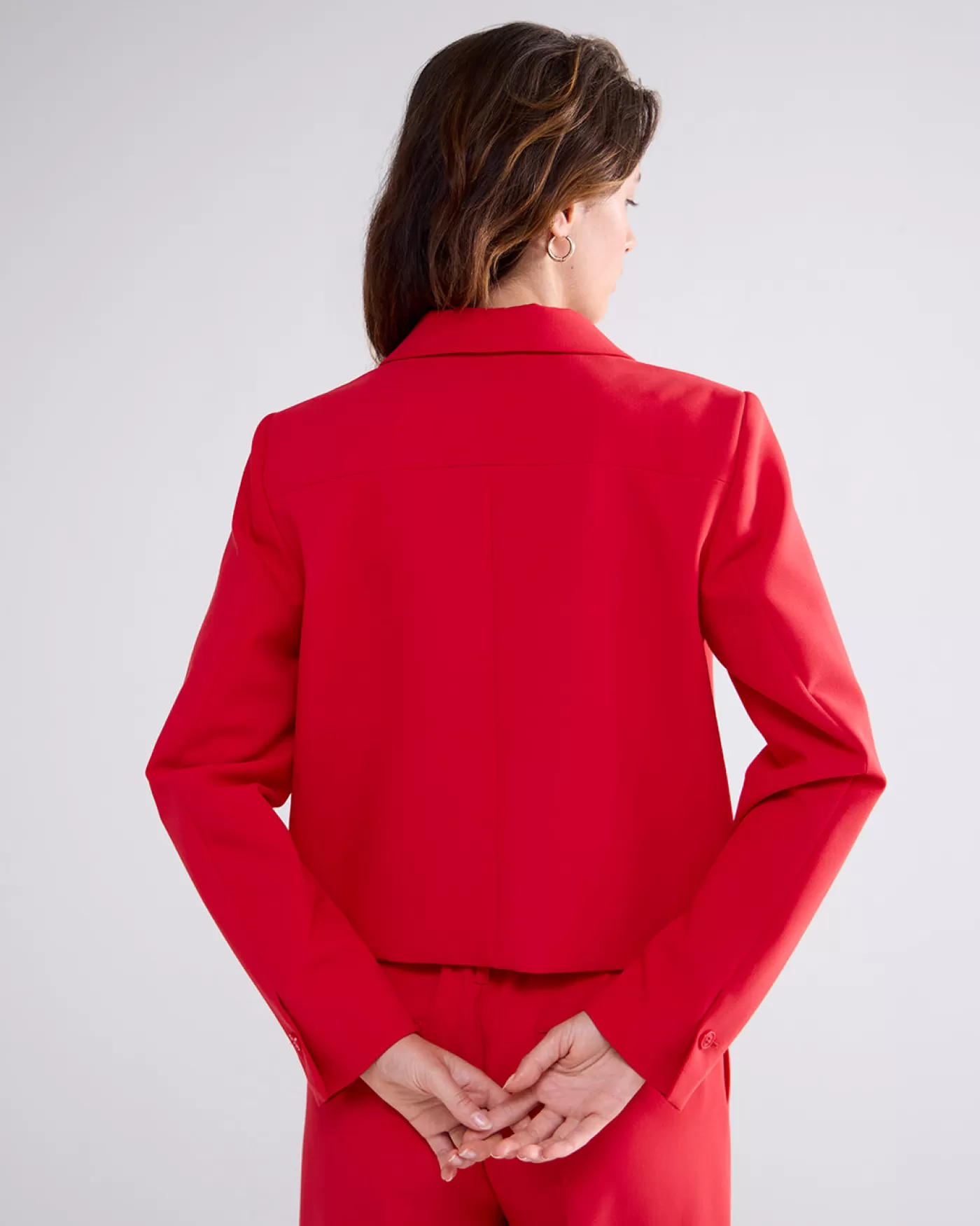 Kort jasje met een rechte pasvorm en een blousekraag. De jas heeft klepjes zonder zak en een knoopsluiting. korte fit klepjes voor knoopsluiting blouse kraagje