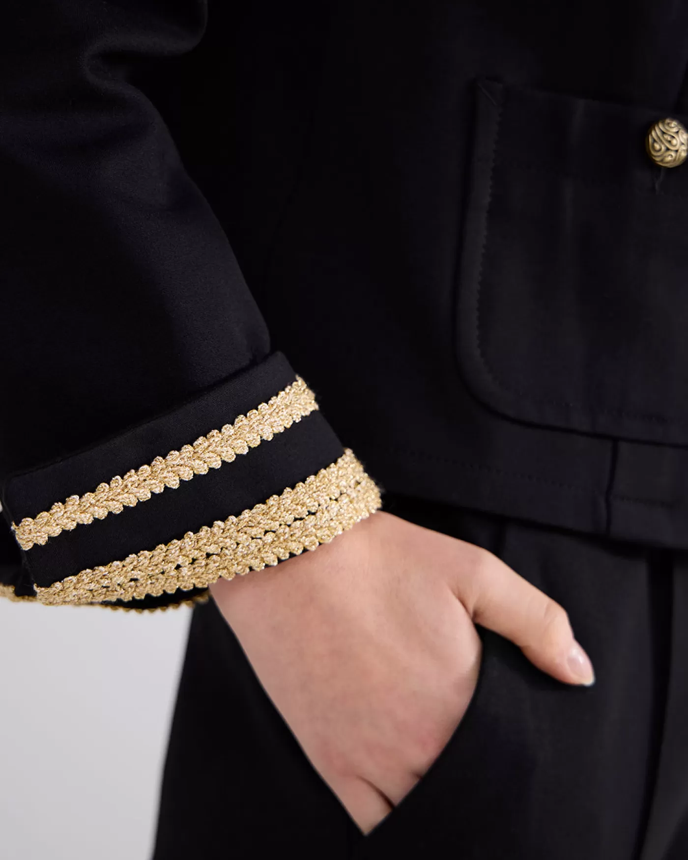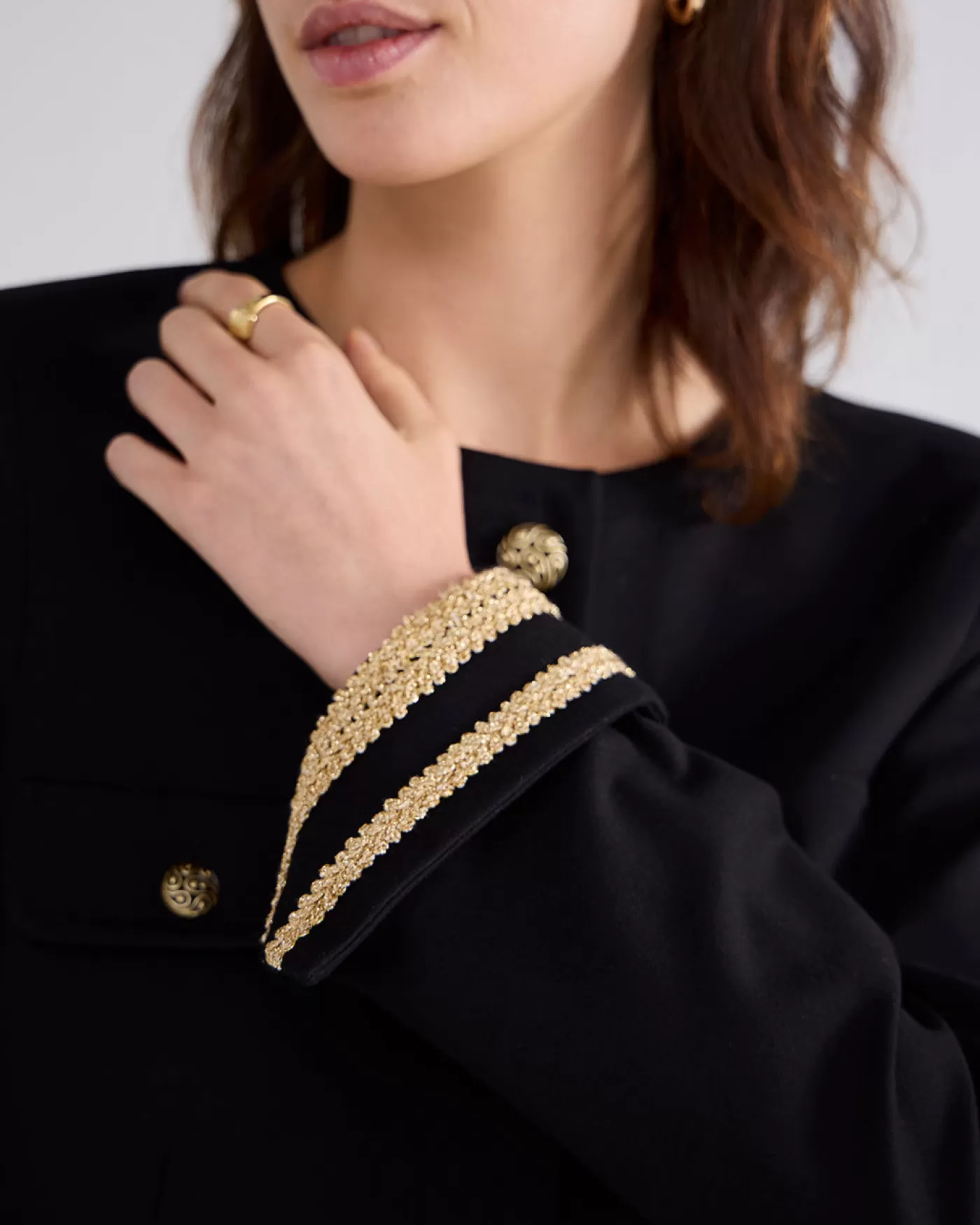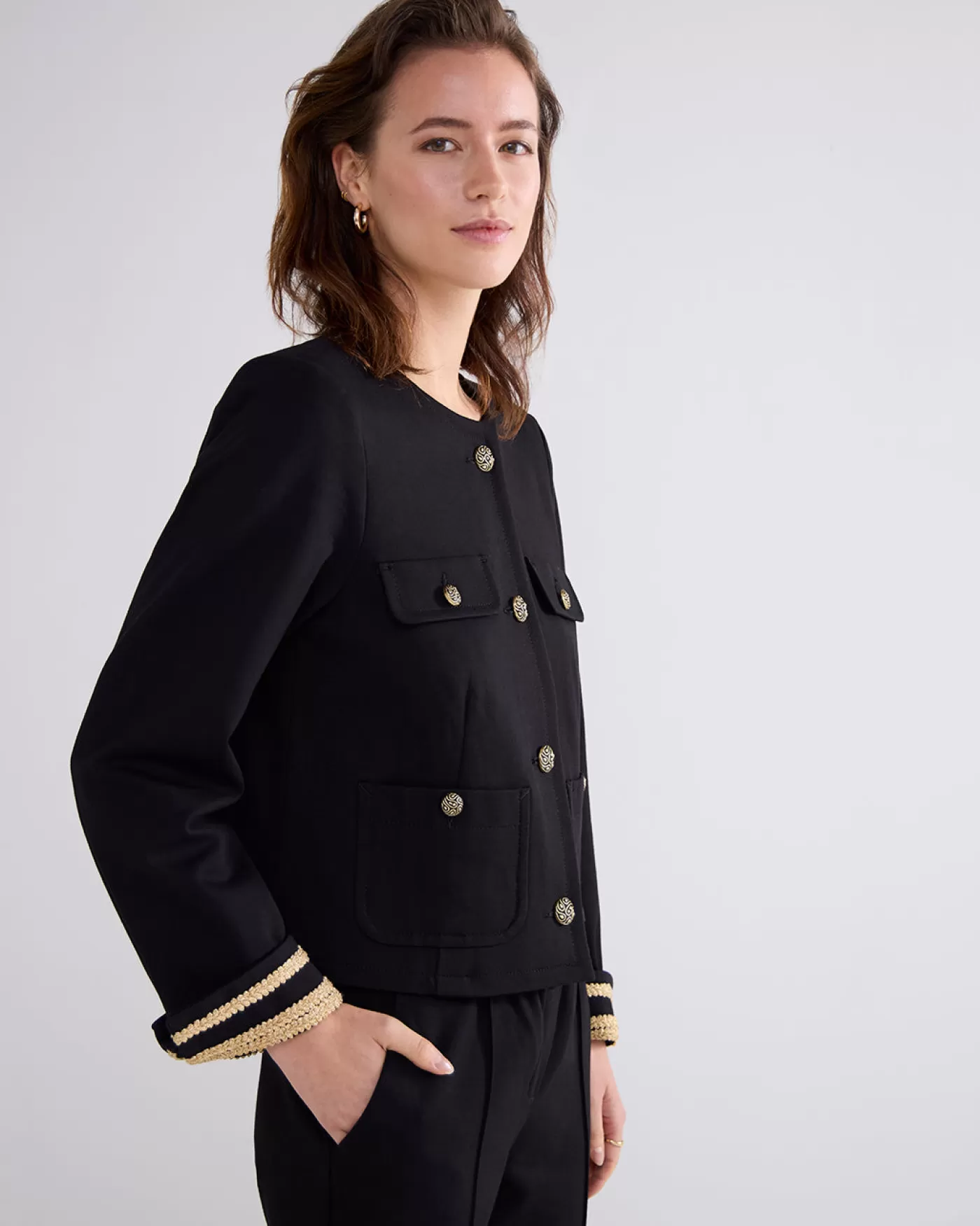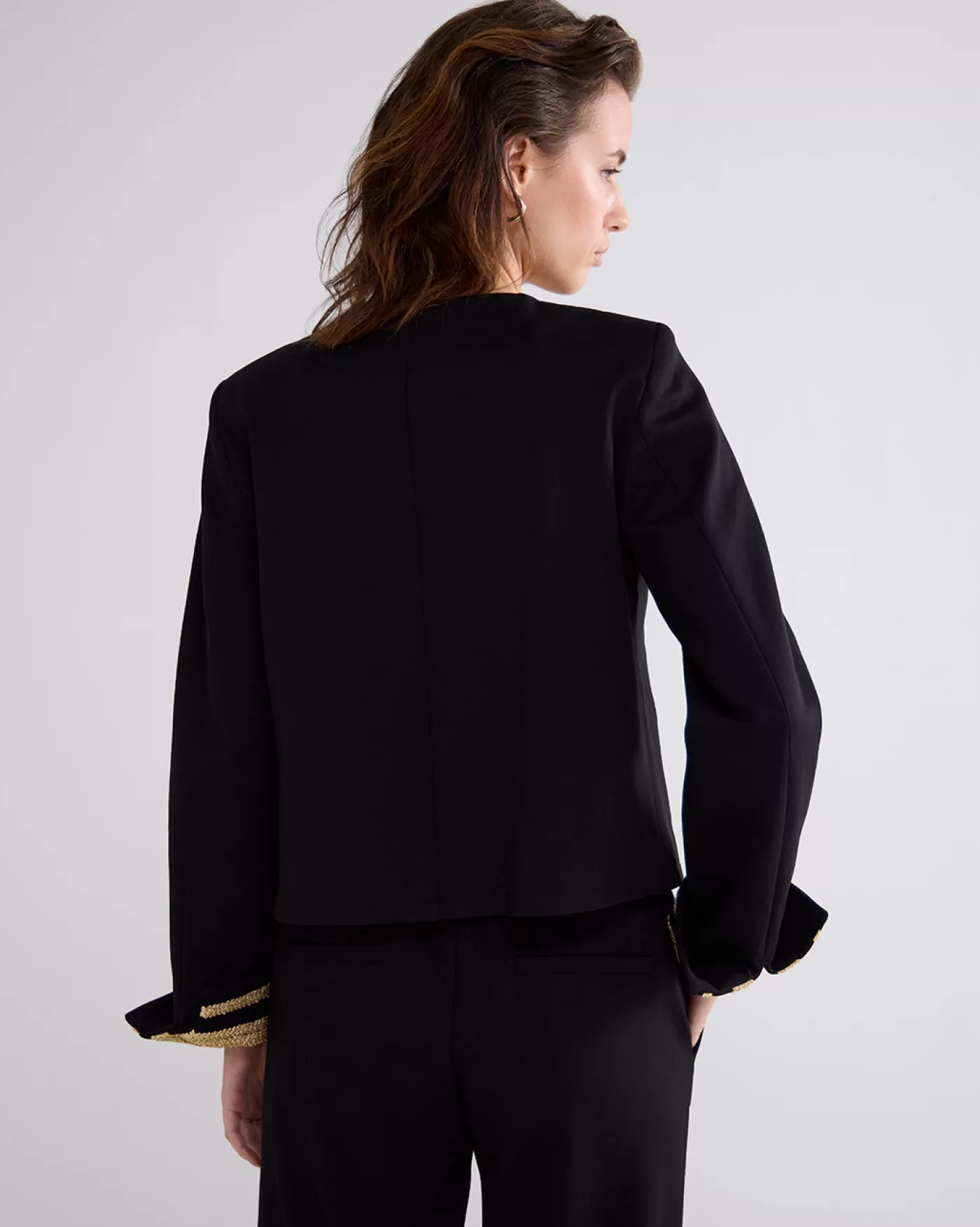Jasje met ronde hals en gouden accenten in de knopen en manchetten. Het jasje heeft een ronde hals, rechte snit en decor…